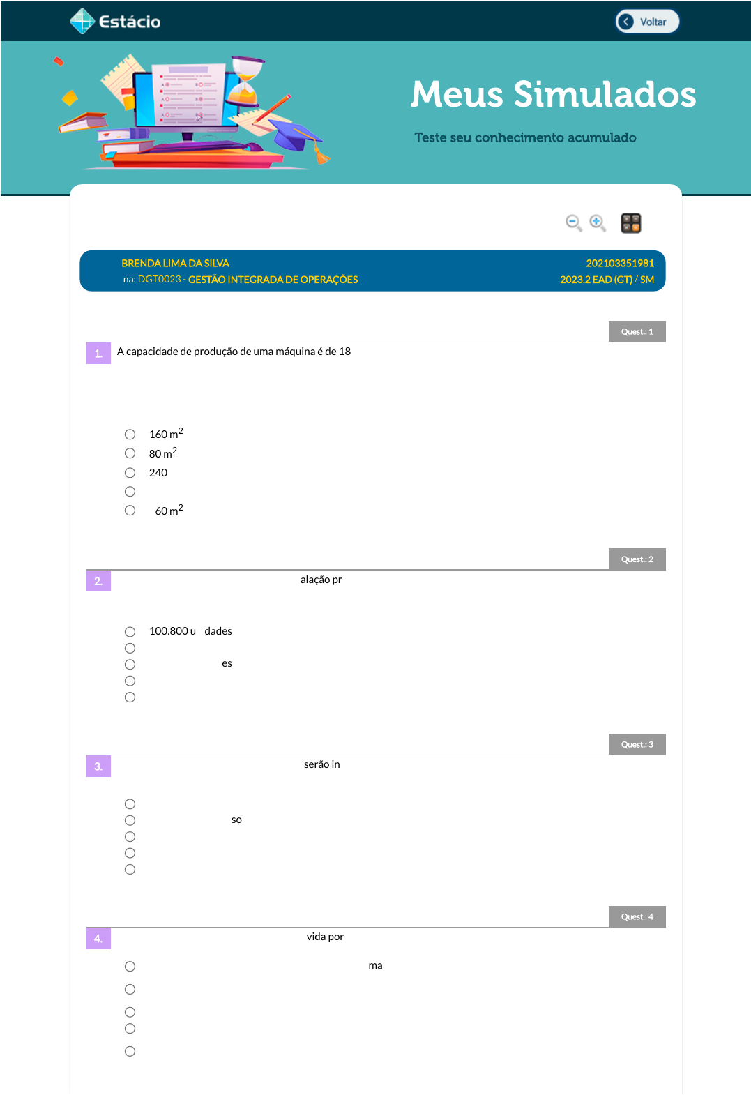 Meus Simulados Teste seu conhecimento acumulado Quest.: 1 A capacidade de produção de uma máquina é de 18.000 unidades por semana. A demanda atual (D+0) é de 12.000 unidades por semana e, para o planejamento da nova Instalação Produtiva, a empresa decidiu efetuar um investimento na nova instalação, prevendo uma demanda crescente a uma taxa de 6 % ao ano. Sabe-se que a área de operação dessa máquina é de 80 m2. Qual deverá ser a área considerada para a instalação das máquinas necessárias para suprirem a demanda dos próximos 10 anos (D+10)? Quest.: 2 Uma das linhas de produção de uma instalação produtiva foi dimensionada para operar com 80% de sua capacidade instalada. Sabendo-se que a linha produz 10 unidades por minuto, o volume máximo de produção semanal planejado é de: Quest.: 3 Corresponde à de�nição dos locais onde serão instalados os recursos produtivos (máquinas, equipamentos e estações de trabalho) dentro de uma planta: Quest.: 4 Com relação à Metodologia SLP desenvolvida por Murther (1978), é INCORRETO a�rmar que: Lupa Calc. Aluno: BRENDA LIMA DA SILVA Matr.: 202103351981 Disciplina: DGT0023 - GESTÃO INTEGRADA DE OPERAÇÕES Período: 2023.2 EAD (GT) / SM 1. 160 m2 80 m2 240 m2 120 m2 360 m2 2. 100.800 unidades 72.520 unidades 120.832 unidades 80.640 unidades 135.722 unidades 3. Planejamento de Localização. Projeto do Processo. Projeto de Layout. Projeto do Produto. Projeto do Trabalho. 4. O método levava em consideração dados e informações sobre produtos e quantidades. A metodologia não deixava de levar em consideração as possíveis restrições existentes no que se refere às edi�cações a serem utilizadas no projeto. Os inter-relacionamentos entre as Unidades de Espaço eram considerados em sua metodologia. O desenvolvimento de alternativas de layouts faz parte da Metodologia SLP. As questões referentes às alterações de volumes de produção possíveis não eram consideradas em sua metodologia. javascript:voltar(); javascript:alert('Quest%C3%A3o com o c%C3%B3digo de refer%C3%AAncia 202109410194.') javascript:alert('Quest%C3%A3o com o c%C3%B3digo de refer%C3%AAncia 202107509477.') javascript:alert('Quest%C3%A3o com o c%C3%B3digo de refer%C3%AAncia 202107503615.') javascript:alert('Quest%C3%A3o com o c%C3%B3digo de refer%C3%AAncia 202107503618.') javascript:diminui(); javascript:aumenta(); javascript:calculadora_on(); Quest.: 5 O MRP surgiu da necessidade em se planejar materiais de demanda: Quest.: 6 Com relação as a�rmativas abaixo, assinale a opção VERDADEIRA: I - Na produção enxuta, a movimentação de pessoas e o transporte de materiais são considerados desperdícios. II - Na produção enxuta, as inspeções de produtos são considerados desperdícios. III - Na produção enxuta, processamentos inadequados são considerados desperdícios. Quest.: 7 Assinale a alternativa que de�ne, de maneira incorreta, uma das possíveis disposições planejadas para os produtos ou serviços: Quest.: 8 Os séculos XIX e XX foram momentos de muito avanço para a gestão de operações. Uma dessas evoluções foi reconhecer a importância do(a): Quest.: 9 São Políticas Alternativas de Capacidade, EXCETO: Quest.: 10 Os aspectos relativos à Avaliação Econômica das Alternativas de Alteração de Capacidade envolvem a relação: 5. Independente Intermitente Dependente Cíclicas Aleatórias 6. Apenas as a�rmativas II e III estão corretas Todas as a�rmativas estão corretas Apenas as a�rmativas I e II estão corretas Apenas a a�rmativa I está correta Apenas as a�rmativas I e III estão corretas 7. Produto/serviço reprovado - quando o produto/serviço não conforme deverá ser descartado. Produto/serviço aprovado - quando o produto/serviço atende às especi�cações de�nidas. Produto/serviço aceito sob concessão - quando a aprovação do produto/serviço é feita de forma rápida. Produto/serviço retrabalhado - quando o produto/serviço não conforme permite ser retrabalhado para alcançar as especi�cações de�nidas. Produto/serviço reclassi�cado - quando o produto/serviço não conforme permite ser reclassi�cado para outra aplicação ou outro uso em um nível inferior de qualidade. 8. Varejo. Gestão de RH. Armazém. Cadeia de suprimentos. Shopping center. 9. Capacidade constante Gestão da demanda Acompanhamento da demanda Aumento da demanda Mistas 10. Ponto de Equilíbrio x Lucro Quantidade a produzir x Lucro Volume x Variedade Custos x Lucros Custos Fixos x Custos Variáveis javascript:alert('Quest%C3%A3o com o c%C3%B3digo de refer%C3%AAncia 202108513204.') javascript:alert('Quest%C3%A3o com o c%C3%B3digo de refer%C3%AAncia 202108811120.') javascript:alert('Quest%C3%A3o com o c%C3%B3digo de refer%C3%AAncia 202107378787.') javascript:alert('Quest%C3%A3o com o c%C3%B3digo de refer%C3%AAncia 202111205507.') javascript:alert('Quest%C3%A3o com o c%C3%B3digo de refer%C3%AAncia 202108513199.') javascript:alert('Quest%C3%A3o com o c%C3%B3digo de refer%C3%AAncia 202108513201.') Não Respondida Não Gravada Gravada