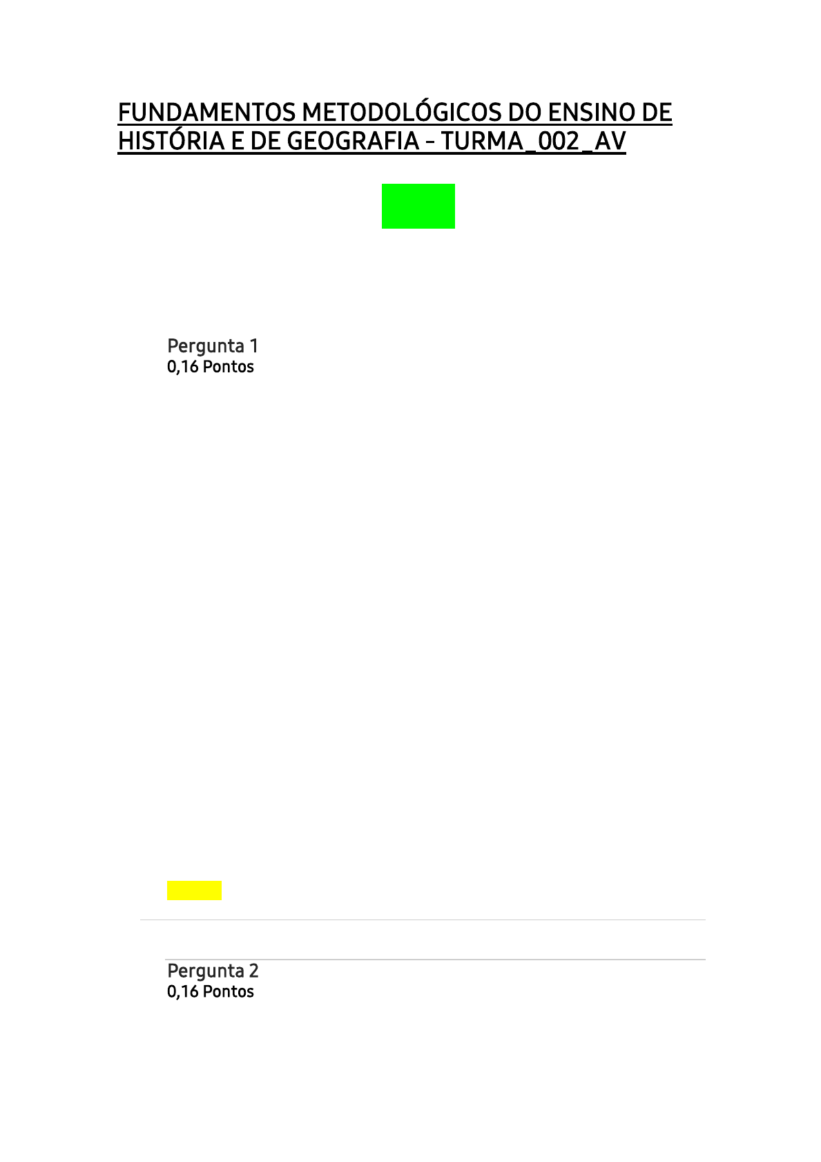 FUNDAMENTOS METODOLÓGICOS DO ENSINO DE HISTÓRIA E DE GEOGRAFIA - TURMA_002_AV AS – Unidade I - 0,64 /0,64 Conteúdo do teste 1. Pergunta 1 0,16 Pontos Henri Lefebvre abre a obra com questões relativas à teoria do conhecimento. Trata a conceituação do conhecimento como fato, que se realiza desde a vida prática mais imediata e simples, através do conhecimento dos objetos circundantes. O conhecimento como fato decorre da interação dialética sujeito-objeto e apresenta três características gerais: o conhecimento é prático, através da experiência o ser humano estabelece o primeiro contato com a realidade objetiva; o conhecimento é social, pois através da vida de existência estabelecem-se contatos objetivos que permitem relações entre pessoas e com as coisas; por fim, o conhecimento tem caráter histórico, pois resulta do acúmulo de ideias e pensamentos desenvolvidos por indivíduos, na longa duração da história social. Fonte: https://www.e- publicacoes.uerj.br/index.php/geouerj/article/.../9919 (fragmento). Considerando as informações apresentadas, avalie as afirmações a seguir: I- O conhecimento é prático, social e histórico, pois a partir de nossas experiências cotidianas conhecemos os objetos e seres e interagimos com eles. II- A forma que nos relacionamos com os objetos e seres é, em grande parte, orientado pelas regras sociais que imperam em nossa sociedade. III- Esse conhecimento que adquirimos é histórico, pois varia ao longo do tempo e pode ser diferente para cada um. É correto o que se afirma em: I, II e III. 2. Pergunta 2 0,16 Pontos Os conteúdos têm um papel importantíssimo na relação ensino- aprendizagem, pois sem eles essa relação não temmediação. Mas o conteúdo não pode ser um fim em si mesmo, ou seja, esse deve exercer um papel de mediador nessa relação, e o que deve ser buscado é algo maior do que a simples transmissão de conteúdos, o que chamamos de objetivo pedagógico. A partir do texto base, avalie as afirmações a seguir: I- Os professores há muito deixaram de pensar em objetivos a serem atingidos preocupando-se mais com os conteúdos. II- Nos planejamentos feitos pelos professores no início do ano, por exigência da estrutura escolar, são esquecidos para sempre as estratégias e os objetivos, para que se possa preocupar com os conteúdos. III- A prova mais cabal desse processo de reificação dos conteúdos é que, nos planos de ensino, o conteúdo se transforma em objetivo: por exemplo, ao se definir que o objetivo do estudo do conteúdo “indústria brasileira” é fazer com que o aluno saiba o que é a “indústria brasileira”. É correto o que se afirma em: I, II e III. 3. Pergunta 3 0,16 Pontos Queremos uma escola capaz de trabalhar um currículo significativo, preparada para que o ensino e a aprendizagem de fato se efetivem, em que a proposta político pedagógica esteja alicerçada em uma pedagogia crítica, capaz de desafiar o educando a pensar criticamente a realidade social, política e histórica. Fonte: http://www.diaadiaeducacao.pr.gov.br/portals/pde/arquivos/852 -2.pdf (fragmento). A partir da concepção apresentada no texto, avalie as afirmações a seguir: I- É necessária uma consciência cada vez maior do papel do professor nesse processo, o que nos levará a buscar caminhos alternativos e inovadores para que a educação se torne cada vez mais, para nós mesmos e para nossos alunos, algo significativo dentro e fora da escola. II- O conteúdo deverá estar a serviço de algo maior, o que chamamos de objetivos pedagógicos, e ser utilizado como ferramenta em sala de aula. III- É fundamental cumprimos todo o extenso planejamento que propomos para que as habilidades que propormos desenvolver nos alunos sejam alcançadas. É correto o que se afirma em: I e II, apenas. 4. Pergunta 4 0,16 Pontos A razão de existir da relação ensino-aprendizagem é mais profunda do que a simples transmissão de conteúdo (informações). Essa relação pressupõe a consciência do papel que ela desempenha na vida do educando e da sociedade. Partindo da premissa do texto, conclui-se que: Há a necessidade de consciência por parte do professor de que ele está construindo formas distintas de pensar em seus alunos, dependendo de como ele conduzirá o processo na relação ensino-aprendizagem. Fundamentos Metodológicos do Ensino de História e de Geografia - Turma_002_AV AS – Unidade II- 0,64/ 0,64 Conteúdo do teste 1. Pergunta 1 0,16 Pontos Para uma pesquisa e ensino em História, é essencial usar diferentes metodologias de ensino que possam ampliar a visão da criança e usar diferentes fontes de pesquisa. A partir dessa informação, avalie as afirmações a seguir: I- É importante que o professor realize atividades com a criança usando como estratégia a linha do tempo da sua vida, da família, das mudanças dos objetos e tecnologias, entre outros. II- Para pesquisar certas temáticas ou processos da História, é importante que a criança aprenda a diferença entre tempo biológico e tempo histórico. III- Os documentos históricos que são válidos são somente aqueles escritos e antigos. É correto o que se afirma em: I e II, apenas. 2. Pergunta 2 0,16 Pontos O grau de complexidade das tarefas propostas pelo professor vai variar de acordo com a idade dos alunos e as condições de cada classe, mas nunca é demais lembrar a relevância de certas atividades por mais simples que sejam no sentido de estimular o desenvolvimento de estruturas mentais importantes para a construção da noção temporal. Fonte: FERMIANO, Maria B. Ensino de História para o Fundamental 1: teoria e prática. São Paulo: Contexto, 2014. Considerando o texto base, avalie as afirmações a seguir: I- Estudar a origem do próprio nome, tomar contato com documentos de identidade, resgatar as lembranças familiares ajudam a desenvolver a noção de tempo. II- Ouvir causos e as lendas da comunidade devem ser excluídos como estr