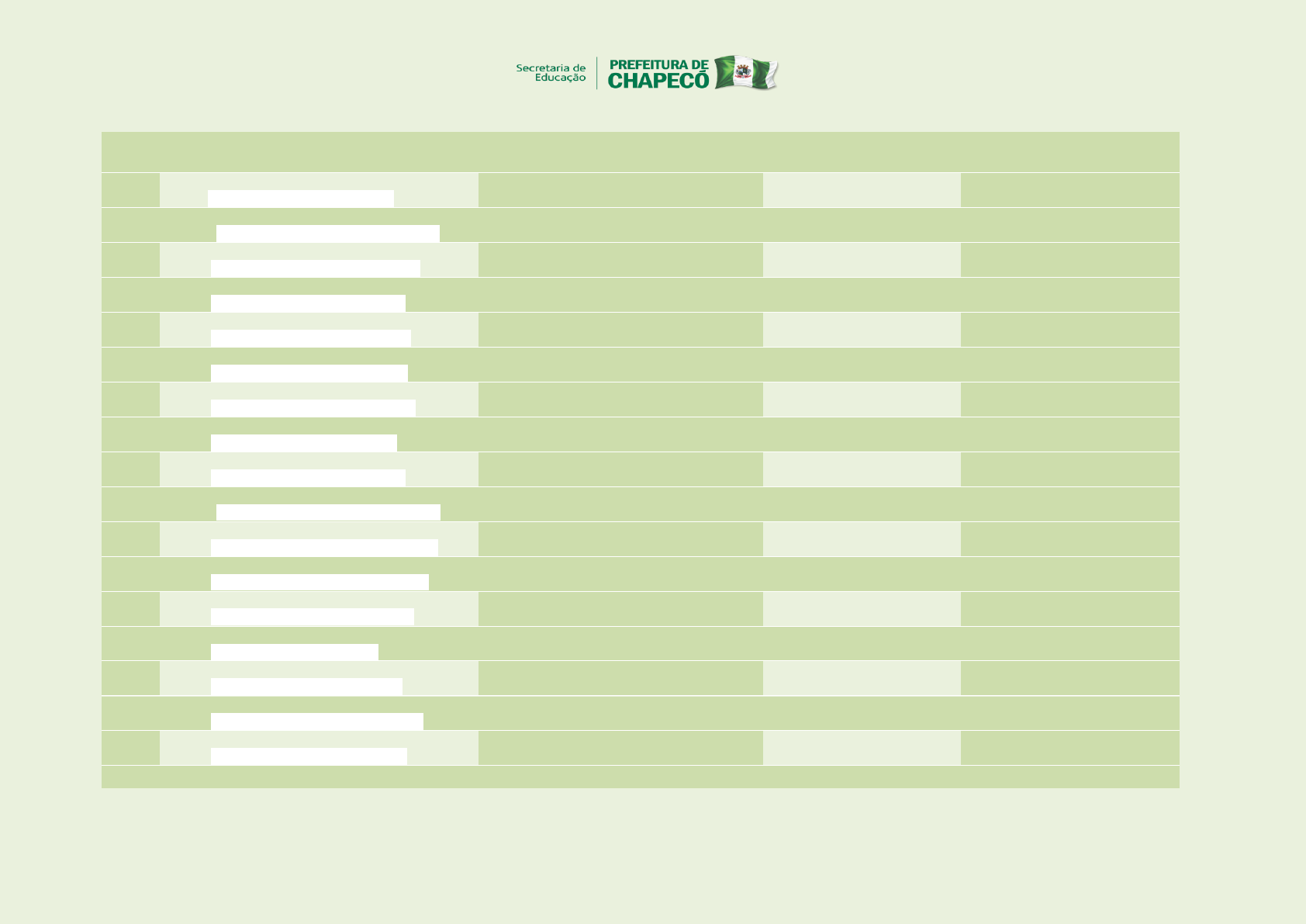 Nº CENTROS DE EDUCAÇÃO INFANTILMUNICIPAIS/E-MAILS ENDEREÇO/RUA/Nº BAIRRO FONE 01 CEIM ADELINA CARLESSO E-mail:ceim.adelina@chapeco.sc.gov.br Rua: Cunha Porã, 19- Loteamento Alice II EFAPI 2049-9483 02 CEIM ALEGRIA DO SABER E-mail: ceim.alegriadosaber@chapeco.sc.gov.br Rua: Moacir Moro, 235D Loteamento Zanrosso EFAPI 2049-9454 03 CEIM ALTO DA SERRA E-mail: ceim.altodaserra@chapeco.sc.gov.br Distrito de Alto da Serra MEIO RURAL 3391-0091 2049-9467 04 CEIM AQUARELA E-mail: ceim.aquarela@chapeco.sc.gov.br Rua: Henriberto Hulsen, 146E Esquina Nereu Ramos PASSO DOS FORTES 2049-9435 05 CEIM BBCRIANÇA E-mail: ceim.bbcrianca@chapeco.sc.gov.br Rua: Amazonas, 114D UNIVERSITÁRIO 3329-0559 2049-9416 06 CEIM BRINCAR E APRENDER I E-mail: ceim.aprender@chapeco.sc.gov.br Rua: Paraná, 146D SANTO ANTONIO 2049-9425 07 CEIM BRINCAR E APRENDER II (Extensão) E-mail: ceim.aprender2@chapeco.sc.gov.br Rua: Ventura Migliorini, 479 D SANTO ANTONIO 2049-9422 08 CEIM BRINCAR E CRESCER E-mail: ceim.crescer@chapeco.sc.gov.br Rua: Marechal Candido Rondon,1938E PINHEIRINHO 3322-4235 2049-9418 09 CEIM CANTINHO DA IMAGINAÇÃO E-mail: ceim.cantinho@chapeco.sc.gov.br Rua: Maria Favaretto, 232 TREVO 3328-1024 10 CEIM CARMEM PELIZZA E-mail: ceim.carmempelizza@chapeco.sc.gov.br Rua: Sergio Luiz Menheguini, 150D LÍDER 2049-9456 11 CEIM CIRANDA DA CRIANÇA E-mail: ceim.cirandacrianca@chapeco.sc.gov.br Rua: Pardais, 01 -Lot. Jardim do Lago Paulo Pasquali,290 EFAPI 3328-5323 8824-0834 12 CEIM CIRANDA DO SABER E-mail: ceim.cirandasaber@chapeco.sc.gov.br Rua: Mal. Floriano Peixoto, 1450D SAIC 3324-4650 13 CEIM CRIANÇA ESPERANÇA E-mail: ceim.esperanca@chapeco.sc.gov.br Rua: Martinho Lutero, 1070E SÃO CRISTOVÃO 3323-0503 14 CEIM CRIANÇA FELIZ E-mail: ceim.feliz@chapeco.sc.gov.br Rua: Waldemar Tormen, 300 Loteamento Cantarelli EFAPI 2049-9451 3329-9048 15 CEIM CRISTO REI E-mail: cristorei.ceim@chapeco.sc.gov.br Rua: Pomerode, esq. Camboriú nº 675E CRISTO REI 3329-7017 2049-9457 16 CEIM DO COMÉRCIO E-mail: ceim.docomercio@chapeco.sc.gov.br Rua: Guaporé 240 E CENTRO 2049-9459 17 CEIM ELDORADO E-mail: ceim.eldorado@chapeco.sc.gov.br Rua: Faxinal dos Guedes, 1074D ELDORADO 2049-9427 18 CEIM ESPLANADA Rua: São Leopoldo, 709D ESPLANADA 3328-9877 E-mail: ceim.esplanada@chapeco.sc.gov.br 2049-9414 19 CEIM EXPOENTE E-mail: ceim.expoente@chapeco.sc.gov.br Rua: Antonio da Silveira 39 E Loteamento Expoente PROGRESSO 2049-9403 20 CEIM IRIS ABELLO E-mail: ceim.abello@chapeco.sc.gov.br Rua: Graciliano Ramos, 489D JARDIM AMÉRICA 3323-5235 21 CEIM JUNINHO E-mail: ceim.juninho@chapeco.sc.gov.br Rua: Santa Terezinha, 75 E Loteamento Dom José Gomes UNIVERSITÁRIO 2049-9406 22 CEIM LEAOZINHO E-mail: ceim.leaozinho@chapeco.sc.gov.br Rua: Natal, 49E PALMITAL 3323-6115 2049-9429 23 CEIM MARIA DA LUZ BORGES E-mail: ceim.mariadaluz@chapeco.sc.gov.br Distrito de Marechal Bormann BORMANN 2049-9428 24 CEIM MARIA HELENA ALVES CHAGAS E-mail: ceim.parquedaspalmeiras@chapeco.sc.gov.br Rua: Mascarenhas de Moraes PARQUE DAS PALMEIRAS 3329-3722 2049-9460 25 CEIM MUNDO ENCANTADO E-mail: ceim.mundo@chapeco.sc.gov.br Rua: João XXIII, 179E SAIC 2049-9434 26 CEIM NOSSOS SONHOS E-mail: ceim.nossossonhos@chapeco.sc.gov.br Rua: Câmara Junior, 2360E JARDIM AMÉRICA 2049-9471 27 CEIM NOVA ERA E-mail: ceim.novaera@chapeco.sc.gov.br Aquiles Tomazelli, 804 SANTA MARIA 3329-0542 28 CEIM NOVA VIDA E-mail: ceim.novavida@chapeco.sc.gov.br Rua: Afonso Scheffer Distrito de MarechalBormann MARECHAL BORMANN 3322-2145 2049-9433 29 CEIM ORACÍLIO COSTELLA E-mail: ceim.colina@chapeco.sc.gov.br Rua: Uirapuru, 231D, Loteamento Colina do Sol EFAPI 2049-9450 30 CEIM PARAISO E-mail: ceim.paraiso@chapeco.sc.gov.br Rua: Guaporé esquina com Ivo Sander 2800 D PARAÍSO 2049-9408 31 CEIM PE-TE-CA E-mail: ceim.peteca@chapeco.sc.gov.br Rua: Kasulo, 335D SEMINÁRIO 3323-0751 2049-9420 32 CEIM PEQUENO PENSADOR E-mail: ceim.pequenopensador@chapeco.sc.gov.br Rua: Ateneu, 149E QUEDAS DO PALMITAL 2049-9424 33 CEIM PEQUENO PRÍNCIPE E-mail: ceim.principe@chapeco.sc.gov.br Rua: São Pedro, 812 D PRESIDENTE MÉDICE 3323- 4153 3328-7230 34 CEIM PEQUENOS HERÓIS E-mail: ceim.herois@chapeco.sc.gov.br Rua: Quilombo, 611D Loteamento Colatto EFAPI 3328-7123 35 CEIM PROJETO MINHA GENTE E-mail: ceim.projetominhagente@chapeco.sc.gov.br Rua: Alfredo Wagner, s/nº ALVORADA 3324-0594 2049-9438 36 CEIM PROTEÇÃO Rua: Cristaldo Rodrigues, 132D VILA REAL 3329 3956 E-mail: ceim.protecao@chapeco.sc.gov.br 37 CEIM Sâ PE TY KóSI E-mail: ceim.sapetykosy@chapeco.sc.gov.br Linha Gramadinho ÁGUA AMARELA - 38 CEIM SÃO PEDRO E-mail: ceim.saopedro@chapeco.sc.gov.br Rua: Pará, 2071D SÃO PEDRO 3322 4128 2049-9411 39 CEIM SEDE FIGUEIRA E-mail: ceim.figueira@chapeco.sc.gov.br Distrito de Sede Figueira MEIO RURAL - 40 CEIM TOLDO CHIMBANGUE E-mail: ceim.toldo@chapeco.sc.gov.br Distrito de Sede Trentin MEIO RURAL - 41 CEIM UNIVERSO DA CRIANÇA E-mail: ceim.universo@chapeco.sc.gov.br Rua: Juscelino Kubischek, 120D BELA VISTA 3324 2281 Nº ESCOLAS BÁSICAS MUNICIPAIS URBANAS/E-MAILS ENDEREÇO/RUA/Nº BAIRRO FONE 01 EBM ANDRÉ ANTONIO MARAFON E-mail: ebm.marafon@chapeco.sc.gov.br Rua: Israel, 1850 D ESPLANADA 3328 -1051 2049-9413 02 EBM ANITA GARIBALDI E-mail: ebm.anita@chapeco.sc.gov.br Rua: João Aurélio Turatti, 742 E PRES. MÉDICE 3329-3649 2049-9419 03 ESCOLA PARQUE CIDADÃ “LEONEL DE MOURA BRIZOLA” E-mail: epcleonelbrizola@chapeco.sc.gov.br Rua: Mal. Floriano Peixoto, 2200 BOM PASTOR 3328-3076 3323-4364 2049-9409 2049-9410 04 EBM CLARA URMANN ROSA E-mail: ebm.clara@chapeco.sc.gov.br Rua: Modesto Baccarin, 295D PARQUE DAS PALMEIRAS 3328-4249 2049-9446 05 EBM CRUZ E SOUSA E-mail: ebm.cruz@chapeco.sc.gov.br Rua: Madri, 491 E LÍDER 3323-1814 2049-9430 06 EBM DILSO CECCHIN E-mail: ebm.dilso@chapeco.sc.gov.br Rua: Pernambuco,859D SANTO ANTONIO 3323-3641 2049-9426 07 EBM DIOGO ALVES DA SILVA E-mail: ebm.diogo@chapeco.sc.gov.br Rua: dos Pardais, 544E - Loteamento Colatto EFAPI 3329-4223 08 EBM FEDELINO MACHADO DOS 