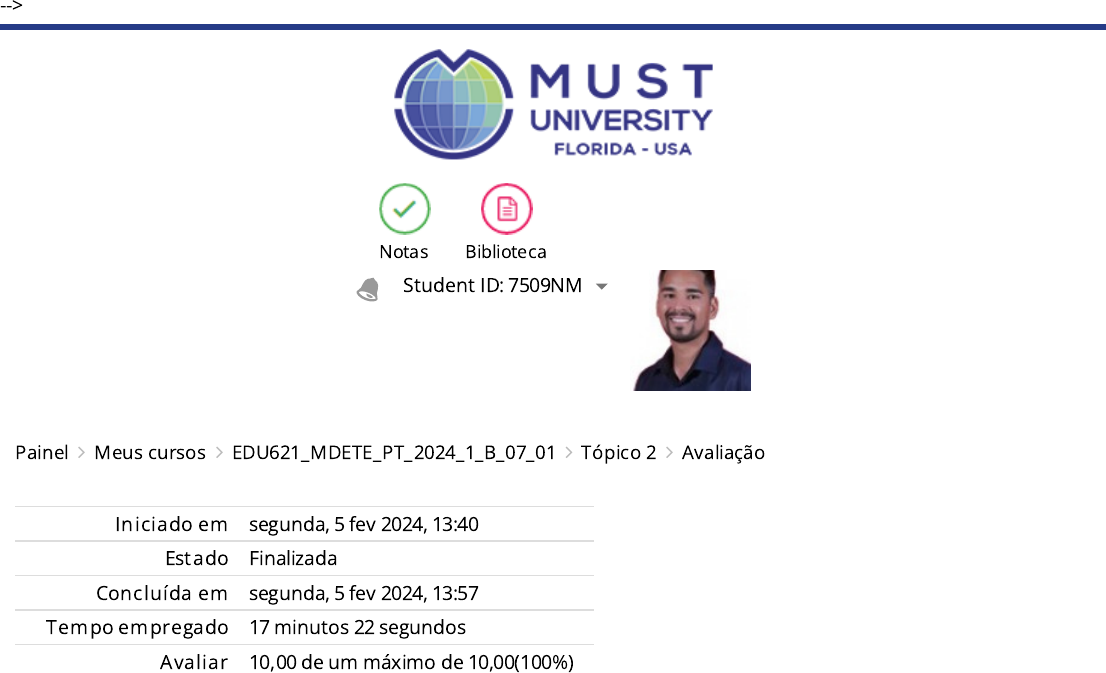 Painel Meus cursos EDU621_MDETE_PT_2024_1_B_07_01 Tópico 2 Avaliação --> Student ID: 7509NM Notas Biblioteca Iniciado em segunda, 5 fev 2024, 13:40 Estado Finalizada Concluída em segunda, 5 fev 2024, 13:57 Tempo empregado 17 minutos 22 segundos Avaliar 10,00 de um máximo de 10,00(100%) https://my.mustedu.com/my/ https://my.mustedu.com/course/view.php?id=1018 https://my.mustedu.com/course/view.php?id=1018#section-2 https://my.mustedu.com/mod/quiz/view.php?id=82124 https://my.mustedu.com/ https://my.mustedu.com/user/view.php?id=7272&course=1018 https://my.mustedu.com/custom/minhas_notas.php Questão 1 Correto Atingiu 1,00 de 1,00 Os nove níveis de aprendizagem de Gagné fornecem uma abordagem passo a passo que auxilia o designer instrucional a estruturar as trilhas de aprendizagem dentro dos cursos que estão sendo produzidos, de modo que os alunos desses cursos obtenham o máximo de suas oportunidades de aprendizagem. Assinale com V (verdadeiro) ou F (falso) as a�rmações que explicam cada um dos níveis, considerando os primeiros passos: ( ) Nível 1: Ganhar atenção (Recepção). É preciso explicar o que os alunos irão aprender até o �nal da atividade ou aula e como a sua aprendizagem vai bene�ciá-los. ( ) Nível 2: O(A)s aluno(a)s devem ser informados(a)s sobre o Objetivo (Expectativa). É imprescindível garantir que os alunos saibam o que eles deverão aprender, e que eles entendam o que eles estão prestes a aprender. ( ) Nível 3: Estimular a aprendizagem prévia (Recuperação). Ajudar o aluno a aprender de forma mais e�caz através da inclusão de exemplos, estudos de caso, os grá�cos, contação de histórias, ou analogias. ( ) Nível 4: Apresentar o estímulo (Percepção seletiva). Apresentar a nova informação para o grupo de uma forma e�caz, organizando suas informações de forma lógica e de fácil compreensão. ( ) Nível 5: Fornecer orientação de aprendizagem (Codi�cação Semântica). Para ajudar o aluno a aprender e reter a informação, forneça abordagens alternativas que ilustram a informação que está sendo apresentada. A sequência correta de preenchimento dos parênteses, de cima para baixo, é: Escolha uma opção: a. F - F - F – F– F b. V - F - F – F – V c. F - V - F – V – V d. V - F - V – F – F Nível 1: Ganhar atenção (Recepção). Comece a experiência de aprendizagem ganhando a atenção de seu público. Essa mudança no estímulo alerta o grupo sobre a aprendizagem que ganhará em breve. É possível ganhar a atenção aumentando o volume de sua voz, mostrando um pequeno vídeo sobre o tema que será aplicado ou usando qualquer outro evento que torna mais interessante o período de “espera para a aula começar". Nível 2: O(A)s aluno(a)s devem ser informados(a)s sobre o Objetivo (Expectativa). É imprescindível garantir que os alunos saibam o que eles deverão aprender, e que eles entendam o que eles estão prestes a aprender. É preciso explicar o que os alunos irão aprender até o �nal da atividade ou aula e como a sua aprendizagem vai bene�ciá-los. Nível 3: Estimular a aprendizagem prévia (Recuperação). Quando os alunos aprenderem algo novo, procure combinar as novas informações com outras relacionadas ou assuntos que aprenderam anteriormente. Por isso, é importante rever todo o aprendizado anterior e aplicá-lo no que os alunos estão aprendendo agora. Além disso, pergunte se eles têm alguma experiência anterior com o tema, ou se eles vivenciaram os problemas que a formação está tentando resolver. Em seguida, faça conexões entre o que eles estão aprendendo, e seu aprendizado anterior. Nível 4: Apresentar o estímulo (Percepção seletiva). Apresentar a nova informação para o grupo de uma forma e�caz, organizando suas informações de forma lógica e de fácil compreensão. Tente usar uma variedade de mídias e estilos diferentes (como pistas visuais, instrução verbal e aprendizagem ativa) para atender pessoas com diferentes estilos de aprendizagem. Nível 5: Forneça Orientação de Aprendizagem (Codi�cação Semântica). Para ajudar o aluno a aprender e reter a informação, forneça abordagens alternativas que ilustram a informação que está sendo apresentada. Ajude o aluno a aprender de forma mais e�caz através da inclusão de exemplos, estudos de caso, os grá�cos, contação de histórias, ou analogias. A resposta correta é: F - V - F – V – V Questão 2 Correto Atingiu 1,00 de 1,00 A Matriz de Design Instrucional é um instrumento que pode ser adaptado a diferentes projetos para que este seja con�gurado de acordo com a experiência que se espera proporcionar ao aluno para que ele alcance a aprendizagem prevista nos objetivos do plano de curso. Para isso é preciso identi�car a hierarquia do conhecimento, os conteúdos a serem produzidos, as facilidades de acesso aos recursos e ferramentas propostos e o comprometimento com a ideia inicial. A hierarquia do conhecimento e as facilidades de acesso são representadas como: Escolha uma opção: a. Taxonomia de Bloom; Recursos tecnológicos educacionais b. Objetivos de aprendizagem; Ferramentas de comunicação. c. Grá�co de Pareto; Método PDCA d. Materiais instrucionais; Experiência do Usuário. A Matriz de Design Instrucional precisa se adaptar ao usuário e con�gurar o projeto de acordo com o comportamento humano. Para isso é preciso identi�car a hierarquia do conhecimento, a visualização do conteúdo, as facilidades de acesso e o comprometimento com a ideia inicial. Cada vez mais o Designer Instrucional amplia seus horizontes de conexões com as áreas gestoras. Estudar o comportamento humano, aplicar a taxonomia de Bloom para que o conteúdo seja crescente e de forma hierárquica criam resultados diferenciados e inovadores. Aplicar os conceitos da psicologia tem sido um diferencial produtivo para o Design Instrucional. A resposta correta é: Taxonomia de Bloom; Recursos tecnológicos educa
