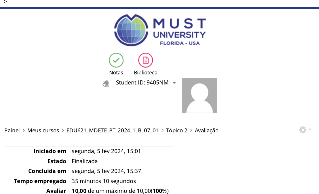 Painel Meus cursos EDU621_MDETE_PT_2024_1_B_07_01 Tópico 2 Avaliação --> Student ID: 9405NM Notas Biblioteca Iniciado em segunda, 5 fev 2024, 15:01 Estado Finalizada Concluída em segunda, 5 fev 2024, 15:37 Tempo empregado 35 minutos 10 segundos Avaliar 10,00 de um máximo de 10,00(100%) https://my.mustedu.com/my/ https://my.mustedu.com/course/view.php?id=1018 https://my.mustedu.com/course/view.php?id=1018#section-2 https://my.mustedu.com/mod/quiz/view.php?id=82124 https://my.mustedu.com/ https://my.mustedu.com/ https://my.mustedu.com/user/view.php?id=9191&course=1018 https://my.mustedu.com/custom/minhas_notas.php Questão 1 Correto Atingiu 1,00 de 1,00 O papel do Design Instrucional vai além da instrucionalização dos conteúdos brutos. Faz parte das atividades desempenhar: Escolha uma opção: a. O acompanhamento pedagógico e educacional durante todo o trajeto do curso, até a avaliação �nal concluída por cada aluno, trazendo visibilidade e dinamismo. O aluno não pode �car sozinho. b. As tarefas são realizadas de forma síncronas e a de�nição dos objetivos direcionados para o universo dos cursos a distância. c. A estrutura do Design Instrucional estabelece que o propósito do curso vai além das iniciativas individuais. Isso representa dizer que cada um é responsável por uma parte e que a união de todas gerará o resultado. d. É preciso estruturar uma trilha de aprendizagem, escolher uma metodologia, criar uma apresentação visual, veri�car a acessibilidade e tantos outros pontos de atenção na criação de conteúdos para esse momento educacional. O pro�ssional de Design Instrucional possui uma visão holística do projeto que favorece sua execução. Com a pandemia iniciada em 2020 não houve espaço para que as ideias continuassem a serem discutidas. Foi necessário a implantação imediata, a�nal a educação não poderia �car estagnada por tempo indeterminado. Todas estas mudanças nas ações destacaram a importância dos pro�ssionais para elaboração do material especí�co do EaD. Transferir os conteúdos vai além do texto digitado e das ideias envolvidas. É preciso estruturar e pensar na trilha do aprendizado, na metodologia, no visual, na acessibilidade e tantos outros itens direcionados para cada momento educacional. O pro�ssional de Design Instrucional possibilita a visão holística do projeto e potencializa a execução. A resposta correta é: É preciso estruturar uma trilha de aprendizagem, escolher uma metodologia, criar uma apresentação visual, veri�car a acessibilidade e tantos outros pontos de atenção na criação de conteúdos para esse momento educacional. O pro�ssional de Design Instrucional possui uma visão holística do projeto que favorece sua execução. Questão 2 Correto Atingiu 1,00 de 1,00 Partindo do fato que uma ação educativa é constituída por dois processos, de ensinar e aprender, dizemos que os objetivos educacionais também são divididos em dois: os objetivos de ensino e os objetivos de aprendizagem. I – Os objetivos de ensino têm como foco a ação do professor. II – Os objetivos de aprendizagem têm como foco a aprendizagem do aluno. Tanto os objetivos de ensino como os de aprendizagem devem ter o mesmo intuito: suprir as necessidades dos alunos e seus interesses de acordo com sua realidade. Contudo, um representa a forma como o conteúdo e o tutor irão trabalhar e o outro representa o que o aluno irá adquirir no curso ou disciplina em termos de conhecimentos, competências, habilidades, valores e atitudes. Considerando estes objetivos assinale a alternativa correta: Escolha uma opção: a. os objetivos gerais trazem a estrutura do funcionamento do curso, como AVA, senha de acesso, entre outros. Já os especí�cos de�nem a quantidade de ABAS possíveis de serem abertas. b. ambos têm a mesma função: ensinar como deve ser feito. c. os objetivos gerais são destacados na fase de análise e os objetivos especí�cos que são relacionados às unidades de aprendizagem ou aulas, e são de�nidos na fase de design ou desenho d. os objetivos gerais representam a estrutura formal e os objetivos de aprendizagem o formato do público-alvo De forma simpli�cada, objetivos de aprendizagem são metas ou resultados propostos aos alunos para adquirirem determinados conhecimentos. Ou seja, os objetivos de aprendizagem indicam o que o aluno deverá ser capaz de fazer como consequência do seu aprendizado e em um determinado curso, assim os objetivos podem ser expressos em dois níveis. · Objetivos gerais: que são mais amplos e complexos e podem ser alcançados a longo prazo, por exemplo, ao �nal de um curso completo ou de uma disciplina. · Objetivos especí�cos: referem-se a aspectos mais simples e concretos e alcançáveis em menor tempo, por exemplo, os que surgem no �nal de uma aula ou unidade. É importante destacar que os objetivos gerais são destacados na fase de análise e os objetivos especí�cos são relacionados às unidades de aprendizagem ou aulas, e são de�nidos na fase de design ou desenho. De forma simpli�cada, objetivos de aprendizagem são metas ou resultados propostos aos alunos para adquirirem determinados conhecimentos. Ou seja, os objetivos de aprendizagem indicam o que o aluno deverá ser capaz de fazer como consequência do seu aprendizado e em um determinado curso, assim os objetivos podem ser expressos em dois níveis. · Objetivos gerais: que são mais amplos e complexos e podem ser alcançados a longo prazo, por exemplo, ao �nal de um curso completo ou de uma disciplina. · Objetivos especí�cos: referem-se a aspectos mais simples e concretos e alcançáveis em menor tempo, por exemplo, os que surgem no �nal de uma aula ou unidade. É importante destacar que os objetivos gerais são destacados na fase de análise e os objetivos especí�cos são relacionados às unidades de aprendizagem ou aulas, e são de�nidos na fase de design ou desenho. 