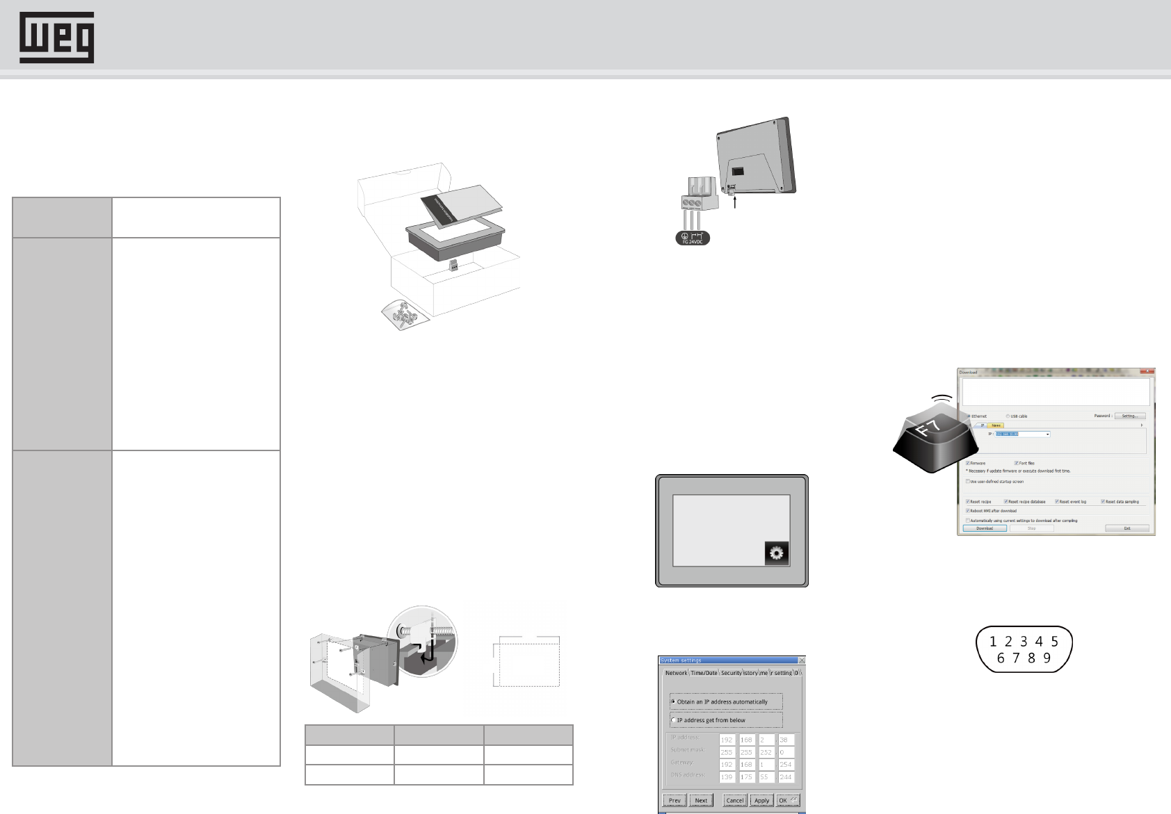 MT6071iP/MT8071iP SERIES 1. GUIA DE INSTALAÇÃO E START-UP Este documento contém as instruções de instalação da IHM Série MT6/8071iP. Para informações de operação e especificações detalhadas, consulte o Catálogo e o Manual do Usuário do EasyBuilder Pro. Ambiente de Instalação: Classificação NEMA As IHMs Séries MT6/8071iP é classificada como NEMA 4 (apenas internamente). Ambiente elétrico As IHMs Séries MT6/8071iP foram testada para estar em conformidade com os requisitos europeus CE. Isso significa que o circuito é concebido para resistir aos efeitos de ruído elétrico. Isso não garante imunidade ao ruído em casos graves. O cabeamento e o aterramento correto do fio irá garantir o funcionamento adequado. Considerações Ambientais (1) Certifique-se de que os displays estão instalados corretamente e que os limites operacionais sejam observados. Evite instalar as unidades em ambientes onde existe vibração mecânica severa ou choque. (2) Não opere a unidade em áreas sujeitas a riscos de explosão devido a gases, vapores ou poeiras inflamáveis. (3) Não instale a unidade onde existe gás ácido, como o SO2. (4) Este dispositivo deve ser montado na posição vertical e deve ser utilizado em compartimento de superfície plana. (5) Em conformidade com a segurança da máquina UL 508 (ISBN 0-7629-0404-6) para uso em Ambiente com Grau de Poluição 2. 2. RETIRADA DA UNIDADE Retire o produto da embalagem e examine-o. Se for encontrado dano, entre em contato com o fornecedor. (1) (2) (3) (4) 1. Instruções de Instalação, A4 2 lados *1 2. Interface Homem-Máquina *1 3. Conector de Alimentação *1 4. Suportes & Parafusos *1 pacote Observação: Coloque o painel do operador em uma superfície estável durante a instalação. A sua queda pode causar danos. 3. INSTRUÇÕES DE INSTALAÇÃO Fixe o painel do operador na posição, utilizando todos os furos de fixação, suportes e parafusos fornecidos. Torque do Parafuso: 2,6 a 3,9 lbf.in. (0,29 a 0,44 Nm) (Para alcançar o efeito estanque e impedir que o painel sofra deformações.) (B ) Recorte (A) Tipo A(mm) B(mm) MT8071iP 192 138 MT6071iP 192 138 4. CONEXÕES DE ALIMENTAÇÃO Observação: 1. Conecte a linha CC positiva ao terminal ‘+’ e a linha negativa CC ao terminal ‘-’. 2. Por favor, não conecte a IHM ao PLC e ao PC simultaneamente para evitar que a diferença de potencial danifique as portas USB da IHM e do PC. 5. CONFIGURAÇÕES DO SISTEMA Quando a IHM for alimentada e exibir uma imagem, pressione o botão System Settings. (Senha Padrão do Sistema: 111111) É necessário conectar a IHM na sua rede através de um cabo RJ45. (N/A para MT6071iP) Vá até a aba Network; você pode optar por obter automaticamente o IP do DHCP, ou designar seu próprio IP. 6. CONFIGURAÇÕES DE SOFTWARE EASYBUILDER PRO Inicie o software EasyBuilder Pro, selecione o seu projeto, pressione a tecla de atalho F7 para abrir a tela de download: Para MT6071iP, selecione cabo USB / Para MT8071iP, selecione Ethernet > aba IP > Digite o IP da IHM > Clique em Download para fazer o download deste projeto para a IHM. Recomenda-se usar o “Screen Saver” e o “Backlight Saver” para evitar o efeito de persistência de imagem causado por exibir a mesma imagem na IHM por um longo período de tempo. (Por favor, consulte o Manual do Usuário do EasyBuilder Pro para detalhes de operação do software) 7. CONEXÕES DE COMUNICAÇÃO 9 Pinos, Macho, D-sub COM1 [RS232] COM2 [RS485] Observação: COM2 RS485 2W suporta MPI 187,5K. PIN# COM1 [RS232] COM2 [RS485] 4W COM2 [RS485] 2W 1 Rx- Dados- 2 Rx+ Dados+ 3 Tx- 4 Tx+ 5 GND 6 TxD 7 RTS 8 CTS 9 RxD 8. CONFIGURAÇÕES DOS JUMPERS 1-2 3-4 Modo ON OFF Modo de Calibração Touch Screen OFF ON Modo Boot Loader OFF OFF Normal Por favor, prepare uma capa de jumper para configurar os jumpers. Outra maneira de entrar no modo de calibração da touch screen é: Pressione e segure em qualquer lugar da tela por no mínimo 2 segundos quando a IHM iniciar. CUIDADO! Observação! Certifique-se de que todas as normas elétricas locais e nacionais sejam observadas durante a instalação da unidade. Entre em contato com as autoridades locais para determinar quais os códigos aplicáveis. Alimentação A unidade pode ser alimentada apenas por corrente contínua (CC), faixa de tensão: 10.5~28V CC. compatível com a maioria dos sistemas CC de controladores. O circuito de condicionamento de energia no interior da unidade é realizado por uma fonte de alimentação chaveada. A corrente de pico na energização pode atingir 2A. Requisitos dos Fusíveis Se a tela não aparecer dentro de 5 segundos ao ligar, desligue a alimentação. Um fusível reinicializável protegerá contra falhas no circuito DC e a reinicialização ocorrerá após um período de tempo. Verifique a fiação por suas conexões corretas e tente ligar novamente. Alta Tensão Fusível rearmavel evitará danos para a condição de sobrecorrente; no entanto, isso não é garantido. As fontes de tensão CC devem fornecer isolamento adequado da alimentação CA principal e de perigos semelhantes. Parada de Emergência A PARADA DE EMERGÊNCIA por fio deve ser instalada em qualquer sistema utilizando uma IHM para cumprir com as Recomendações de Segurança ICS. Condição de Tensão de Alimentação Não ligue a IHM e as cargas indutivas CC, ou o circuito de entrada no controlador, com a mesma fonte de alimentação. Observação: A saída de 12 or 24 V CC de alguns controladores pode não ter corrente suficiente para alimentar a unidade. Cabeamento a. O comprimento do fio de energia deve ser minimizado (máx.: 500 m blindado, 300 m sem blindagem). b. Por favor, utilize cabos de par trançado para cabos de alimentação e de sinal conforme impedâncias correspondentes. c. Se a fiação ficar exposta a raios ou surtos, use dispositivos apropriados de supressão de surtos. d. Mantenha fiação CA e fiação de fonte CC chaveada separada dos cabos de sinal. 