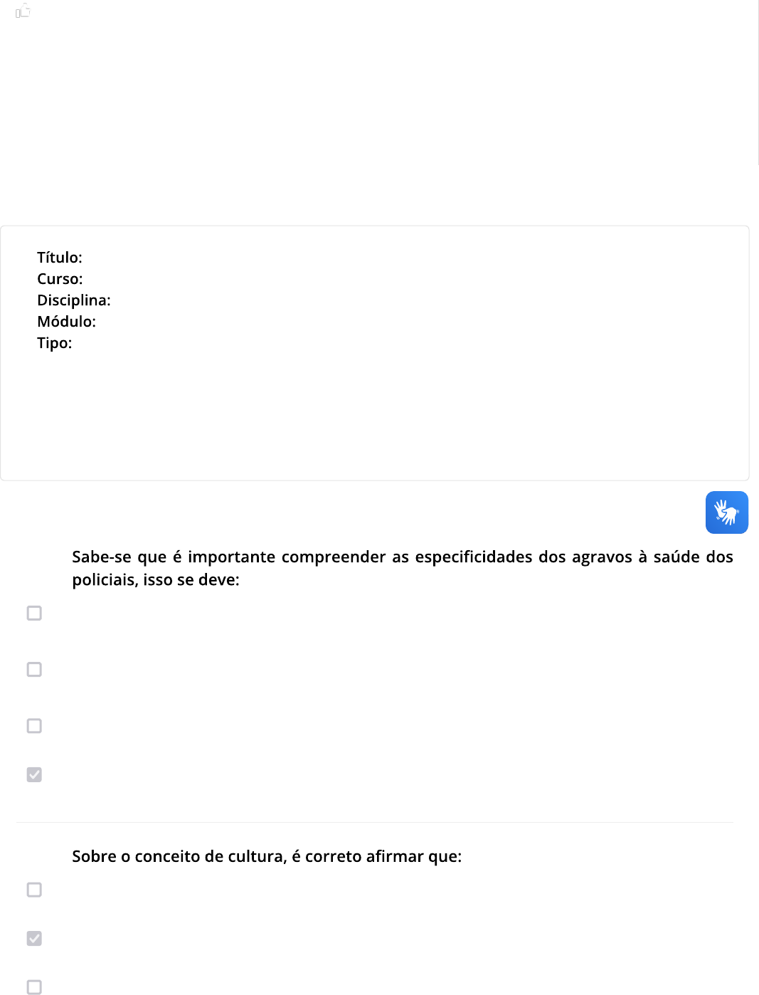 7,3 mil pessoas estão seguindo isso. Seja a primeira pessoa entre seus amigos a seguir isso. Seguir Questionário Não há necessidade de atenção à saúde destes pro�ssionais. A e�ciência da segurança pública não depende do cuidado com a saúde física e mental deste pro�ssional. Às condições mecânicas das viaturas em relação ao exército. Às condições de maior vulnerabilidade em relação a população. É um conceito superado nas ciências sociais. É um conceito de múltiplas acepções, complexo e difícil de ser sintetizado. É um conceito simples, de senso comum. Prova-Sociologia Do Crime E Da Violência-Profª Andressa Ignácio Da Silva +Inteligência Policial e Penitenciária Sociologia do crime e da violência Módulo 1 PROVA 1. 2. UNINA https://cursor.unina.edu.br/Account/Questionario.aspx?token=U3R1Z... 2 of 5 06/02/2024, 15:32 É um conceito irrelevante para compreensão das sociedades. Os agricultores. Os bandeirantes. Os tropeiros. Os mascates. Ocorre apenas nas sociedades europeias. Ocorre apenas nas sociedades primitivas. Incentiva o uso da violência. Caracteriza-se pela mudança, construção, avanços e retrocessos. Fenômenos presentes apenas em sociedades primitivas. Características das sociedades socialistas. Fenômenos que não ocorrem nas sociedades capitalistas. Características estruturais do capitalismo. Um organismo vivo, no qual cada parte desempenha uma função. 3. 4. 5. 6. UNINA https://cursor.unina.edu.br/Account/Questionario.aspx?token=U3R1Z... 3 of 5 06/02/2024, 15:32 Um conjunto de indivíduos vegetativos. Um grupo de pessoas que vivem no mesmo espaço, sem objetivos. Um fato social, histórico e baseado em fatos reais. Representa uma organização ine�ciente. Representa uma organização independente. Representa uma organização irracional. Representa uma organização racional, impessoal e e�ciente. Um sistema bipartidário. Um estado nacionalista. Um Estado Democrático de Direito. Uma república federalista. Corrupção ativa. Homicídio. Trá�co de drogas. Sequestro. 7. 8. 9. 10. UNINA https://cursor.unina.edu.br/Account/Questionario.aspx?token=U3R1Z... 4 of 5 06/02/2024, 15:32 UNINA Copyright © 2011 - 2024. Todos direitos reservados. Escola Positiva e Escola Compreensiva. Escola clássica e Escola Antiga. Escola Criminal e Escola Penal. Escola clássica, a Escola Positiva e a Sociologia Criminal. UNINA https://cursor.unina.edu.br/Account/Questionario.aspx?token=U3R1Z... 5 of 5 06/02/2024, 15:32
