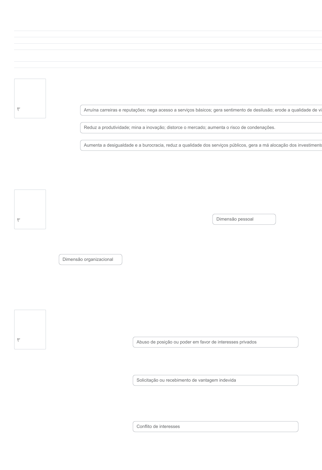 01/02/2024, 10:24 Avaliação Final: Revisão da tentativa https://mooc41.escolavirtual.gov.br/mod/quiz/review.php?attempt=1700446&cmid=42863 1/4 Questão 1 Correto Atingiu 10,00 de 10,00 Marcar questão Questão 2 Correto Atingiu 10,00 de 10,00 Marcar questão Questão 3 Correto Atingiu 10,00 de 10,00 Marcar questão Iniciado em quinta-feira, 1 fev. 2024, 10:21 Estado Finalizada Concluída em quinta-feira, 1 fev. 2024, 10:24 Tempo empregado 2 minutos 38 segundos Notas 108,00/110,00 Avaliar 98,18 de um máximo de 100,00 QUESTIONÁRIO Avaliação Final Joana trabalha em uma empresa de tecnologia em um estado do Nordeste. Sabemos que a corrupção pode gerar impactos na vida de Joana em diversos aspectos: pessoal, no trabalho e no estado onde mora. Relacione os impactos ao aspecto a que pertencem: Joana Empresa Estado Arruína carreiras e reputações; nega acesso a serviços básicos; gera sentimento de desilusão; erode a qualidade de vi Reduz a produtividade; mina a inovação; distorce o mercado; aumenta o risco de condenações. Aumenta a desigualdade e a burocracia, reduz a qualidade dos serviços públicos, gera a má alocação dos investimento Sua resposta está correta. A integridade pode ser tratada tanto no âmbito pessoal como no da organização. Relacione as dimensões da integridade às situações abaixo: 1. Marcos comporta-se de maneira correta, honesta e contrária à corrupção. 2. Um órgão público considera em suas rotinas de trabalho temas como conduta ética, orientações e exemplos das lideranças, processos e divisões de trabalho, políticas de incentivo a determinados comportamentos, sistemas de prestação de contas, processos de monitoramento e uso de recursos e as interações com a sociedade em geral. Dimensão pessoal Dimensão organizacional Sua resposta está correta. Vimos que os riscos para a integridade aparecem quando as incertezas sobre os objetivos da organização são relacionadas à noção de integridade. Relacione as situações abaixo com o risco para integridade mais evidente: Amanda, chefe de setor em uma fundação pública, constantemente pede que o estagiário da área que busque suas roupas na lavanderia. Augusto, que audita uma empresa pública, solicitou que em sua próxima visita fosse hospedado no melhor hotel da cidade com todas as despesas pagas para não relatar fraudes identificadas nos registros contábeis da empresa. A servidora Márcia, formada em direito, passou a advogar para empresa regulada pelo ministério em que trabalha para poder utilizar-se das informações a que tem acesso e que não são de conhecimento de outros escritórios de advocacia. Abuso de posição ou poder em favor de interesses privados Solicitação ou recebimento de vantagem indevida Conflito de interesses 01/02/2024, 10:24 Avaliação Final: Revisão da tentativa https://mooc41.escolavirtual.gov.br/mod/quiz/review.php?attempt=1700446&cmid=42863 2/4 Questão 4 Correto Atingiu 10,00 de 10,00 Marcar questão Questão 5 Correto Atingiu 10,00 de 10,00 Marcar questão Fernando ameaçou plantar notícia falsa na imprensa sobre corrupção na prefeitura caso a empresa para a qual trabalha não fosse selecionada em um processo de licitação no qual estava concorrendo. João foi escolhido como secretário de uma autarquia pública e decidiu chamar para formar seu gabinete seu irmão, um cunhado e sua filha, que não possuíam a qualificação necessária para exercer os cargos. Para economizar, Rômulo levou canetas e resmas de papel do almoxarifado de seu órgão para o material escolar de seu filho. Pressão interna ou externa ilegal ou antiética para influenciar agente público Nepotismo Utilização de recursos públicos em favor de interesses privados Sua resposta está correta. Aprendemos que conflito de interesses é a situação gerada pelo confronto entre interesses públicos e privados, que possa comprometer o interesse coletivo ou influenciar, de maneira imprópria, o desempenho da função pública. Relacione as situações abaixo às configurações de conflitos de interesses no exercício de cargo ou emprego no âmbito do Poder Executivo federal, conforme a Lei nº 12.813/2013: Ricardo foi contratado como consultor da área de riscos em empresa regulada pelo ministério onde trabalha. Mariana soube, em virtude de suas atividades em uma autarquia pública federal, que determinada empresa iria decretar falência, então decidiu vender as ações que tinha desta empresa antes que se desvalorizassem. Lucas ganhou em seu aniversário uma garrafa de vinho de uma das empresas que auditava. Prestar serviços, ainda que eventuais, a empresa cuja atividade seja controlada, fiscalizada ou regulada pelo Divulgar ou fazer uso de informação privilegiada, em proveito próprio ou de terceiro, obtida em razão das ativi Receber presente de quem tenha interesse em decisão do agente público ou de colegiado do qual este partic Sua resposta está correta. Considere a seguinte situação: Luís é diretor da área de licitações e contratos de uma fundação pública federal. Ele é casado e tem dois filhos adultos. Assinale verdadeiro (V) ou falso (F) para as condutas abaixo: Um dos filhos de Luís foi nomeado sem concurso para o cargo de gerente do departamento de informática da fundação. Só se caracterizaria situação de nepotismo caso Luís fosse o chefe imediato do filho. Para o outro filho, recém-formado em engenharia e desempregado, Luís pediu à empresa terceirizada que presta serviço de manutenção predial para dar uma oportunidade ao filho. Isso só é possível porque se trata de empresa privada e o salário é pago pela empresa e não pela fundação. Para evitar qualquer acusação de nepotismo, Luís resolveu que seria melhor o filho trabalhar em outro lugar, por isso acionou um contato em uma autarquia pública para que passasse a trabalhar como comissionado naquela entidade. Em compensação, nomeou outra pessoa indicada pelo vice-p