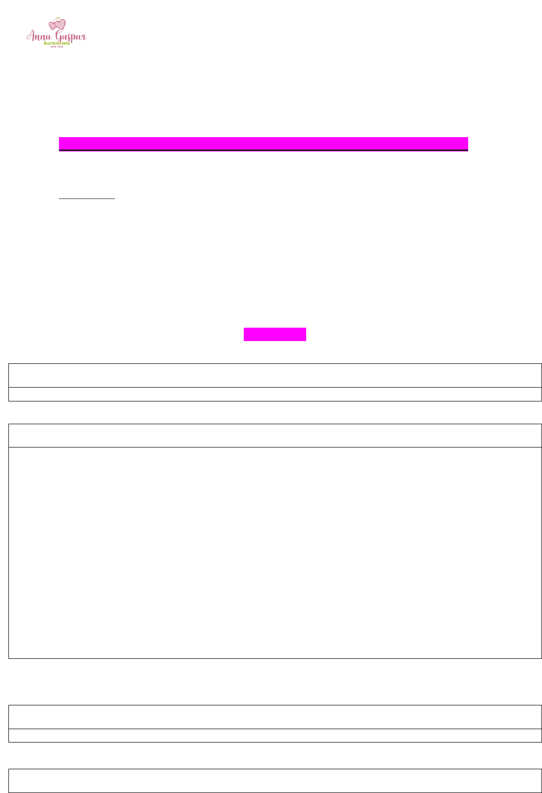 Nutricionista Anna Gaspar CRN 8-11872 Paciente: Thaís Mandu Plano alimentar anti-inflamatório inicial para tratamento de lipedema Benefícios: - Muita saciedade com poucas calorias - Muitos nutrientes, fibras e água. - Alimentação natural que desliga o sistema de recompensa do cérebro e diminui vontade de doces, carboidrato refinado e fast food. - Baixa ingestão de proteínas alergênicas e alimentos processados. - Flexibilidade metabólica aumentando a queima de gordura. - Flexibilidade no paladar. REFEIÇÕES EM JEJUM: - 400 ml de água em jejum + SHOT MATINAL (escolher um shot no Guia de Shots) CAFÉ DA MANHÃ - Ovos + Suco verde Power – 1 copo ou - Ovos + Abacate fatiado em cubos ou amassado + Tomatinhos + Orégano ou - Crepioca com queijo cottage (tempere com sal, orégano e azeite) + Suco Verde Simples ou - Ovos + Smoothie de banana e maracujá ou Nescau fake ou - Panqueca de banana e aveia + morangos picados ou cubinhos de manga + Suco verde simples ou - Ovos mexidos + Pão de amêndoas caseiro + 1 fruta Se sentir pouca fome, use apenas o smoothie (inclua um pote de iogurte natural integral) Intercale uma fruta de baixo caboidrato (low carb) com uma de alto carboidrato COLAÇÃO (ENTRE O CAFÉ DA MANHÃ E O ALMOÇO) 300ml de chá termogênico (ver receitas no Guia de Chás) ALMOÇO Nutricionista Anna Gaspar CRN 8-11872 ¼ do prato folhas (escolha folha da sua preferência) + 1 folha verde escura crua ou refogada (couve, espinafre, taioba, rúcula, agrião) + ¼ do prato de Legumes (couve-flor, brócolis, palmito, aspargos, berinjela, abobrinha, chuchu, tomate, alho-poró, abóbora, cenoura, beterraba) + Proteína (carne, peixe, frango ou ovos) – pelo menos 100g + 1 fonte de carboidrato* + Azeite extra-virgem ou molho de salada *Opcional (se você quiser) – 1 colher de sopa de arroz equivale a 1 fatia de pão, quantas você comeria? Sempre se sirva do carboidrato no final da montagem – depois de ter colocado a salada e os legumes. Sobremesa: fruta fresca ou grelhada (maçã e banana ficam ótimas) ou chocolate > 70%. Ideias: - Salada de repolho roxo cru + Espinafre + abobrinha ralada + Tilápia cítrica + grão-de-bico com especiarias + Brócolis no vapor - Salada de acelga + agrião + palmito + Berinjela assada + Salmão assado + Arroz integral com brócolis - Salada de alface + Couve + Tabule de couve-flor + Omelete + Lentilha - Salada de rúcula + radichio + tomate picado + Brócolis refogado com alho-poró + Frango grelhado suculento LANCHE DA TARDE 300 ml de chá termogênico (ver receitas no Guia de Chás) + uma das opções abaixo Palitos de cenoura/pepino/abobrinha + 2 colheres de sopa de pastinha saudável ou Bolo de banana fofíssimo ou brownie Express ou Quiche de ricota ou Sorvete de flocos ou outro das lista de receitas – 1 porção ou Mix de nuts e sementes + 1 fruta – ver receita abaixo ou Iogurte natural integral + 1 fruta picada + geleia 100% fruta Queensberry + Farelo aveia + Canela *Se não estiver com muita fome, faça apenas uma receita de suchá – veja nas orientações. *Pode substituir o chá de cavalinha por chá verde ou chá de hibiscus. JANTAR Nutricionista Anna Gaspar CRN 8-11872 300 ml de água antes do jantar + uma das opções abaixo Salada de frango, grão-de-bico e uvas passas ou Salada de quinoa e nozes – 1 porção ou Uma porção de sopa (e-book receitas de inverno) ou Panqueca de tubérculos ou Crepioca – 1 unidade + Maionese saudável ou pastinha de queijo + Frango desfiado/carne moída ou atum + ½ prato de salada ou Escondidinho de couve-flor – 1 porção + ½ prato de verduras e legumes ou Spaghetti de abóbora/abobrinha + carne moída/frango com molho sugo caseiro CEIA kiwi ou pêssego ou ameixa ou melão ou morango + chia + canela ORIENTAÇÕES Obs: De preferência, dê um intervalo de 12 horas entre o jantar e o café-da-manhã. Tente jantar mais cedo – entre 19:30 e 20:00. Quando for combinar frutas, combine 1 fruta com mais carboidrato e 1 com menos. Ou até 2 com menos e uma com mais. FRUTAS LOW CARB – kiwi, morango, todas as berries (blueberry, cranberry, raspberry, amora, jabu- ticaba), ameixa, abacate, coco, pêssego, maçã, limão, maracujá, acerola e melão. FRUTAS COM MAIS CARBOIDRATO – banana, manga, abacaxi, melancia, uva, caqui, mamão, água de coco. Exemplos: Banana + coco Kiwi + manga + coco Abacate + morango + banana MIX DE NUTS E SEMENTES – 10 amêndoas + 2 castanhas-do-pará + 2 nozes + 1 colher de sopa de sementes de abóbora Nutricionista Anna Gaspar CRN 8-11872 PRESCRIÇÕES PARA MANIPULAÇÃO: Formulação Destoxificante, Anti-inflamatória e Antioxidante: Mix de Tocoferois – 300 mg Vitamina C revestida – 200mg Ácido alfa-lipoico – 30mg N-acetilcisteína – 300mg Astaxantina – 3mg Aviar 60 doses em cápsulas vegetais Posologia: consumir uma dose ao dia, pela manhã. Associar com: Cynara cardunculus, Alcachofra, padronizado a 1% de derivados de ácido cafeoilquínico expressos em ácido clorogênico, folha – 100mg Aviar 60 doses em cápsulas vegetais. Posologia: consumir uma dose ao dia, pela manhã. Modulação intestinal Lactobacillus acidophilus – 2 bilhões de UFC Bifidobacterium bifidum – 1 bilhão de UFC Lactobacillus rhamnosus – 1 bilhão de UFC Lactobacillus paracasei – 1 bilhão de UFC Lactobacillus gasseri – 1 bilhão de UFC Aviar 60 doses em cápsulas Posologia: consumir uma dose ao dia, 30 minutos antes da refeição Associar com: Glutamina - 5g Aviar 60 doses em sachês/pó. Posologia: consumir uma dose ao dia, diluída em água, antes de dormir. Anna Carolina Gaspar – Nutricionista CRN 8/118-72