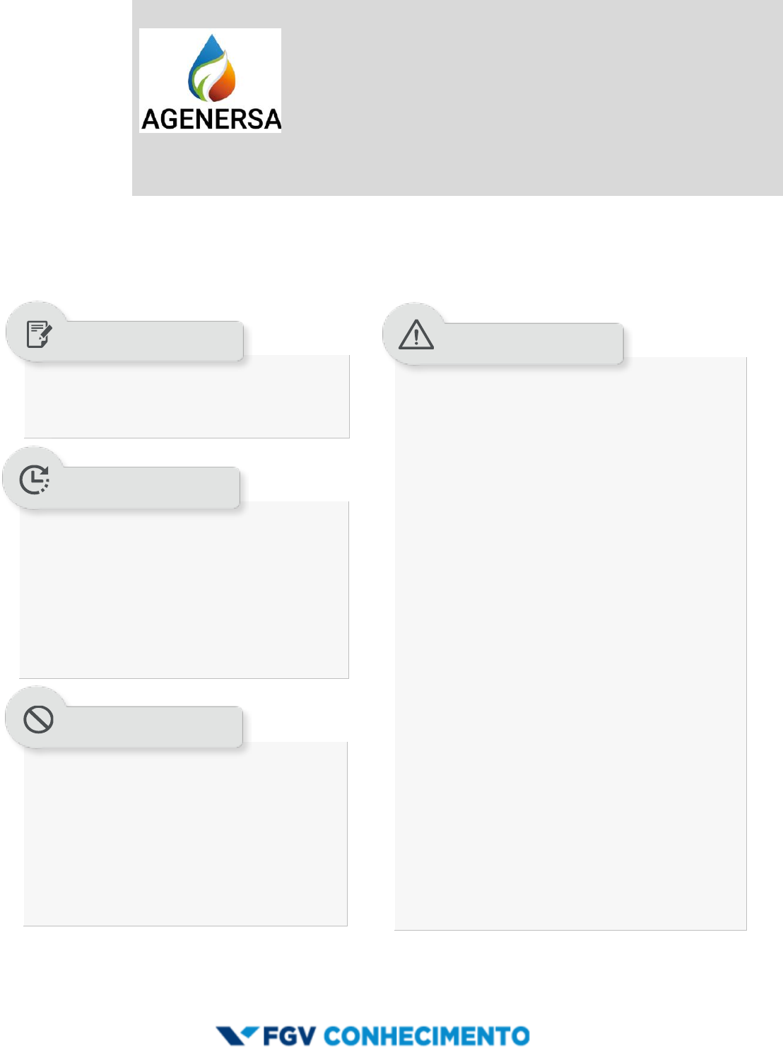 AGÊNCIA REGULADORA DE ENERGIA E SANEAMENTO BÁSICO DO ESTADO DO RIO DE JANEIRO TARDE ASSISTENTE TÉCNICO DE REGULAÇÃO NÍVEL MÉDIO – TIPO 1 – BRANCA Além deste caderno contendo 70 (setenta) questões objetivas, você receberá do fiscal de prova o cartão de respostas. Verifique se seu caderno de questões está completo, sem repetição de questões ou falhas. Caso contrário, notifique imediatamente o fiscal da sala, para que sejam tomadas as devidas providências. Confira seus dados pessoais, especialmente nome, número de inscrição e documento de identidade e leia atentamente as instruções para preencher o cartão de respostas. Use somente caneta esferográfica, fabricada em material transparente, com tinta preta ou azul. Assine seu nome apenas no(s) espaço(s) reservado(s). Confira seu cargo, cor e tipo do caderno de questões. Caso tenha recebido caderno de cargo ou cor ou tipo diferente do impresso em seu cartão de respostas, o fiscal deve ser obrigatoriamente informado para o devido registro na ata da sala. Reserve tempo suficiente para o preenchimento do seu cartão de respostas. O preenchimento é de sua responsabilidade e não será permitida a troca do cartão de respostas em caso de erro cometido pelo candidato. Para fins de avaliação, serão levadas em consideração apenas as marcações realizadas no cartão de respostas. A FGV coletará as impressões digitais dos candidatos na lista de presença. Os candidatos serão submetidos ao sistema de detecção de metais quando do ingresso e da saída de sanitários durante a realização das provas. Boa sorte! Você dispõe de 4 (quatro) horas para a realização da prova, já incluído o tempo para a marcação do cartão de respostas. 3 (três) horas após o início da prova é possível retirar-se da sala, sem levar o caderno de questões. A partir dos 30 minutos anteriores ao término da prova é possível retirar-se da sala levando o caderno de questões. Qualquer tipo de comunicação entre os candidatos durante a aplicação da prova. Anotar informações relativas às respostas em qualquer outro meio que não seja o caderno de questões. Levantar da cadeira sem autorização do fiscal de sala. Usar o sanitário ao término da prova, após deixar a sala. SUA PROVA TEMPO NÃO SERÁ PERMITIDO INFORMAÇÕES GERAIS AGÊNCIA REGULADORA DE ENERGIA E SANEAMENTO BÁSICO DO ESTADO DO RIO DE JANEIRO FGV CONHECIMENTO Assistente Técnico de Regulação Tipo Branca – Página 3 Módulo I - Conhecimentos Básicos Língua Portuguesa 1 O gerente geral mandou afixar, à porta da fábrica, um cartaz com a seguinte frase: Os operários só podem entrar na fábrica até as 7h. As opções a seguir apresentam diferentes maneiras de se reescrever essa frase. Assinale a que tem o seu sentido original modificado. (A) Só os operários podem entrar na fábrica até as 7h. (B) Os operários podem entrar na fábrica só até as 7h. (C) Só até as 7h os operários podem entrar na fábrica. (D) Os operários somente podem entrar na fábrica até as 7h. (E) Os operários podem entrar na fábrica somente até as 7h. 2 “Existem basicamente dois tipos de pessoas: as que não falam o que pensam e as que não pensam o que falam.” Assinale a opção que mostra uma afirmativa correta sobre esse pensamento. (A) As pessoas “que não falam o que pensam” são as ignorantes. (B) Os que “não pensam o que falam” são as pessoas sábias. (C) Os que “não pensam o que falam” são superiores aos que “não falam o que pensam”. (D) As pessoas que “não pensam o que falam” ou são hipócritas ou irresponsáveis. (E) Os tipos de pessoas citados mostram problemas de comunicação por meio da linguagem. 3 Conto o que me contaram. (Heródoto) Assinale a opção que apresenta as duas formas verbais que podem substituir corretamente as formas sublinhadas, mantendo-se os tempos verbais. (A) Divulguei / divulgaram. (B) Comunico / comunicam. (C) Expressei / expressaram. (D) Falo / falam. (E) Digo / disseram. 4 Amanhã irei ao cinema com este amigo a meu lado. Transforme essa frase de discurso direto em uma frase de discurso indireto, começando-a por “Ele disse que” e assinale a opção que apresenta a forma correta. (A) Ele disse que amanhã iria ao cinema com esse amigo a seu lado. (B) Ele disse que no dia seguinte iria ao cinema com este amigo a meu lado. (C) Ele disse que no dia seguinte iria ao cinema com aquele amigo do lado dele. (D) Ele disse que amanhã irá ao cinema com aquele amigo a seu lado. (E) Ele disse que amanhã iria ao cinema com este amigo a seu lado. 5 Todos os pensamentos a seguir têm demonstrativos. Assinale a frase que mostra o emprego correto desses demonstrativos. (A) As coisas em si mesmas não são boas nem más. É o pensamento que as torna deste ou daquele jeito. (B) Entre a notícia e o boato a diferença é que este pode ser forjado enquanto aquele não pode. (C) Pelas notícias de ontem, o jornal de hoje faz temer as de amanhã; tanto estes quanto aqueles são terríveis. (D) As boas notícias e as más notícias podem ser dadas a qualquer hora, mas essas devem ser dadas pela manhã. (E) A má informação e a falta de informação são igualmente desesperadoras, mas aquele é mais grave. 6 Entre as frases abaixo, assinale a que está integralmente expressa em linguagem formal. (A) Não tem bem que sempre dure nem mal que nunca se acabe. (B) A gente come o que tem e não o que quer. (C) Os turistas tiveram aqui todo o verão. (D) Meus pais tudo fizeram para mim estudar. (E) Um pássaro voando vale mais que dois na gaiola. 7 Assinale a opção que apresenta a frase que se estrutura a partir de ideias contrárias. (A) Cheguei à conclusão, talvez um pouquinho tarde, de que os discursos devem ser curtos. (B) Toda ideia brilhante de hoje já foi uma ideia impraticável no passado. (C) Se escrevo quatro palavras, risco três. (D) O telefone mais seguro é não falar ao telefone. (E) As ideias despertad