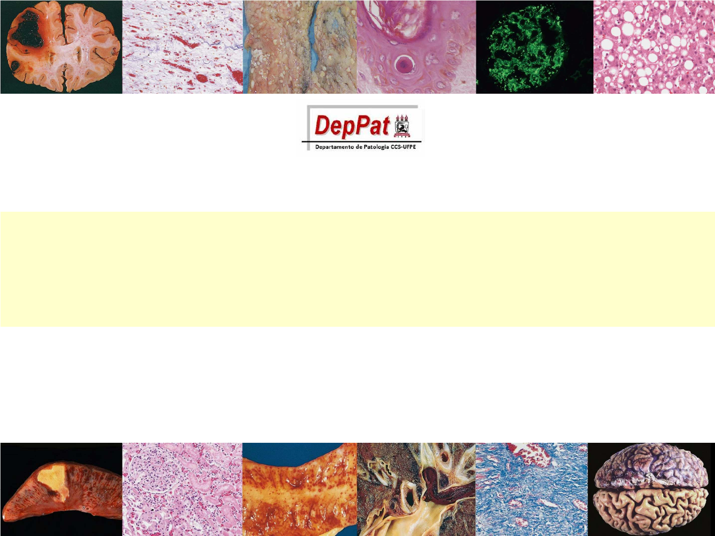 Processos Patológicos Gerais Processos Inflamatórios Agudos e Crônicos Ana Paula Fernandes Mac Inflamação Reação local dos tecidos vascularizados a um estímulo nocivo. Ocorre como resposta protetora caracterizada por uma série de alterações que tende a limitar os efeitos da agressão. Resposta benéfica do corpo frente a um estímulo lesivo caracterizada pelos “sinais cardinais”. Pode ser classificada: Inflamação Aguda (curta duração e inespecífica) Inflamação Crônica (longa duração e específico) Agentes inflamatórios: promovem a síntese de moléculas sinalizadoras que induzem os mediadores inflamatórios, resultando em saída de plasma e leucócitos dos vasos e em estímulos para reparar os danos produzidos pelas agressões. Sinais Cardinais CALOR RUBOR TUMOR DOR PERDA DE FUNÇÃO Processo Inflamatório 1. FENÔMENOS IRRITATIVOS 2. FENÔMENOS VASCULARES 3. FENÔMENOS EXSUDATIVOS 4. FENÔMENOS ALTERATIVOS 5. FENÔMENOS RESOLUTIVOS 6. FENÔMENOS REPARATIVOS O processo inflamatório envolve células do hospedeiro, vasos sanguíneos, proteínas e outros mediadores que tem como finalidade eliminar a causa inicial da lesão e as células necróticas, bem como iniciar o processo de reparo. Fenômenos Irritativos Iniciam a liberação de mediadores da inflamação através 1) PAMP (pathogen associated molecular pattern): agentes biológicos como bactérias, vírus, fungos, protozoários e helmintos. 2) DAMP (damage associated molecular pattern): agentes físicos e químicos capazes de induzir os tecidos agredidos a liberar moléculas que indicam a presença de agressão ↑mediadores pró-inflamatórios ↓mediadores anti-inflamatórios Fenômenos Vasculares São representados por modificações vasculares da microcirculação comandadas por mediadores liberados durante a fase irritativa Responsáveis pelo rubor observado macroscopicamente. Fenômenos Exsudativos Consistem na saída dos elementos do sangue – plasma e células – do leito vascular para o interstício. A exsudação plasmática (fluídos inflamatórios) precede a celular, sendo que a exsudação de leucócitos é o elemento morfológico mais característico das inflamações . EXSUDAÇÃO PLASMÁTICA EXSUDAÇÃO CELULAR marginação → adesão e rolamento → adesão e espraiamento→ transmigração Fenômenos Alterativos São causados por ação direta ou indireta do agente inflamatório e podem aparecer no início ou na evolução de uma inflamação. As degenerações e necroses são os fenômenos alterativos mais comuns e resultam da atividade das células do exsudato, de trombose na microcirculação e de fenômenos imunitários. Fenômenos Resolutivos Durante a resposta inflamatória, entram em ação mecanismos anti-inflamatórios locais que neutralizam o efeito dos fatores pró- inflamatórios. ↓mediadores pró-inflamatórios ↑mediadores anti-inflamatórios Estes fenômenos tem começam nas fases iniciais da inflamação e deles depende sua progressão com cura ou cronificação. Mecanismos: - Modificações em receptores das células locais e do exsudato. -Geração local de mediadores com efeitos anti-inflamatórios - Mudança no comportamento das células do exsudato, que tendem a apoptose ou passam a exercer função anti-inflamatória. Fenômenos Reparativos As degenerações e/ou necroses que ocorrem durante o processo inflamatório devem ser reparadas por regeneração ou cicatrização. Ocorre em paralelo a resolução e é coordenada por citocinas, quimiocinas e fatores de crescimento das céls. do exsudato MEDIADORES QUÍMICOS DA INFLAMAÇÃO (MQI) PRINCIPAIS AÇÕES DOS MQI Inflamação Aguda Resposta inespecífica e de curta duração. Os sinais inflamatórios comumente presentes são: eritema, edema e dor. No exsudato, predominam neutrófilos e macrófagos. Classificação (padrões morfológicos na inflamação aguda) • Inflamação Serosa • Inflamação Fibrinosa • Inflamação Supurativa ou Purulenta • Úlceras Fatores desencadeadores: infecções, traumas, necrose tecidual, corpo estranho e reações imunológicas. PADRÃO CELULAR DA INFLAMAÇÃO AGUDA Inflamação serosa Inflamação fibrinosa na pericardite Inflamação purulenta com formação de abcesso Pus: exsudato purulento rico em leucócitos mortos e agentes infecciosos. Pústula: i. purulentacircusncrita na pele e mucosas Abcesso: coleção de pus em cavidade neo-formada Flegmão: inflamação difusa (sem limites precisos) Empiema: coleção de pus em cavidade pré-formada Úlcera Inflamação Crônica Resposta específica e de longa duração. Consequência da persistência do agente agressor (biológico, físico, químico ou imunológico), que não foi eliminado na i. aguda. Classificação (padrão de resposta inflamatória) • Inespecíficas • Específicas (granulomatosas) Inflamação Crônica Inespecífica Quando a disposição dos diferentes elementos das reações não sugere sua etiologia. Exsudato inflamatório é rico em células linfomononucleares, proliferação de vasos sanguíneos e tecido conjuntivo fibroso. Inflamação Crônica Granulomatosa Quando os elementos das reações inflamatórias formam acúmulos nodulares circunscritos, chamados granulomas. As células predominantes sãos macrófagos e linfócitos. Células Epitelióides: macrófagos agrupam-se e formam pregas interdigitantes entre si, unindo-os de modo semelhante a céls. epiteliais. Geralmente causados por agentes imunogênicos, particulados ou insolúveis. Células Gigantes: do tipo corpo estranho ou de Langhans. Célula multinucleada, resultante da fusão de macrófagos. Inflamação crônica no pulmão Broncopneumonia aguda DOENÇAS COM INFLAMAÇÃO GRANULOMATOSA Caso Clínico Uma mulher de 70 anos de idade tem apresentado falta de ar que vem piorando há 1 semana. Ao exame físico, sua temperatura foi de 38,3°C. no exame de percussão, obervou-se um embotamento sobre os campos pulmonares esquerdos. A toracocentes