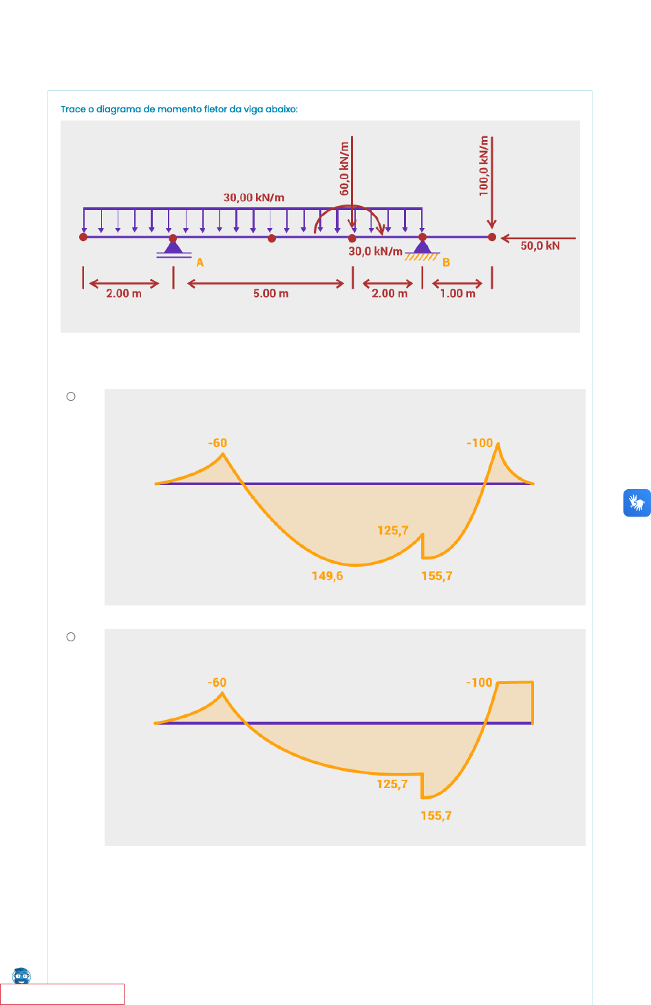 Questão 1 Ainda não respondida Vale 1,0 ponto(s). Trace o diagrama de momento fletor da viga abaixo: a. b. Tempo restante 0:08:19 c. d. e. Limpar minha escolha Tempo restante 0:08:19 Questão 2 Ainda não respondida Vale 1,0 ponto(s). Trace o diagrama do esforço cortante da viga abaixo: a. b. Tempo restante 0:08:19 c. d. e. Limpar minha escolha Tempo restante 0:08:19 Questão 3 Ainda não respondida Vale 1,0 ponto(s). A compreensão do conceito de rótulas é essencial para o cálculo das reações de apoio em estruturas rotuladas, bem como para a análise do comportamento dessas estruturas sob carregamentos diversos. Assinale a afirmativa que explica corretamente o que são rótulas. Escolha uma: a. Rótulas são consideradas vínculos de primeira ordem, pois restringem apenas o movimento horizontal entre os elementos conectados. b. Rótulas são consideradas vínculos de segunda ordem, pois restringem os movimentos verticais e horizontais entre os elementos conectados. c. Rótulas são consideradas vínculos de terceira ordem, pois restringem o giro e os movimentos verticais e horizontais entre os elementos conectados. d. Rótulas são consideradas vínculos de primeira ordem, pois restringem apenas o giro entre os elementos conectados. e. Rótulas são consideradas vínculos de segunda ordem, pois liberam o giro e o movimento horizontal entre os elementos conectados. Limpar minha escolha Tempo restante 0:08:19 Questão 4 Ainda não respondida Vale 1,0 ponto(s). O cálculo das reações de apoio em estruturas rotuladas é um tema fundamental no projeto e na análise de diversas estruturas. Já as rótulas são elementos que permitem a rotação entre as barras conectadas, o que torna o cálculo das reações de apoio em estruturas rotuladas um pouco mais complexo em comparação com as estruturas não rotuladas. Nesse contexto, calcule as reações de apoio da viga rotulada a seguir: Escolha uma: a. HA = 0; VA = 10kN(↑); MA = 0; VB = 10kN (↑). b. HA = 0; VA = 80; MA = 150kN.m (anti-horário); VB = 20kN (↑). c. HA = 0; VA = 20kN (↑); MA = 150kN.m (anti-horário); VB = 80kN (↑). d. HA = 0; VA = 10kN (↑); MA = 500kN.m (anti-horário); VB = 10kN (↑). e. HA = 0; VA = 50kN (↑); MA = 0; VB = 50kN(↑). Limpar minha escolha Tempo restante 0:08:19 http://publica.sagah.com.br/publicador/objects/layout/1376280895/2019-10-18-10-59-22-exercicio.jpg?v=432522986 http://publica.sagah.com.br/publicador/objects/layout/1376280895/2019-10-18-10-59-22-exercicio.jpg?v=432522986 Questão 5 Ainda não respondida Vale 1,0 ponto(s). O momento é calculado multiplicando-se a força pela distância perpendicular entre o ponto de rotação e a linha de ação da força. A figura a seguir mostra uma viga rotulada submetida a diferentes tipos de carregamentos. Para analisar o comportamento da estrutura, é necessário determinar o valor do momento na rótula da viga por meio da aplicação dos conceitos e técnicas estudados previamente. Nesse sentido, qual é o valor do momento da rótula em questão? Escolha uma: a. Zero. b. 200 kN.m. c. 400 kN.m. d. Momento máximo. e. 100 kN.m. Limpar minha escolha Tempo restante 0:08:19 http://publica.sagah.com.br/publicador/objects/layout/282290548/2019-10-18-10-59-22-exercicio5.jpg?v=1544120398 http://publica.sagah.com.br/publicador/objects/layout/282290548/2019-10-18-10-59-22-exercicio5.jpg?v=1544120398 Questão 6 Ainda não respondida Vale 1,0 ponto(s). Quais solicitações internas podemos encontrar no pórtico plano indicado na figura a seguir? Escolha uma: a. Esforço normal. b. Esforço normal e momento �etor. c. Esforço cortante e momento �etor. d. Esforço normal, esforço cortante e momento �etor. e. Esforço normal, esforço cortante e momento torsor. Limpar minha escolha Tempo restante 0:08:19 Questão 7 Ainda não respondida Vale 1,0 ponto(s). Calcule as equações de esforço cortante e momento fletor no trecho CD do pórtico indicado a seguir. Escolha uma: a. Q= 10; M= -5X b. Q= 10X²; M=-5X c. Q= 10X²; M=-5X³ d. Q= 0; M=-5X² e. Q= 10X; M=-5X² Limpar minha escolha Tempo restante 0:08:19 Questão 8 Ainda não respondida Vale 1,0 ponto(s). Quais solicitações internas podemos encontrar no pórtico plano indicado na figura a seguir? Escolha uma: a. Esforço normal e esforço cortante. b. Esforço cortante e momento �etor. c. Esforço normal, esforço cortante e momento torsor. d. Esforço normal e momento �etor. e. Esforço normal, esforço cortante e momento �etor. Limpar minha escolha Tempo restante 0:08:19 Questão 9 Ainda não respondida Vale 1,0 ponto(s). O diagrama de momento fletor desempenha um papel fundamental no dimensionamento adequado da armadura de uma estrutura, sendo crucial para garantir sua durabilidade e segurança. Com base no diagrama de corpo livre de um pórtico rotulado apresentado abaixo, determine os momentos fletores máximos positivo e negativo e selecione a opção correta que contém o diagrama de momento fletor correspondente a essa estrutura. a. Tempo restante 0:08:19 b. c. Tempo restante 0:08:19 d. e. Limpar minha escolha Tempo restante 0:08:19 Questão 10 Ainda não respondida Vale 1,0 ponto(s). A análise estrutural de pórticos rotulados requer a consideração de diversos parâmetros, sendo o diagrama de momento fletor um deles. Por exemplo, para determinar o momento fletor, deve-se considerar as cargas aplicadas, a geometria do pórtico, as condições de apoio, entre outros parâmetros. Nesse contexto e com base no diagrama de corpo livre abaixo de um pórtico rotulado, determine o diagrama de esforço cortante e assinale a opção correta. a. Tempo restante 0:08:19 b. c. Tempo restante 0:08:19 d. e. Limpar minha escolha Tempo restante 0:08:19 Questão 11 Ainda não respondida Vale 1,0 ponto(s). Projetou-se uma estrutura de arquibancada em concreto armado pré-moldado, sendo representado o diagrama de corpo livre na figura abaixo. Trata-se de um pórtico com rótula interna, em que há um c