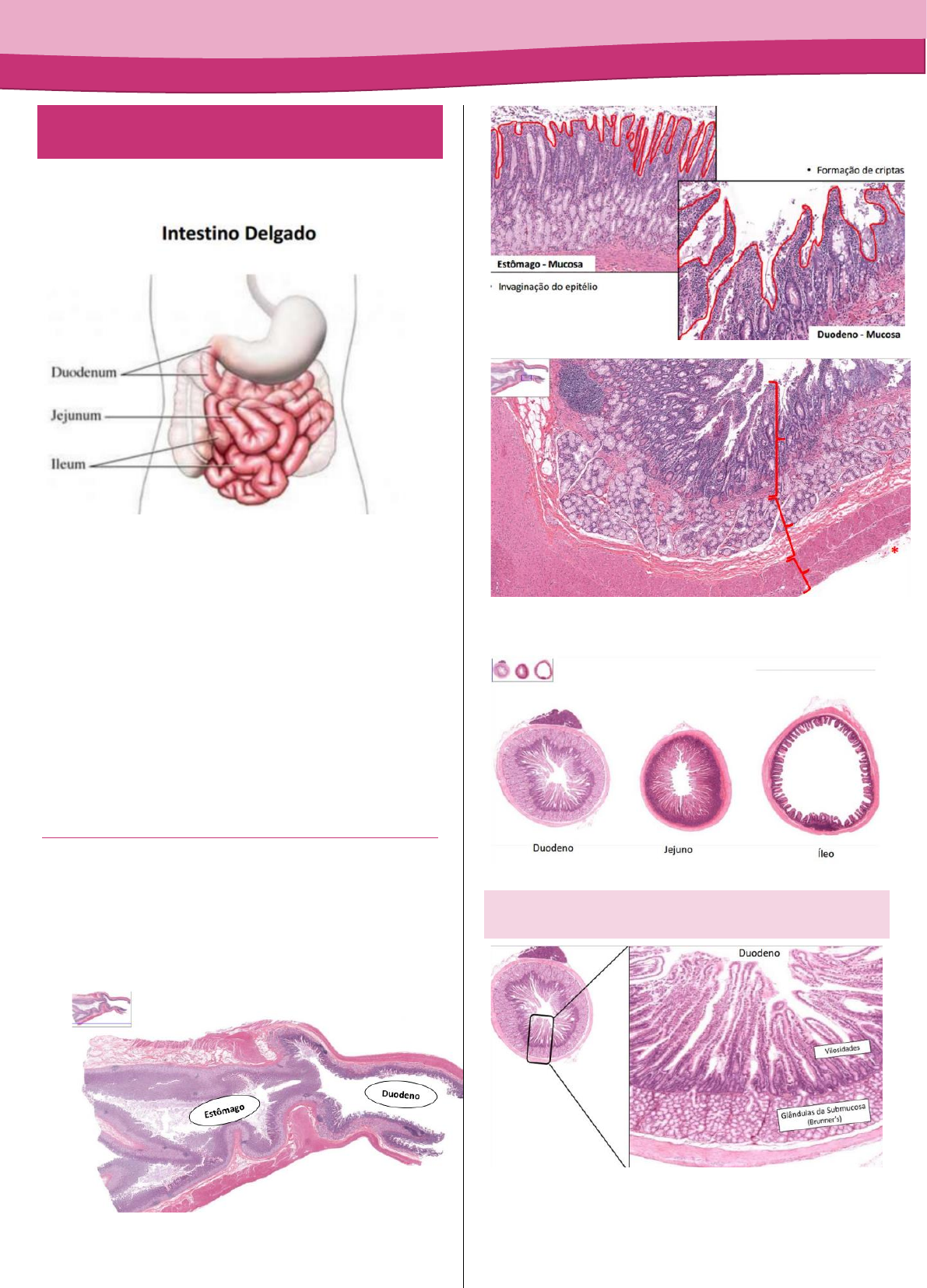 Título PATOLOGIA INTESTINAL INTESTINO DELGADO • Epitélio simples colunar rico em células caliciformes • Células de panet • Glândulas de Brunner • Galt • Componente mais longo do tubo gastrointestinal • Mede mais de 6m • É dividido em três partes anatômicas: - Duodeno - Jejuno - Íleo →PRINCIPAIS DIFERENÇAS ENTRE O INTESTINO E O ESTÔMAGO: • Não possui fossetas (invaginações); • Possui projeções em direção a luz (criptas e vilosidades). DUODENO • Vilosidades são maiores = melhorar a absorção dos nutrientes; • A luz do vaso é menor; • Mucosa e submucosa mais desenvolvida; • Presença de glândulas na submucosa (Glândulas de Brunett) – produzem bicarbonato que neutralizam a acidez. • Mucosa • Muscular da Mucosa • Submucosa – glândulas e tec. conjuntivo denso • Muscular – circular (interna) e longitudinal (externa) QUAIS SÃO AS CÉLULAS QUE REVESTEM O EPITÉLIO SIMPLES COLUNAR? São as células absortivas e as células caliciformes. • Células caliciformes = secretam muco • Células de defesa = lâmina própria • Enterócitos = células absortivas • Células tronco – ficam na base →ÓRGÃO QUE VAMOS ENCONTRAR MUITAS CÉLULAS DE DEFESA, SÃO CÉLULAS QUE RESIDEM ALI E NÃO PODE SER CONFUNDIDO COM INFILTRADO INFLAMATÓRIO. JEJUNO • Não tem glândulas na submucosa; • Projeções bem desenvolvidas; • Glândulas intestinais mais presentes ou criptas (semelhantes a glândulas). • Células de paneth: estão na base das criptas, no final da mucosa – entre a muscosa e submucosa. Possuem ação antibacteriana e antiparasitária, secretam lisozimas e defensinas. ÍLEO • GALT → submucosa – não é patológico, é um tecido linfoide associado ao TGI; • Placas de Peyer = aglomerado de folículos linfoides na região de Peyer – aglomerados dos linfócitos que ficam de prontidão caso tenha injúria; • Não tem glândulas na submucosa; • Luz muito maior; • Projeções discretas = não tem tanta necessidade de absorção. INTESTINO GROSSO • Epitélio simples colunar rico em células caliciformes, lâmina própria e células de defesa com predomínio de células mononucleares • Possui menos variações que o intestino delgado • Não tem vilosidades • As funções primárias do cólon são a reabsorção de fluídos e eletrólitos e a eliminação de alimentos não digeridos. • O cólon é composto pelas quatro camadas características do trato gastrointestinal. No entanto, nem vilosidades, nem pregas circulares estão presentes e as células caliciformes tornam-se mais frequentes • É na transição de região de sigmoide para reto que na maioria das vezes teremos os pólipos. CÓLON • Não tem vilosidades, diferente do intestino delgado; • Possui invaginações; • Glândulas intestinais; • Células absortivas; • Células de defesas. • Celulas de defesas • Células caliciformes com coloração feita para evidenciá-las • Células absortivas • Células absortivas do epitélio • Células caliciformes - vão secretar muco para lubrificar, facilitar o trânsito intestinal. TUMORES DO INTESTINO DELGADO • Extremamente raros; • 1 a 6% das neoplasias do trato digestivo; • Maioria benignos (60%); • Benignos: - Leiomioma - Adenoma - Lipoma • Malignos: - Linfoma - Tumor carcinoide - Adenocarcinoma TUMORES DO INTESTINO GROSSO →Tumores do intestino grosso, que são os pólipos não estão falando obrigatoriamente de câncer, porque tumor quer dizer aumento de volume. →Tem tumores que são considerados neoplásicos e não-neoplásicos • Pólipos: - “Toda estrutura com origem na sua sua parede, que se projeta em direção à luz, de forma circunscrita.” - Massa de tecido que se projeta para a luz intestinal - Podem ocorrer em qualquer região, mas são mais comuns no cólon/reto (área de transição) - Podem ocorrer no intestino delgado, estômago e esôfago - Lesões bem delimitadas e circunscritas - Os pólipos neoplásicos são classificados em adenoma (benigno) – possibilidade real de transformação para malignidade - e adenocarcinoma (maligno) → Sintomas: - Assintomáticos (maioria das vezes) – não tem manifestação - Podem provocar obstrução intestinal (quando volumosos) – sintomas mais evidentes - Sangramento – rompimento de vasos sanguíneos - Mucorreia - Exteriorização pelo ânus (quando muitos distais) → CLASSIFICAÇÃO: 1. Séssei ou pediculados 2. Isolados (esporádicos) ou múltiplos (síndromes hereditárias) 3. Não neoplásicos ou neoplásicos (adenomas) Obs.: O adenoma não é câncer, mas é uma transformação maligna. • Séssil • Pediculado PÓLIPOS HIPERPLÁSICOS • São os mais frequentes • Normalmente pequenos (0,1 à 1,0 cm) • Sésseis e múltiplos • Frequência aumenta com a idade • Sexta e sétima década de vida – 50 a 60 anos • Mais comum no retossigmoide • Sem potencial de evolução maligna →PATOGENIA: • Redução do turnover das células epiteliais (criptas colônicas) - Atraso na descamação das células epiteliais superficiais - Atividade mitótica está normal • Consequência: - Empilhamento das células - Aspecto serrilhado →HISTOPATOLÓGICO: • Criptas bem definidas • Alongadas e/ou ramificadas • Borda interna de aspecto serrilhado • Revestido por células absortivas e caliciformes PÓLIPOS HAMARTOMATOSOS • Proliferação de tecidos próprio do local • Maturação preservada, porém, quantidade aumentada (pólipos) • Podem ser isolados (esporádicos) ou sindrômicos ANTES: Más-formações (sem potencial de malignidade) DEPOIS: Mutações herdadas em oncogenes e supressores de tumor (risco de câncer) → PÓLIPO JUVENIL • Mais comum no reto de crianças (< 5 anos) • Pode ocorrer em jovens e adultos • Geralmente solitários • Coloração avermelhada • Superfície irregular • Geralmente pediculado (1,0 a 3,0 cm) • Maioria das vezes localizado no reto (transição