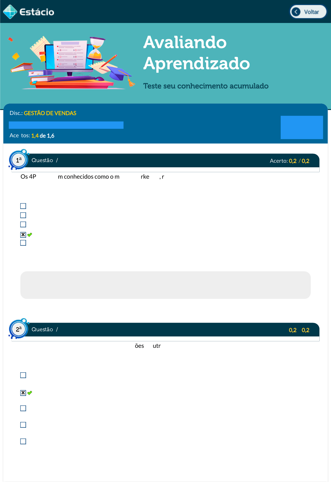 13/02/2024, 10:06 Estácio: Alunos https://simulado.estacio.br/alunos/ 1/4 Avaliando Aprendizado Teste seu conhecimento acumulado Disc.: GESTÃO DE VENDAS Aluno(a): AMANDA GABRIELLE DE SOUZA 202110196855 Acertos: 1,4 de 1,6 29/01/2024 Acerto: 0,2 / 0,2 Os 4Ps, também conhecidos como o mix de marketing, representam um conjunto de fatores- chave dentro do contexto, que visam à geração de posicionamento competitivo de mercado para um produto ou serviço. No mix de marketing, um dos 4Ps é Praça - termo que corresponde a: Estabelecer por quanto o produto poderá ser adquirido pelo consumidor. Inserir elementos de con�abilidade em um produto. Reconhecer que os consumidores mudam seus gostos quando estão em lugares diferentes. Levar produtos para os locais onde os clientes possam comprá-los. Utilizar lugares públicos para promover e vender produtos. Respondido em 29/01/2024 08:40:07 Explicação: A resposta correta é: Levar produtos para os locais onde os clientes possam comprá-los. Acerto: 0,2 / 0,2 Embora haja muitos treinamentos, certi�cações e outras formas de preparação, ainda é muito difícil garantir que o avaliador será 100% isento em uma avaliação de desempenho. Marque a alternativa correta quanto aos possíveis problemas apresentados por um avaliador nesse processo: Falta técnica - quando generaliza um trabalho, sem a capacidade de avaliar o ponto de vista sobre o desempenho, e toma sua decisão pelo bom senso. Desvalorização da avaliação - quando quem avalia dá prioridade apenas ao que lhe interessa e julga ser importante. Efeito Halo - quando o avaliador não tem o conhecimento técnico sobre o trabalho ou o próprio método de avaliação usado pela empresa. Recenticidade - quando ele apresenta sempre o mesmo padrão da avaliação anterior, aplicando a nota ou o conceito mais recente. Força do hábito - quando se força a considerar apenas os acontecimentos recentes para fazer sua avaliação. Respondido em 29/01/2024 08:40:32 Questão / 1 a Questão / 2 a https://simulado.estacio.br/alunos/inicio.asp https://simulado.estacio.br/alunos/inicio.asp javascript:voltar(); javascript:voltar(); 13/02/2024, 10:06 Estácio: Alunos https://simulado.estacio.br/alunos/ 2/4 Explicação: A resposta correta é: Desvalorização da avaliação - quando quem avalia dá prioridade apenas ao que lhe interessa e julga ser importante. Acerto: 0,2 / 0,2 A evolução da internet gera novas dinâmicas na relação com o consumidor e nas vendas. Várias empresas passaram a mobilizar diversos meios de compra, on-line e off-line, possibilitando que o consumidor transite por diferentes canais até consolidar sua compra. Essa nova realidade tem relação com o conceito de: Comércio eletrônico Pós-venda E-commerce Omnichannel Ponto de serviço Respondido em 29/01/2024 08:44:16 Explicação: A resposta correta é: Omnichannel Acerto: 0,2 / 0,2 Assinale a alternativa que melhor de�ne o principal objetivo do processo de avaliação de desempenho nas organizações: Ser o principal fator de justi�cativa no processo de demissão dos colaboradores com baixa performance em relação às competências do cargo. Reconhecer como alguém desempenha suas atividades de acordo com as competências e as responsabilidades de seu cargo. Ser o método pelo qual a organização divide e distribui os objetivos organizacionais da maior até a menor esfera em pedaços cada vez menores até chegar aos indivíduos. Segmentar os indicadores entre individuais e coletivos, cada um com um peso diferente. Justi�car o resultado da organização tanto para cada indivíduo isoladamente (seus aspectos individuais de desempenho) quanto para o coletivo (como as pessoas entregam os resultados em conjunto). Respondido em 29/01/2024 08:44:43 Explicação: A resposta correta é: Reconhecer como alguém desempenha suas atividades de acordo com as competências e as responsabilidades de seu cargo. Acerto: 0,2 / 0,2 O Índice de E�ciência das Vendas (IEV) é obtido pela razão entre as vendas efetivadas e as previstas, e seu resultado é expresso em porcentagem. A empresa Alfa estabeleceu uma previsão de vendas para o mês de março de determinado ano em R$230.000,00. A equipe de vendas superou as expectativas e atingiu um IEV igual a 115. Nesse caso, as vendas efetivas equivalem ao valor de: Questão / 3 a Questão / 4 a Questão / 5 a 13/02/2024, 10:06 Estácio: Alunos https://simulado.estacio.br/alunos/ 3/4 R$ 273.200,00 R$ 264.500,00 R$ 245.800,00 R$ 255.000,00 R$ 279.500,00 Respondido em 29/01/2024 08:47:24 Explicação: A resposta correta é: R$ 264.500,00 Acerto: 0,2 / 0,2 Aponte a alternativa que apresenta as etapas do processo de treinamento em vendas propostas por Ingram e demais autores (2009): Etapa 1: entender as necessidades da equipe; etapa 2: de�nir os objetivos que se espera alcançar a partir do programa de treinamentos; etapa 3: considerar as diferentes alternativas para a aplicação dos treinamentos; etapa 4: desenhar esse programa; etapa 5: aplicar os treinamentos previstos no programa; etapa 6: avaliar o programa e fazer os ajustes necessários. Etapa 1: considerar as diferentes alternativas para a aplicação dos treinamentos; etapa 2: desenhar o programa deles; etapa 3: avaliar o programa e fazer os ajustes necessários; etapa 4: aplicar aqueles previstos no programa; etapa 5: de�nir os objetivos que se espera alcançar a partir do programa de treinamentos; etapa 6: entender as necessidades da equipe. Etapa 1: de�nir os objetivos que se espera alcançar a partir do programa de treinamentos; etapa 2: entender as necessidades da equipe; etapa 3: considerar as diferentes alternativas para a aplicação dos treinamentos; etapa 4: aplicar aqueles previstos no programa; etapa 5: desenhar o programa de treinamentos; etapa 6: avaliar o programa e fazer os ajustes necessários. Etapa 1: desenhar o programa de treinamentos; etapa 2: de�nir os objetivos que se espera alcançar a partir 