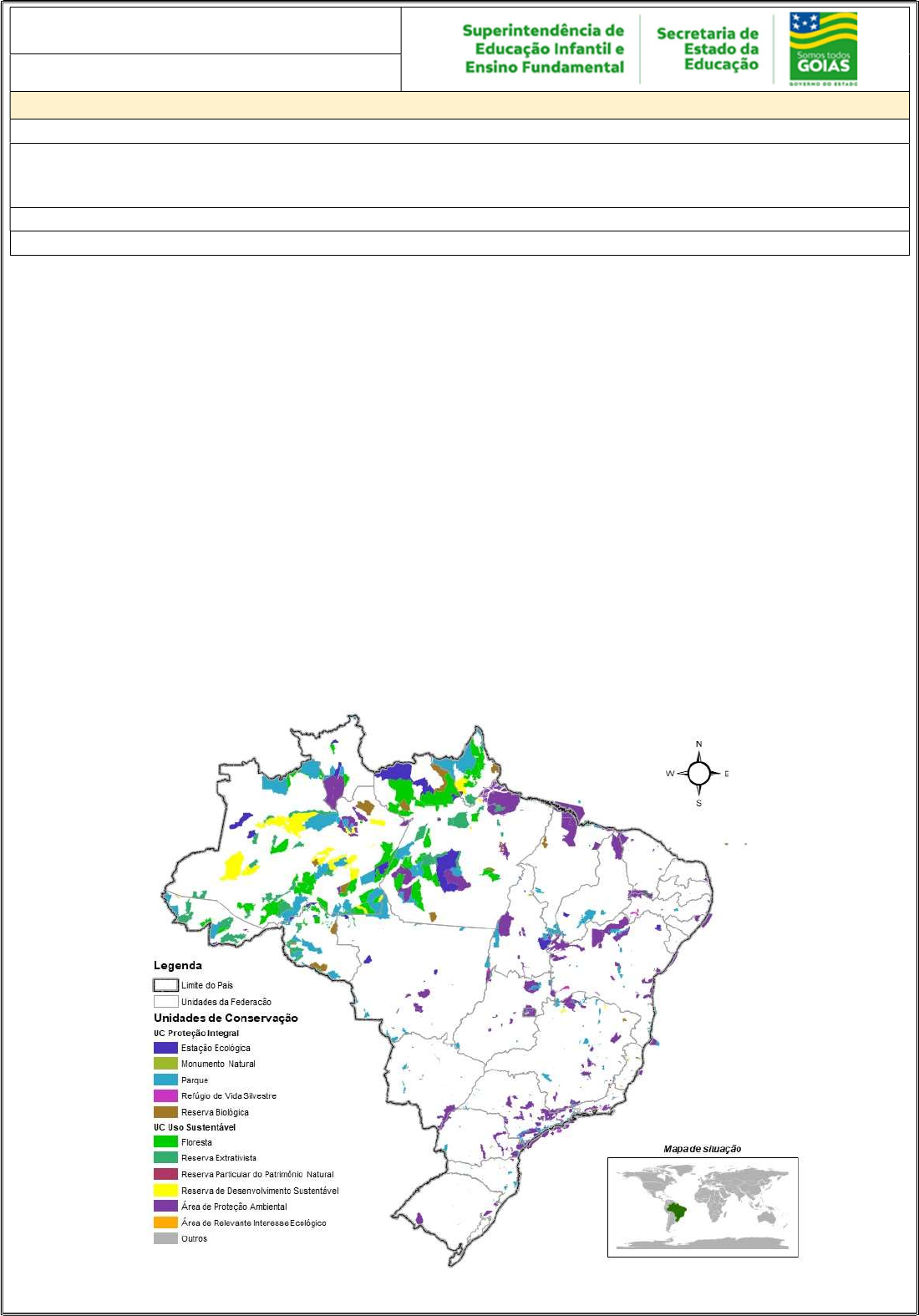 A importância das unidades de conservação para a preservação da biodiversidade e do patrimônio nacional Nosso planeta é rico em diversidade de vida, com grande quantidade de animais, plantas, fungos e microrganismos. Cada ser vivo desempenha papel fundamental para o equilíbrio do planeta, sendo necessário, portanto, que ocorra a preservação de todas as espécies. O Brasil é um dos países com maior biodiversidade no mundo. Seja em espécies de plantas, animais ou microrganismo, as terras e águas brasileiras são abundantes em formas de vida. Além disso, nosso país é um verdadeiro “baú” de riquezas minerais. O ambiente, além de fonte de recursos, é ecologicamente importante na manutenção dos regimes de chuvas, no clima, estabilidade de solos e nos chamados ciclos biogeoquímicos, através dos quais, elementos essenciais para a vida e as atividades humanas, são “reciclados” e voltam a estar disponíveis para todos nós. Entre esses ciclos destacam-se o do oxigênio, o do carbono, do nitrogênio e do fósforo. Sem os processos ecológicos e geológicos que os possibilitam, não seria possível haver agricultura, ou ar e água próprios para nossa utilização. Além disso, as contribuições ambientais nos quesitos paisagísticos, de turismo e de lazer são imensas, sem contar a relevância sociocultural ou até espiritual que apresentam para populações tradicionais como indígenas, ribeirinhos e quilombolas. Para que toda esta riqueza seja preservada, o Brasil protege muitas áreas naturais na forma de Unidades de Conservação (UC), o que, segundo o Ministério do Meio Ambiente (MMA), é uma “estratégia extremamente eficaz para a manutenção dos recursos naturais em longo prazo”. Unidades de Conservação do Brasil (2018). Disponível em: <https://tinyurl.com/x2mdyskj> Acesso em: 17 mar 2021. 9º ANO CIÊNCIAS DA NATUREZA ATIVIDADE 6 Tema: Preservação da biodiversidade. Habilidades Essenciais: (EF09CI12) Justificar a importância das unidades de conservação para a preservação da biodiversidade e do patrimônio nacional, considerando os diferentes tipos de unidades (parques, reservas e florestas nacionais), as populações humanas e as atividades a eles relacionados. NOME: UNIDADE ESCOLAR: Com o intuito de se organizar as UCs, otimizar seu processo de gestão, e facilitar a criação de novas áreas sob esta identidade foi criado, no ano 2000, o SNUC – Sistema Nacional de Unidades de Conservação. As unidades de conservação ambiental são espaços geralmente formados por áreas contínuas, institucionalizados com o objetivo de preservar e conservar a flora, a fauna, os recursos hídricos, as características geológicas, culturais, as belezas naturais, recuperar ecossistemas degradados, promover o desenvolvimento sustentável, entre outros fatores que contribuem para a preservação ambiental. A criação dessas UCs é de fundamental importância para a preservação dos ecossistemas, proporcionado pesquisas científicas, manejo e educação ambiental na busca pela conservação do meio ambiente. As UCs podem ser destinadas à exploração sustentável de recursos naturais, preservação total do ecossistema, realização de pesquisas, visitação para promover a educação ambiental etc. Essas unidades de conservação são divididas em dois grandes grupos: as de proteção integral e as de uso sustentável. As unidades de proteção integral são aquelas que não podem ser habitadas pelo homem e têm seu uso restrito ao turismo e à pesquisa. Existem cinco tipos de unidades de conservação de proteção integral: 1. Estações ecológicas – Nessa área o objetivo principal é preservar a natureza e garantir a realização de pesquisas. Nesse local, é proibida a visitação, exceto quando se tratar de visitas educacionais. 2. Reservas biológicas – São áreas voltadas para a preservação integral dos recursos nelas contidos e a visitação é permitida quando o objetivo é educacional. As pesquisas nesses locais necessitam de autorização do órgão que administra a reserva. 3. Parques nacionais – Nos parques, além de preservação, são desenvolvidas pesquisas, atividades educacionais e o turismo ecológico. 4. Monumentos naturais – Têm como objetivo preservar locais raros e de grande beleza. A visitação só pode ser realizada após autorização da administração da unidade de conservação. 5. Refúgios da vida silvestre – Nessas áreas a preservação é voltada para garantir a permanência e a reprodução das comunidades da fauna e flora locais. As pesquisas e a visitação também necessitam de autorização. As unidades de conservação de uso sustentável são aquelas em que o homem pode estabelecer-se, entretanto, o uso dos recursos naturais deve acontecer de maneira sustentável. Isso quer dizer que a exploração não pode ser exagerada, preocupando-se com as gerações futuras. Essas unidades são divididas em sete grupos: 1. Áreas de proteção ambiental – Área ampla, pública ou privada, que apresenta importantes recursos naturais. As pesquisas e visitações dependem da autorização da administração. 2. Áreas de relevante interesse ecológico - Área pequena, pública ou privada, que apresenta características naturais extremamente importantes, tais como a presença de espécies raras. 3. Florestas nacionais – Área de posse e domínio público com cobertura florestal e espécies nativas. As pesquisas e visitações são permitidas dentro das normas estabelecidas pela administração da unidade de conservação. 4. Reservas extrativistas – Área concedida às populações que realizam atividades extrativistas tradicionais. As pesquisas e visitações são permitidas dentro das normas estabelecidas pela administração da unidade de conservação. 5. Reservas de fauna – Área de posse e domínio público com fauna nativa que é usada basicamente para pesquisas. As visitações são permitidas