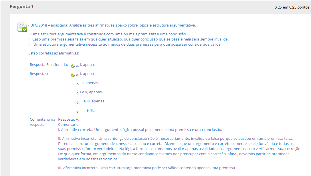 I. Uma estrutura argumentativa é construída com uma ou mais premissas e uma conclusão. II. Caso uma premissa seja falsa em qualquer situação, qualquer conclusão que se baseie nela será sempre inválida. III. Uma estrutura argumentativa necessita ao menos de duas premissas para que possa ser considerada. a. apenas. b. III, apenas. c. I e II, apenas. d. I e III, apenas. e. II e III, apenas.