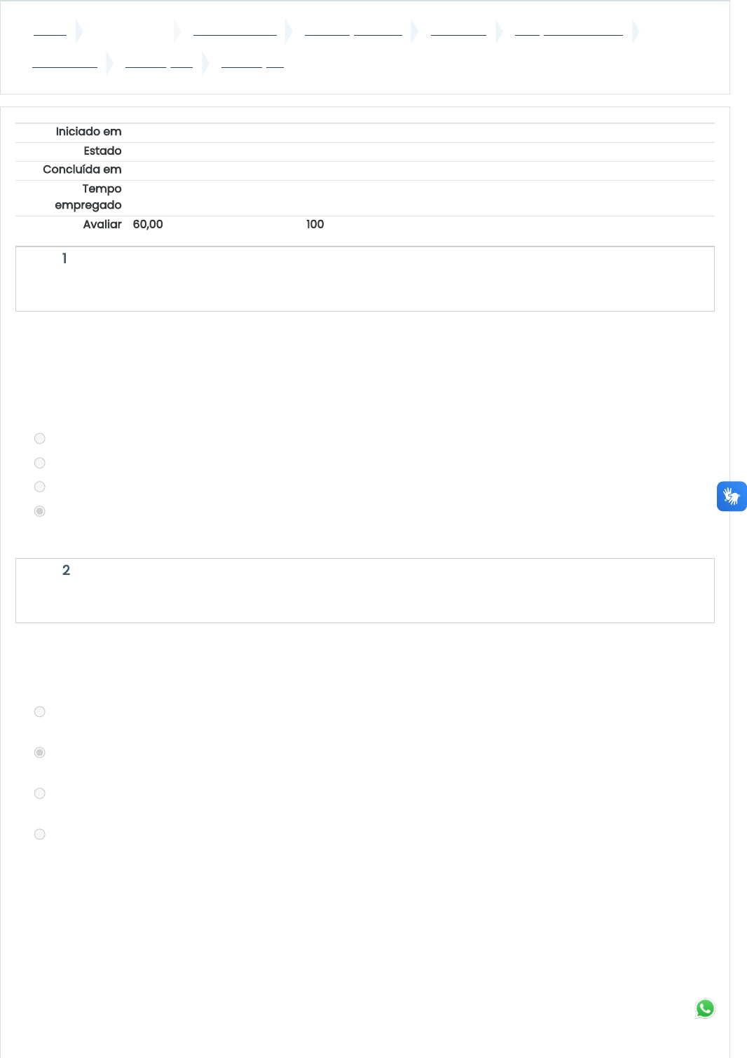 Painel Meus cursos CURSOS FUNEC Graduação - EAD Aluno EAD JUNÇÕES DE TURMA Olericultura AVALIAÇÕES AVALIAÇÃO Iniciado em Wednesday, 7 Feb 2024, 13:26 Estado Finalizada Concluída em Wednesday, 7 Feb 2024, 15:04 Tempo empregado 1 hora 37 minutos Avaliar 60,00 de um máximo de 60,00(100%) Questão 1 Completo Atingiu 3,00 de 3,00 Questão 2 Completo Atingiu 3,00 de 3,00 Para a prática de poda é interessante conhecer a classificação das gemas com relação às suas funções, que são: ______. Assinale a alternativa que preencha corretamente a lacuna. Escolha uma opção: a. Formação, Vegetativa e Frutífera b. Florífera, Mista e Frutífera c. Vegetativa, Florífera e Frutífera d. Vegetativa, Florífera e Mista Em relação aos cuidados com as mudas em viveiros, é CORRETO afirmar que: Escolha uma opção: a. Deve-se realizar o manejo adequado de pragas e doenças no viveiro, removendo a planta doente do local logo após a detecção de algum problema para esta não transmitir a doença às outras mudas. b. A rega das mudas pode ser feita manualmente ou até mesmo utilizando mecanismos automáticos, desde que sejam respeitadas as particularidades e necessidades da planta para não ocorrer o excesso ou a falta de água. c. Somente mudas com deficiência de nutrientes deve receber a adubação específica, não sendo necessário fazer nenhuma preparação ou cuidado especial com as mudas comuns. d. Para controle de pragas nos viveiros, é recomendado utilizar apenas do controle químico ou físico, jamais o controle mecânico (remoção direta da planta). https://ava.funec.br/my/ https://ava.funec.br/course/index.php?categoryid=10 https://ava.funec.br/course/index.php?categoryid=17 https://ava.funec.br/course/index.php?categoryid=19 https://ava.funec.br/course/index.php?categoryid=77 https://ava.funec.br/course/view.php?id=1990 https://ava.funec.br/course/view.php?id=1990#section-6 https://ava.funec.br/mod/quiz/view.php?id=25392 Questão 3 Completo Atingiu 3,00 de 3,00 Questão 4 Completo Atingiu 3,00 de 3,00 O principal objetivo da semeadura é realizar a implantação da cultura de forma adequada, buscando alcançar os maiores rendimentos possíveis, falhas na regulagem e na semeadora podem ocasionar diminuição do estande inicial de plantas entre outros problemas associados, não passíveis de serem corrigidas em etapas posteriores. Neste sentido, considere a implantação e 1 hectare de milho, com espaçamento entre sulcos de 0,6 m, densidade de 70.000 sementes emergidas/ha, pureza de 99% e o poder germinativo de 96%. A quantidade de sementes por metro linear será: Escolha uma opção: a. 4 – 4 b. 3 – 3 c. 6 d. 4 – 5 O sistema de capacidade de uso das terras (Lepsch et al., 2015) propõe a classificação do uso máximo das terras de uma determinada área, para auxiliar a elaboração de planos de manejo sustentáveis para propriedades rurais e bacias hidrográficas. Dentre as limitações que caracterizam as subclasses deste sistema, assinale a alternativa que apresenta corretamente uma dessas limitações ou deficiências. Escolha uma opção: a. E – Limitações por excesso de água b. M – Limitações por mecanização c. A – deficiência de oxigênio d. S – Limitações devidas ao sistema Questão 5 Completo Atingiu 3,00 de 3,00 Questão 6 Completo Atingiu 3,00 de 3,00 Leia o texto a seguir: “Bactrocera carambolae (mosca-da-carambola) é uma espécie de grande relevância à fruticultura devido ao ataque a diversas plantas de importância agrícola (carambola, manga, tomate, laranja, limão, acerola, caju, goiaba, jambo, pimenta, entre outras). Sua origem é asiática e em 1975 foi introduzida no continente americano através do Suriname. No Brasil, sua primeira detecção ocorreu em 1996 no município de Oiapoque (Amapá). Atualmente há confirmação de sua presença em três estados – Amapá (AP), Pará (PA) e Roraima (RR). Por ser considerada uma das maiores ameaças fitossanitárias à fruticultura brasileira (mesmo sob controle constitui risco à economia agrícola), ter distribuição restrita e estar sob controle oficial, o Ministério da Agricultura, Pecuária e Abastecimento (MAPA) categoriza essa espécie como praga quarentenária presente (PQP) para o país. [...] O maior risco de introdução da praga é através de partes vegetais contaminados, principalmente frutos. A presença da praga afeta diretamente na economia, pois os produtores da região que tenha registrado foco da praga são impedidos de comercializar para que a praga não seja levada de uma região para a outra. Anteriormente, foram definidos pelo MAPA os procedimentos oficiais de vigilância que devem ser adotados em todo o país para as ações de prevenção, contenção, supressão e erradicação da B. carambolae. Nesta legislação consta o detalhamento das medidas a serem aplicadas no caso de constatação da praga, assim como a orientação sobre o trânsito de frutos de espécies hospedeiras da praga provenientes de áreas sob quarentena, protegidas ou onde a praga já se encontra erradicada, além do trânsito interestadual. ” Acerca das atividades do Sistema Nacional de Sementes e Mudas – SNSM, julgue as afirmativas a seguir sobre suas áreas de competência. I – Análise de sementes. II – Produção de mudas. III – Registro Nacional de Certificação – RNC. IV – Registro Nacional de Sementes e Mudas – RENASEM. V – Comercialização e utilização de sementes e mudas. Escolha uma opção: a. Somente IV b. I e II c. I III V d. II e IV Sobre os conhecimentos acerca do RENASEM – Registro Nacional de Sementes e Mudas, assinale a alternativa correta. Escolha uma opção: a. As pessoas físicas ou jurídicas que importem sementes ou mudas para uso próprio em sua propriedade, ou em propriedades de terceiros cuja posse detenham, devem se registrar no RENASEM b. O credenciamento no RENASEM do responsável técnico é feito somente junto ao MAPA c. O 