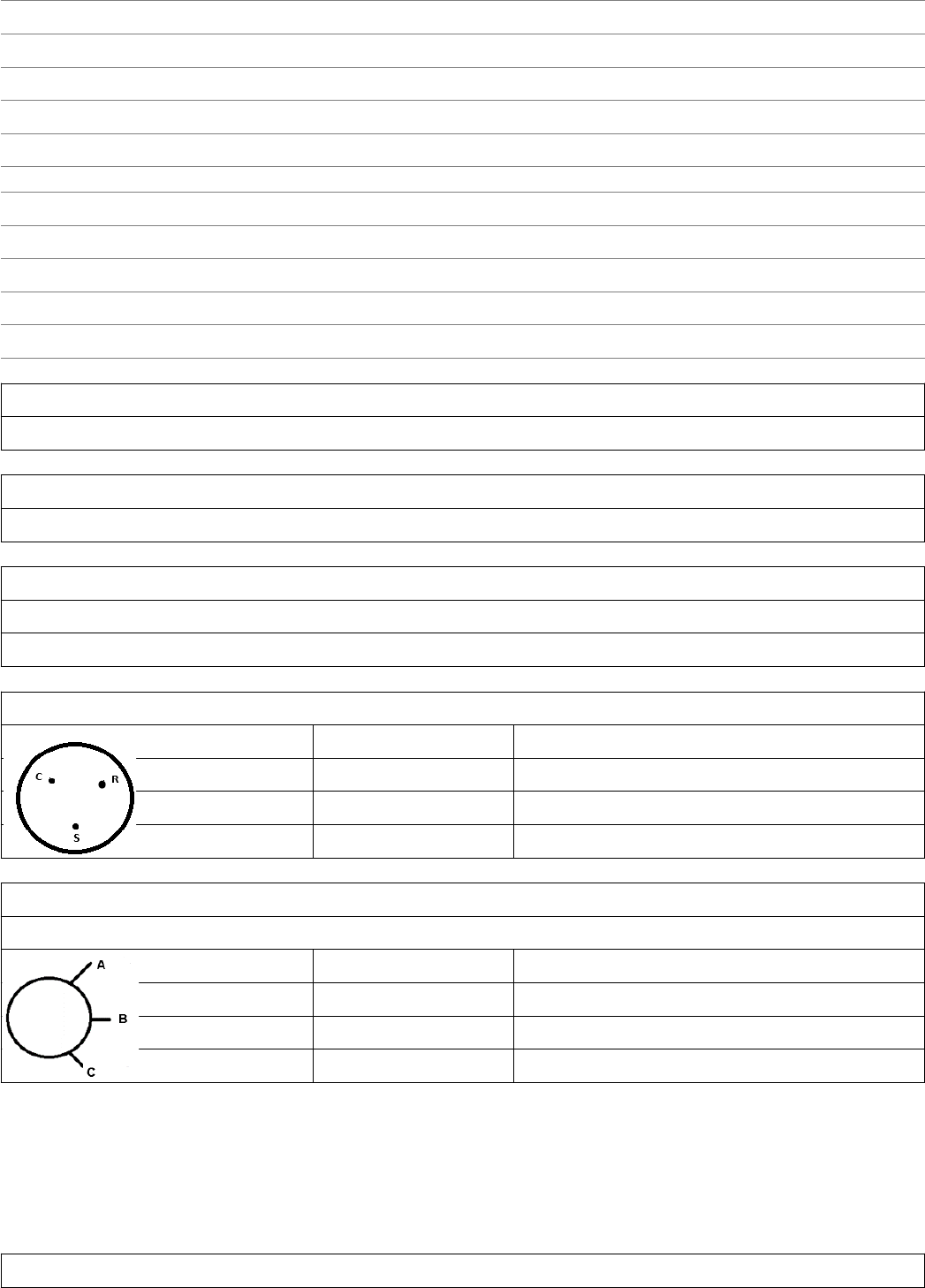 CHECKLIST COMPRESSOR DADOS DO CLIENTE NOME: CONTATO: RUA N° CIDADE: DADOS DO AR CONDICONADO MARCA: MODELO: CAP.: BTUS GAS: PRESSÃO ATUAL: PSI TIPO: ☐ SPLIT HI-WALL ☐SPLIT INVERTER ☐PISO TETO ☐CASSETE ☐JANELA ☐MULTI SPLIT ☐PORTATIL TESTE CONTROLE REMOTO ☐ IR CAMERA ☐AUTO COOL ☐ TESTE DISPLAY SITUAÇÃO DOS DUTOS (SE CONGELADO) ☐ DUTO DE ALTA PRESSÃO ☐DUTO DE ALTA PRESSÃO ☐ AMBOS SISTEMA ELÉTRICO TENSÃO: ☐ 110V ☐ 220V DISJUNTOR: MEDIÇÃO TENSÃO: MEDIÇÃO CORRENTE: TESTE CAPRESSOR (ALICATE AMPERIMETRO 200 Ω) TESTE CONT. TESTE COND. TESTE DE RESISTENCIA OHMICA C + R = C + R = C + R = C + S = C + S = C + S = S + R = S + R = S + R = TESTE COMPONENTES (ALICATE AMPERIMETRO 2K Ω) COMPONENTE: ☐MOTOR VENT. EVAPORADOR ☐MOTOR VENT. CONDENSADORA TESTE CONT. TESTE COND. TESTE DE RESISTENCIA OHMICA A + B = A + B = A + B = A + C = A + C = A + C = B + C = B + C = B + C = TESTE COMPONENTES (ALICATE AMPERIMETRO 2K Ω) COMPONENTE: ☐MOTOR VENT. EVAPORADOR ☐MOTOR VENT. CONDENSADORA TESTE CONT. TESTE COND. TESTE DE RESISTENCIA OHMICA A + B = A + B = A + B = A + C = A + C = A + C = B + C = B + C = B + C = TESTE COMPONENTES (ALICATE AMPERIMETRO 2K Ω) COMPONENTE: ☐CAPACITORSIMPRES COMPRESSOR ☐CAPACITOR SIMPLES MOTOR DO VENTILADOR ☐CAPACITOR DUPLO TESTE CONTINUIDADE TESTE DE CAPACIMETRO CORRENTE = CAPACITOR = µF POLO A + CARCAÇA = LEITURA = µF POLO B + CARCAÇA = AVALIAÇÃO: ☐BOM ☐SUSBTITUIR TESTE COMPONENTES (ALICATE AMPERIMETRO 2K Ω) COMPONENTE: ☐CAPACITORSIMPRES COMPRESSOR ☐CAPACITOR SIMPLES MOTOR DO VENTILADOR ☐CAPACITOR DUPLO TESTE CONTINUIDADE TESTE DE CAPACIMETRO CORRENTE = CAPACITOR = µF POLO A + CARCAÇA = LEITURA = µF POLO B + CARCAÇA = AVALIAÇÃO: ☐BOM ☐SUSBTITUIR