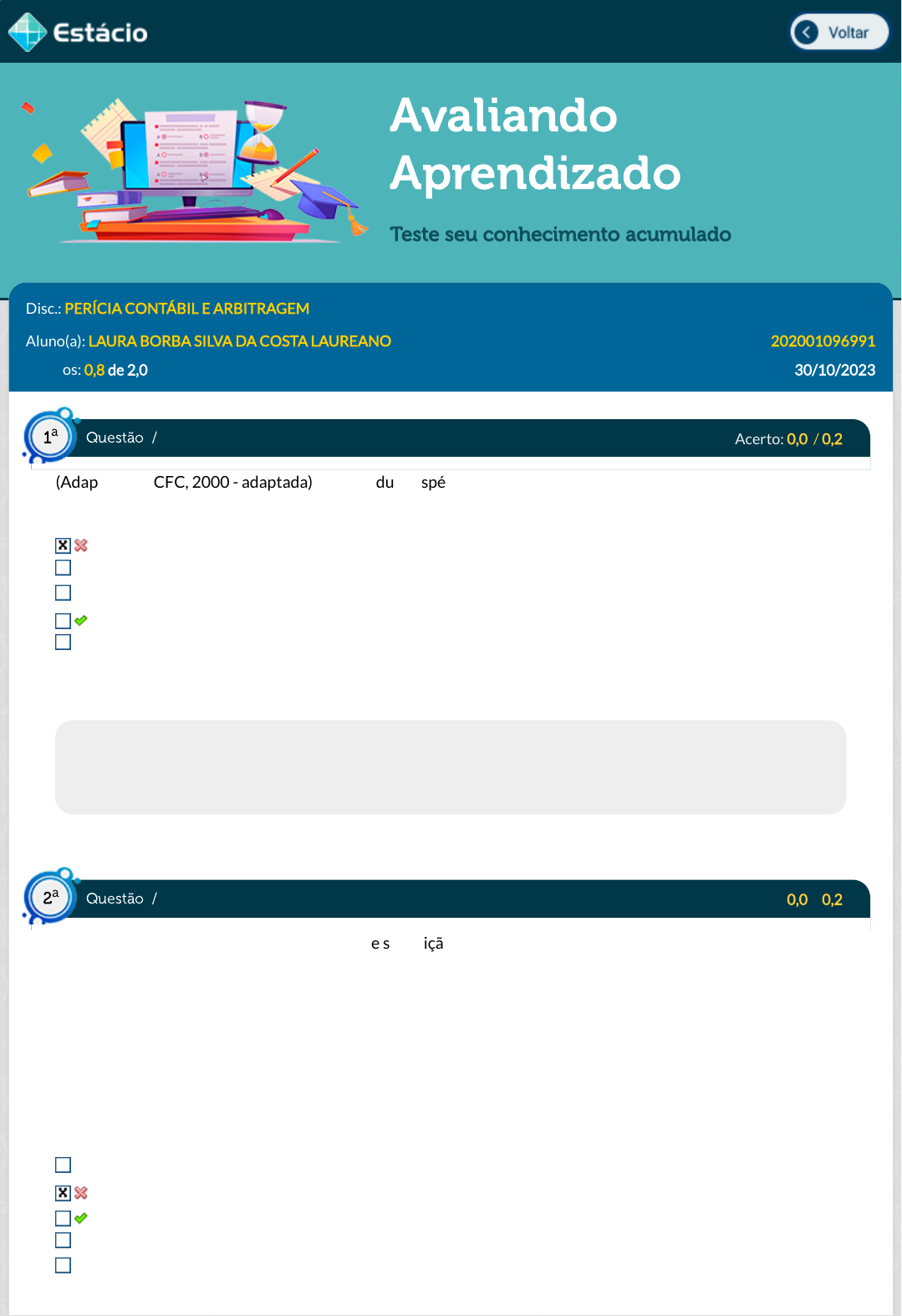Avaliando Aprendizado Teste seu conhecimento acumulado Disc.: PERÍCIA CONTÁBIL E ARBITRAGEM Aluno(a): LAURA BORBA SILVA DA COSTA LAUREANO 202001096991 Acertos: 0,8 de 2,0 30/10/2023 Acerto: 0,0 / 0,2 (Adaptada de CFC, 2000 - adaptada) Existem duas espécies de perícia contábil. Das espécies de Perícia Contábil, assinale a que é realizada por necessidade e escolha de entes físicos e jurídicos particulares - privados: Perícia Judicial. Perícia Semi-Judicial. Perícia legal. Perícia Extrajudicial. Perícia Particular. Respondido em 30/10/2023 15:45:35 Explicação: Das espécies de Perícia Contábil, a perícia extrajudicial é a que é realizada por necessidade e escolha de entes físicos e jurídicos particulares - privados. Acerto: 0,0 / 0,2 De acordo com a NBC PP 01 (R1) são casos de suspeição e impedimento a que está sujeito o perito nomeado I. ser amigo íntimo de qualquer das partes; II. ser inimigo capital de qualquer das partes; III. aconselhar, de alguma forma, parte envolvida no litígio acerca de objeto fora da discussão. Depois da análise dos itens assinale a alternativa correta. Apenas os itens I e III estão corretos. Apenas o item I está correto. Apenas os itens I e II estão corretos. Apenas os itens II e III estão corretos. Apenas o item II está correto. Respondido em 30/10/2023 15:47:06 Questão / 1 a Questão / 2 a https://simulado.estacio.br/alunos/inicio.asp https://simulado.estacio.br/alunos/inicio.asp javascript:voltar(); javascript:voltar(); Explicação: Aconselhar, de alguma forma, parte envolvida no litígio acerca de objeto da discussão é que representa um caso de suspeição e impedimento a que está sujeito o perito nomeado. Acerto: 0,2 / 0,2 (FUNDATEC/2019) As Normas Brasileiras de Contabilidade (NBC) de�nem os conceitos e normas acerca da Auditoria Contábil e da Perícia Contábil, restando claro do exame das referidas normas a distinção entre uma coisa e outra. Em relação a tais diferenças, analise as assertivas abaixo: I. A auditoria contábil é uma técnica contábil que consiste na veri�cação e �dedignidade dos dados contidos nas demonstrações contábeis por meio do exame minucioso dos registros da contabilidade e dos documentos que a eles deram origem. II. A perícia contábil constitui o conjunto de procedimentos técnico-cientí�cos destinados a levar à instância decisória elementos de prova necessários a subsidiar a justa solução do litígio ou constatação de fato. III. Enquanto a auditoria apresenta seu resultado expressando uma opinião por meio do relatório de auditoria, o perito apresenta o resultado da perícia com um laudo pericial contábil ou parecer técnico-contábil. Quais estão corretas? III I I e II II I, II e III Respondido em 30/10/2023 15:47:57 Explicação: A auditoria contábil é uma técnica contábil que consiste na veri�cação e �dedignidade dos dados contidos nas demonstrações contábeis por meio do exame minucioso dos registros da contabilidade e dos documentos que a eles deram origem, já a perícia contábil constitui o conjunto de procedimentos técnico-cientí�cos destinados a levar à instância decisória elementos de prova necessários a subsidiar a justa solução do litígio ou constatação de fato. A auditoria apresenta seu resultado expressando uma opinião por meio do relatório de auditoria e o perito apresenta o resultado da perícia com um laudo pericial contábil ou parecer técnico-contábil. Acerto: 0,2 / 0,2 A NBC prevê, entre outras coisas, alguns objetivos do planejamento da perícia. Em relação a NBC TP 01 analise as a�rmações a seguir. I. O planejamento da perícia é a etapa do trabalho pericial, na qual o perito estabelece as diretrizes e a metodologia a serem aplicadas. II. O planejamento deve ser realizado pelo assistente técnico ainda que o trabalho venha a ser realizado de forma conjunta. III. Elaborado o plano de trabalho pericial, o perito pode convidar os assistentes técnicos para uma reunião de trabalho, presencial ou por meio eletrônico, para dar conhecimento do planejamento da execução do trabalho Questão / 3 a Questão / 4 a pericial. Diante das a�rmações assinale a alternativa correta. Apenas as a�rmações I e II estão corretas. Apenas a a�rmação III está correta. Apenas a a�rmação I está correta. Apenas a a�rmação II está correta. Apenas as a�rmações I e III estão corretas. Respondido em 30/10/2023 15:48:43 Explicação: O planejamento deve ser realizado pelo perito nomeado ainda que o trabalho venha a ser realizado de forma conjunta. Acerto: 0,2 / 0,2 (FUNDATEC, 2014) Dentre os procedimentos de perícia contábil, a ___________ é o ato de quali�cação e quanti�cação física de coisas, bens, direitos e obrigações. A lacuna do trecho acima �ca corretamente preenchida por: Mensuração. Indagação. Vistoria. Investigação. Certi�cação. Respondido em 30/10/2023 15:49:27 Explicação: A mensuração é o ato de quali�cação e quanti�cação física de coisas, bens, direitos e obrigações. Acerto: 0,2 / 0,2 (CFC/2017 - Adaptado) À luz da NBC PP 01 - Perito Contábil, analise a seguinte situação: O contador Y, em 15/6/20X1, aconselhou o Sr. Z a respeito da situação patrimonial de uma sociedade empresarial, objeto de uma discussão societária em um litígio judicial. Em 1º/7/20X1, o Contador Y tomou ciência de sua nomeação para a função de perito do juízo, ocorrida em 1º/6/20X1, e constatou que o Sr. Z é parte do citado litígio judicial. Marque a opção CORRETA que apresenta a atitude a ser tomada pelo contador Y no processo judicial que fora nomeado para a função de perito do juízo. Aceitar o encargo porque o aconselhamento ocorreu quando ainda não sabia de sua nomeação, �cando assim afastada a hipótese de suspeição. Aceitar o encargo visto que o aconselhamento dado à parte ocorreu após sua nomeação. Questão / 5 a Questão / 6 a Recusa