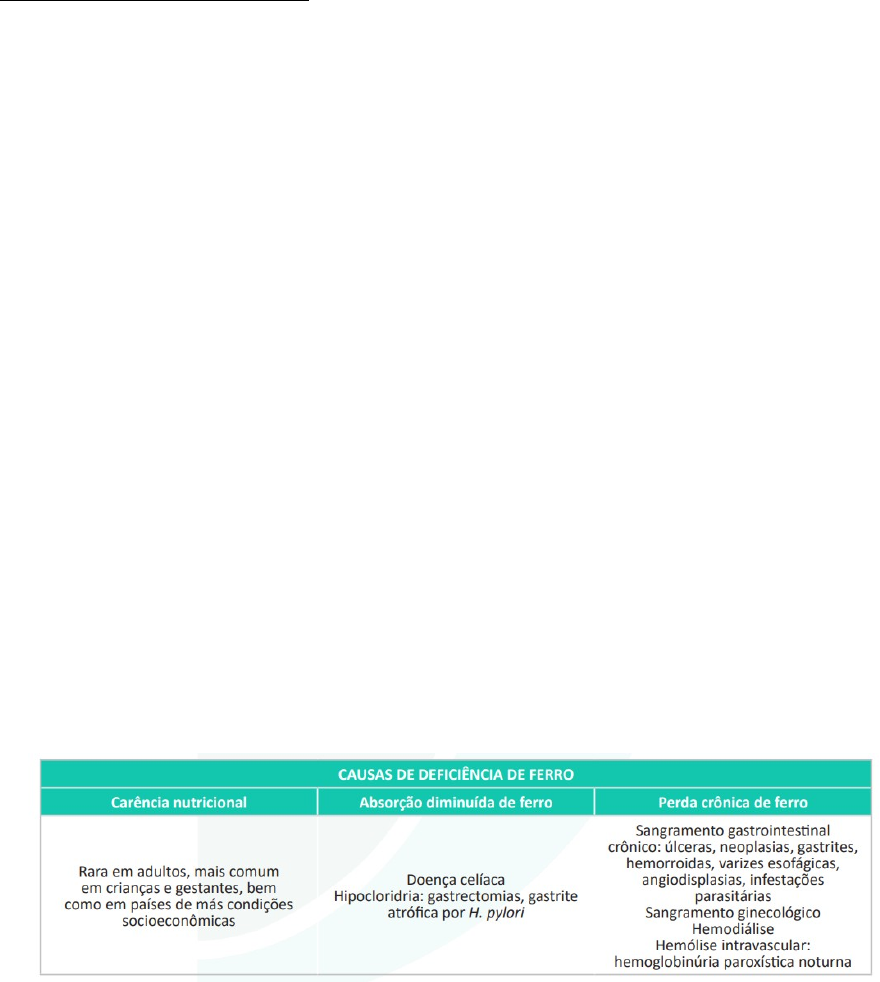 Compreender a etiopatogenia e fatores de risco da anemia As anemias podem ser divididas em anemia hiper e hipoproliferativa. - Anemias hipoproliferativas: São chamadas de hipoproliferativas as anemias que cursam com uma resposta medular insuficiente, ou seja, com uma queda no número de reticulócitos. Nesse grupo, temos anemias carenciais (ferropriva e megaloblásticas), anemia sideroblástica e as anemias causadas por doenças crônicas. 1. Anemia ferropriva – O ferro é um componente essencial da molécula de hemoglobina, sendo o responsável pela ligação com o oxigênio transportado. É absorvido pela dieta, principalmente no duodeno, sob sua forma heme (ferro ferroso, de origem animal) ou não heme (ferro férrico, de origem vegetal). Em seu estado férrico (Fe3+) deve ser convertido na forma ferrosa (Fe2+) para adentrar os enterócitos, o que é feito por enzimas na membrana entérica e favorecido por ambiente ácido. Após adentrar os enterócitos, o ferro é ligado à transferrina, seu principal transportador sérico, que leva o mineral à medula óssea para a produção de hemoglobina. Todo o ferro não utilizado é armazenado no interior dos hepatócitos sob a forma de ferritina. Normalmente, não há excreção de ferro, exceto por perdas via sangramento (como menstrual) e descamação dos enterócitos. Causas de AF, ou de deficiência de ferro são o uso prolongado de inibidores da bomba de prótons e a cirurgia bariátrica, que podem acarretar má absorção do ferro. Não é comum a deficiência por falta de ingestão desse metal, exceto em crianças em regime alimentar restrito ao leite por períodos prolongados, pois o leite é relativamente pobre em ferro. Qualquer que seja sua causa, a anemia ferropriva será o estágio final de três fases progressivas, iniciadas por um balanço negativo de ferro. Seja por menor absorção ou maior perda, essa depleção do ferro corporal faz com que suas reservas (ferritina) sejam consumidas para mantê-lo circulante, até que sejam completamente absorvidas e, assim, cai o nível sérico de ferro, com menor quantidade do mineral chegando à medula óssea. 2. Anemia da doença crônica – É causa comum de anemia em pacientes com doenças inflamatórias crônicas ou malignas. A hepcidina tem papel fundamental na sua instauração. A anemia de doença crônica é um quadro secundário a doenças inflamatórias crônicas, como infecções, neoplasias, doenças inflamatórias intestinais e doenças reumatológicas, em que há produção aumentada de citocinas. Essas substâncias inflamatórias, especialmente a interleucina 6 (IL-6), agem de diversas formas, inibindo a produção de hemácias. As citocinas inibem a produção de eritropoetina e diminuem a responsividade da medula óssea a esse hormônio renal estimulante da eritropoiese. Seu mecanismo de ação principal, no entanto, é o aumento da produção de hepcidina. A hepcidina é um hormônio hepático que degrada a ferroportina, transportadora transmembrana de ferro. Quando as citocinas aumentam a secreção de hepcidina, há maior degradação de ferroportina e, assim, o ferro fica aprisionado nas células: os enterócitos, que absorvem o ferro, e os macrófagos hepáticos, que armazenam o ferro, não conseguem lançá-lo à circulação. Cria-se, assim, um estado em que há ferro no organismo, mas ele não está disponível à medula óssea para a produção de hemoglobina, levando à instalação de uma anemia hipoproliferativa normocítica e normocrômica, que pode ser hipo/micro em estágios avançados. 3. Anemia sideroblástica – A anemia sideroblástica é definida como uma anemia refratária com presença de sideroblastos em anel na medula óssea (mais do que 15%) — são eritroblastos anormais com muitos grânulos de ferro, dispostos como um anel em torno do núcleo (em geral, temos grânulos de ferro distribuídos de forma aleatória no citoplasma dos eritroblastos). Encontramos também hiperplasia da série eritroide, com eritropoiese ineficaz. 4. Anemia megaloblástica – Essas anemias são causadas por um defeito na síntese do DNA, que faz com que a célula demore anormalmente para se dividir, permanecendo com um núcleo imaturo e um citoplasma aumentado. Quando não há divisão em tempo hábil, surgem células de tamanho aumentado. As principais causas disso são a deficiência de cobalamina (vitamina B12) e ácido fólico (vitamina B9 ou folato). A carência de um ou os dois desses nutrientes leva a um comprometimento da síntese de bases nitrogenadas do DNA, o que afeta a maturação normal dos precursores hematopoiéticos: sem ácidos nucleicos para replicar o DNA e completar as divisões celulares, as células tronco crescem em tamanho, mas não em núcleo, gerando as células megaloblásticas, precursores hematopoiéticos anômalos de tamanho aumentado. Muitos desses precursores anômalos sofrem apoptose na própria medula óssea, levando a sua destruição precoce, no processo conhecido como eritropoiese ineficaz, com consequente pancitopenia e liberação do conteúdo intracelular das células megaloblásticas, levando a aumento sérico de desidrogenase lática (enzima citoplasmática) e bilirrubina indireta (produto de degradação do grupo heme da hemoglobina). As poucas células megaloblásticas que conseguem completar as divisões celulares o fazem em menos vezes que o normal, gerando hemácias de tamanho aumentado, ou seja, macrocíticas. Na linhagem leucocitária, a presença da hipersegmentação de neutrófilos é considerada patognomônica da anemia megaloblástica. Por defeitos de maturação nuclear decorrentes da falta de DNA, surgem esses granulócitos de cinco ou mais segmentações em seus núcleos, sendo que habitualmente possuem três a quatro lobulações nucleares. A cobalamina (B12) é um cofator importante para o funcionamento também da metilmalonil-CoA sintetase, cuja função é a conversão de metilmalonil-CoA em succinil-