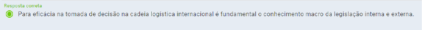Leia o trecho a seguir: “Os fluxos logísticos são fundamentais para a atividade empresarial, o objetivo de um gestor da área de logística é na verdade gerir toda a cadeia para reduzir custo e tempo, aperfeiçoar processos e consequentemente ganhar competitividade perante o mercado. Uma logística eficaz coloca o produto certo, no local correto, no tempo exato, no estado adequado e ainda com custo competitivos: valores reais, verdadeiros”. SILVA, L. A. T. Logística no comércio exterior. 2. ed. São Paulo: Aduaneiras, 2011. p. 42. O principal objetivo da logística internacional está centralizado no estabelecimento de eficácia na tomada de decisões e consequentes alcances de resultados positivos. Portanto, é correto afirmar que: