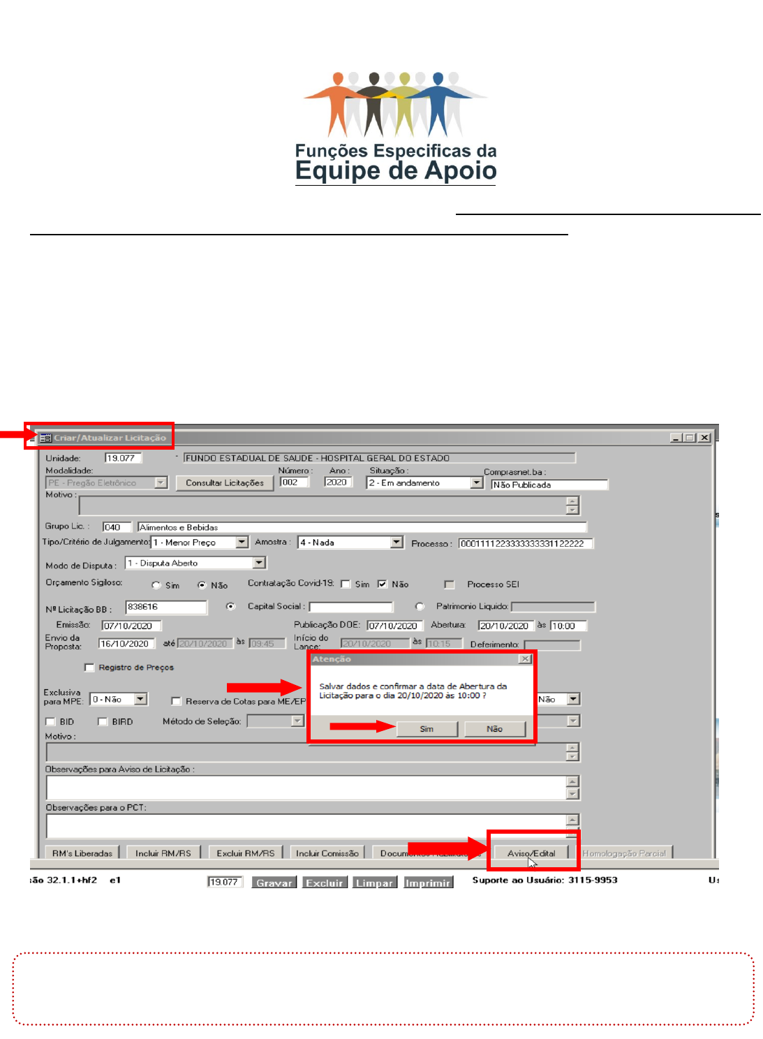 Página 1 de 23 Módulo III Nesse módulo iremos abordar os procedimentos realizados na fase externa da licitação no Módulo de Licitação do SIMPAS - Sistema Integrado de Material, Patrimônio e Serviços, referentes a publicação do Edital da Licitação para o portal www.comprasnet.ba.gov.br, a inclusão e alteração de dados das licitações geradas, a emissão de relatórios bem como o acompanhamento e consulta das licitações. 1 - PUBLICANDO O EDITAL Para publicação do edital será necessário clicar no botão “Aviso/Edital” na tela “Criar/Atualizar licitação” e confirmar a mensagem emitida pelo sistema. Atenção! A publicação do Edital no SIMPAS só poderá ser realizada após a veiculação do aviso no Diário oficial ou Jornal. Página 2 de 23 1.1. O sistema exibirá a mensagem “Aviso de Licitação”, contendo informações acerca do pregoeiro e dados da unidade. Selecionar “Confirmar”. 1.2. Será exibida nova tela “Escolha o edital correspondente à licitação”, que permite a escolha no diretório de edital. Selecionar o edital conforme a marcação da extensão do arquivo e em seguida clicar no comando “Enviar”. Página 3 de 23 1.3. Após gerar aviso e inserir o Edital da licitação, a mesma estará Publicada no Comprasnet.ba. O campo “Situação” altera para “Em andamento”, o campo “Comprasnet.ba” para “Publicada”. 1.4. Para baixar o edital disponibilizado no comprasnet.ba basta acessar o site (www.comprasnet.ba.gov.br). http://www.comprasnet.ba.gov.br/ Página 4 de 23 1.5. Na página inicial do comprasnet.ba clicar na aba “Licitação” em seguida selecionar “Editais”. 1.6. Será exibida a tela “Consulta de Editais” Página 5 de 23 1.7. No campo “Secretaria” selecionar a secretaria correspondente à licitação. Página 6 de 23 1.8. No campo “Unidade” selecionar a unidade correspondente da secretária, no campo “Modalidade” selecionar a modalidade da licitação do edital. 1.9. Após selecionar as opções de filtro disponibilizadas em tela clicar no botão “Pesquisar”. Página 7 de 23 2. PROCEDIMENTOS APÓS A DISPUTA 2.1. Para lançamento dos participantes na licitação, acessar o módulo “Licitação” em seguida a rotina “Pregão” e sub-rotina “Pregão - Eletrônico” e “Recibo de Edital”. 2.2. O sistema exibirá a tela “Emitir Recibo de Edital”. No campo “Licitação” selecionar a licitação, campo “Custo” colocar o valor de 0,00 (zero), pois nesta situação não houve custo para se ter acesso ao Edital da licitação. 2.3. No campo “CNPJ/CPF” inserir o número correspondente ao CNPJ/CPF dos participantes da licitação e em seguida pressionar a tecla “Tab” do teclado. 2.4. O sistema irá preencher os dados dos participantes automaticamente, desde que a empresa seja cadastrada no SIMPAS. Clicar no comando “Gravar” e em seguida confirmar a mensagem emitida pelo sistema. 2.5. Definir participantes: Para definir os participantes da licitação, acessar o módulo “Licitação” em seguida a rotina “Pregão”, sub- rotina “Pregão Eletrônico” e “Definir Participantes”. Página 8 de 23 2.6. Na tela “Definir Participantes”, no campo “Pregão” selecionar a licitação. Após selecionar o pregão o sistema irá demonstrar todas as empresas que foram cadastradas na rotina “Recibo de Edital”. 2.7. Fazer a marcação no flag “Apresentou Proposta”, clicar no comando “Gravar” e confirmar a mensagem emitida. 2.8. Após confirmar o procedimento clicar no botão ”Publicar no Acompanhamento” O sistema irá exibir a tela “Confirmação do Acompanhamento”. Clicar no comando “Confirmar”. Página 9 de 23 2.9. O sistema emite a mensagem confirmando que os dados foram gravados com sucesso. Clicar no comando “OK”. 2.10. O próximo passo será atualizar os preços cotados pelos fornecedores. 2.11. Para realizar este procedimento, acessar o módulo “Licitação” em seguida a rotina “Pregão” e a sub- rotina “Pregão Eletrônico” - “Atualizar Preços Cotados”. 2.12. O sistema direciona para a tela “Atualizar Preços Cotados”. Selecionar o Pregão no campo “Pregão”. 2.13. No campo “Fornecedor” selecionar o licitante já cadastrado anteriormente na rotina “Recibo de Edital” que ofertou preços para os respectivos itens. 2.14. Após selecionar o fornecedor o sistema exibirá os itens da licitação em tela. 2.15. Preencher os campos: “Valor Unitário Inicial”, “Prz. Entrega” e “Marca” conforme a proposta apresentada pelo fornecedor. 2.16. Em seguida clicar no botão “Gravar” localizado no rodapé da tela e confirmar a mensagem emitida pelo sistema. Página 10 de 23 2.17. Será exibida a mensagem “Dados Atualizados”. Clicar no botão “OK”. 2.18. Após informar o “Valor Unitário Inicial”, “Prazo” e “Marca” deve-se classificar os fornecedores que ofertaram preços a fim de lançamento do “Valor Unitário Final”. 2.19. Para realizar este procedimento, acessar o módulo “Licitação” em seguida a rotina “Pregão” e a sub- rotina “Pregão Eletrônico” – “Classificar Participantes”. Página 11 de 23 2.20. Na tela “Classificar Participantes" selecionar a licitação. 2.21. Após selecionar a licitação serão exibidos os fornecedores cadastrados na licitação que cotaram preços iniciais. 2.22. Na coluna “Classificado” marcar no flag o fornecedor que será classificado para inserir o Valor Unitário Final na licitação. Em seguida clicar no botão “Gravar” e confirmar a mensagem emitida. 2.23. O próximo passo será publicar no acompanhamento. 2.24. Clicar em “Publicar no Acompanhamento” e na tela “Confirmação do Acompanhamento”. 2.25. Clicar no comando “Confirmar”. Página 12 de 23 2.26. O sistema irá emitir mensagem “Dados gravados com sucesso”. Clicar no botão “OK”. 2.27. O próximo passo será o lançamento 