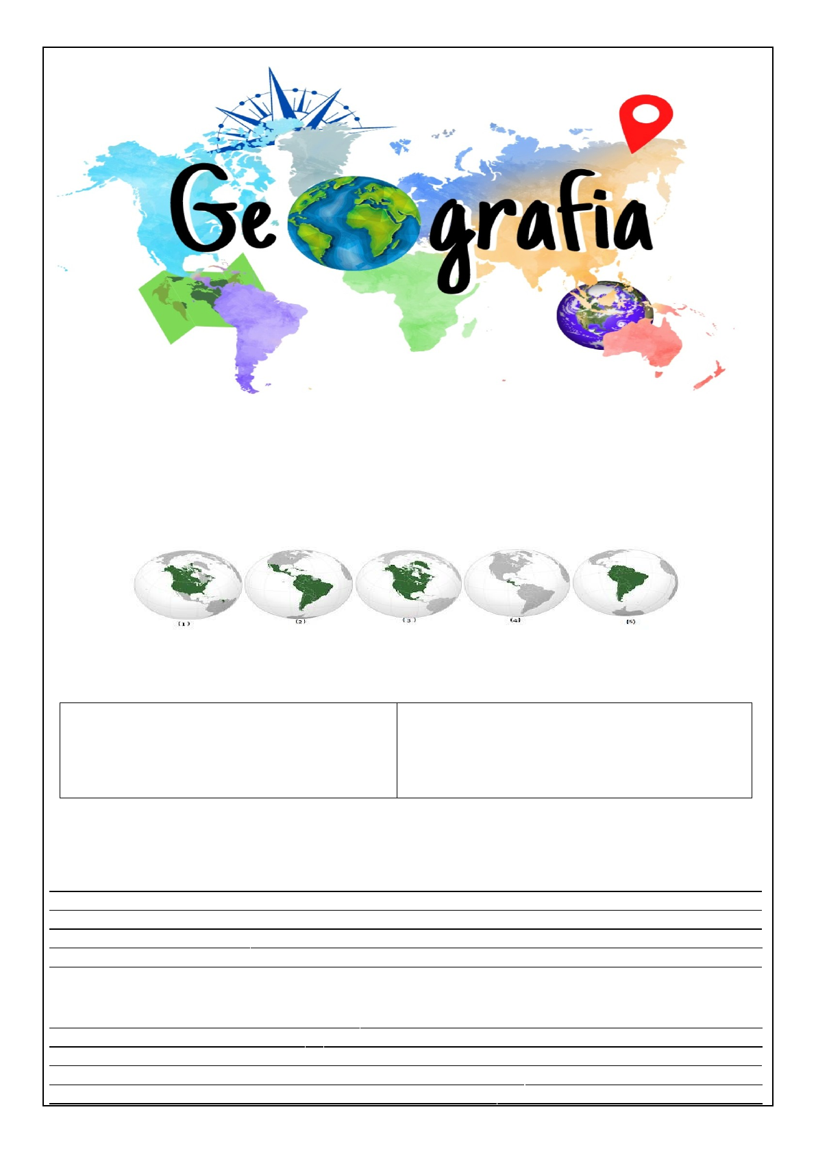 QUESTÃO 01 Observe os mapas na 1ª coluna e relacione-os com as características da 2ª coluna. Em seguida, marque a alternativa com a sequência correta: A DIVISÃO DO CONTINENTE AMERICANO ( ) América Anglo-Saxônica ( ) América do Norte ( ) América Latina ( ) América do Sul ( ) América Central A alternativa coma sequencia correta é: A) 1 - 3 - 2 - 5 - 4 B) 3 - 5 - 1 - 4 - 2 C) 1 - 2 - 3 - 4 - 5 D) 5 - 4 - 3 - 2 – 1 02) Descreva nos espaços indicados abaixo os critérios utilizados para dividir o espaço mundial. Critério Histórico Cultural Critério Geográfico - geológico 03) Do ponto de vista histórico-geográfico como podemos dividir o mundo? R 04) Explique as regionalizações dos países pelo nível de desenvolvimento. R 05) Explique porque Ásia, Europa e África receberam o nome de Velho Mundo. R 06) Por que o Continente Americano é chamado Novo Mundo? R 07) O que é o IDH? Quando foi criado? R 08) Como é calculado o IDH e qual é a sua utilidade? R 09) Quais são as regiões do mundo, onde se observa os piores IDHs? R 10) Explique o processo de globalização. R 11) Uma das características do mundo globalizado são as empresas transnacionais. Explique a atuação e o poder das transnacionais. R 12) Cite ao menos 3 consequências da globalização? R 13) Quais os principais sintomas da crise ambiental? R: 14) Descreva o fenômeno aquecimento global, citando as causas, consequências e possíveis soluções. R 15) Descreva o fenômeno da degradação dos solos. R 16) Explique o processo de “Colonização de exploração” ocorrido no Continente Americano. R 17) Explique o processo da colonização de povoamento no Continente Americano. R 18) O continente americano possui uma área de 42.951.000 km2, constituindo, em extensão, a segunda maior massa continental, superada apenas pelo continente asiático. Caracteriza-se pela grande extensão latitudinal (norte-sul) e, consequentemente, possui terras em quatro zonas climáticas: a intertropical, as temperadas do norte e do sul e a polar ártica. O continente só não é abrangido pela zona polar antártica. O continente americano, para fins didáticos, pode ser dividido segundo vários critérios: físico, socioeconômico, histórico-linguística. Apresente como é: A) Divisão física: _ B) Divisão econômica: C) Divisão histórico-linguística: 19) De norte a sul, o continente americano apresenta três grandes unidades de relevo. Assim, você deverá apresentar como eles estão a: A) Oeste B) Centro C) Leste 20) O continente americano destaca-se entre os demais continentes por apresentar em seu conjunto quase todos os tipos climáticos do planeta. Observe o mapa de climas do nosso continente e escreva o tipo de clima e uma característica para cada. A) B) C) D) _ E) . Escola Estadual Professor Domingos Ornelas Rua Presidente Washington Luiz, 214 – Bairro Boa Esperança – Santa Luzia – MG CEP: 33035-310 – Telefax: (31)3641-1731 E-mail: escola.10669@educacao.mg.gov.br Disciplina: Geografia AVALIAÇÃO PROGRESSÃO PARCIAL 8° ANO Conteúdo Referente ao 7º Ano Valor: 60,0 Professor (a): Cizina Nível de Ensino: Ensino Fundamental Ano: 2020 Turno: Tarde Nota: Estudante: Turma: DATA / / Orientações gerais: 1) Número de questões desta prova: 20 2) Valor das questões: 3,0 pontos cada. 3) Aluno que usar de meio ilícito na realização desta prova terá nota zerada e conceituação comprometida. QUESTÃO 01 Identifique no mapa os continentes e os oceanos e em seguida preencha a legenda abaixo e após preencher, marque a alternativa correta na sequência: GABARITO 1 2 3 4 5 6 7 8 9 10 11 12 13 14 15 16 17 18 19 20 A B C D LEGENDA 01 02 03 04 05 06 07 08 09 10 A) 1-América, 2-África, 3-Ásia, 4- Europa, 5- Oceania, 6- Antártida, 7- Oceano Índico, 8- Oceano Pacífico, 9-Oceano Atlântico,10- Oceano Glacial Ártico. B) 1- América, 2-África, 3-Europa, 4- Ásia, 5- Oceania, 6- Antártida, 7- Oceano Índico, 8- Oceano Pacífico, 9-Oceano Atlântico,10- Oceano Glacial Ártico. C) 1- América, 2-África, 3-Europa, 4- Ásia, 5- Oceania, 6- Antártida, 7- Oceano Pacífico, 8- Oceano Atlântico, 9- Oceano Índico,10- Oceano Glacial Ártico. D) 1- América, 2- Ásia , 3-Europa, 4- África , 5- Oceania, 6- Antártida, 7- Oceano Índico, 8- Oceano Pacífico, 9- Oceano Atlântico,10- Oceano Glacial Ártico. QUESTÃO 02 Observe os dois mapas abaixo e em seguida julgue as afirmativas que justificam corretamente essas divisões do continente americano marcando 1 para as afirmativas que correspondem a divisão da América no mapa 1, e 2 para as afirmativas que correspondem a divisão da América no mapa 2. ( ) A América Latina engloba todos os países da América do Sul e Central em conjunto com o México. ( ) É considerada a divisão física do continente americano. ( ) Essa divisão regional do continente americano obedece ao critério da localização e posição geográfica. ( ) É comum ouvir que os principais critérios dessa divisão são o idioma e a diversidade étnica. ( ) Pode ser considerada a divisão sociocultural da América. ( ) A América Anglo-Saxônica é formada pelos Estados Unidos e Canadá apenas. ( ) Essa divisão regional do continente americano obedece a critérios culturais e econômicos. ( ) Abrange todos os países desenvolvidos do continente. ( ) Abrange todos os países subdesenvolvidos do continente. ( ) Trata-se de dois blocos continentais ao norte e ao sul unidos por um istmo (pequena faixa de terras situadas entre dois mares). Assinale a alternativa que mostra a relação correta, de cima para baixo. A) 2/1/1/2/2/2/2/2/1/2 B) 1/2/1/2/1/1/2/2/1/2 C) 2/2/1/2/2/1/2/2/1/2 D) 2/1/1/2/2/2/2/2/2/1 QUESTÃO 03 Sobre o conceito de Biodiversidade marque abaixo a afirmativa correta: A) Refere-se a todas as formas de vida de uma região ou de todo o planeta. B) Refere-se apenas à flora. C) Refere-se apenas à fauna. D) Não é tema de estudo dos impactos ambientais. QUESTÃO 04 Sobre o IDH, j