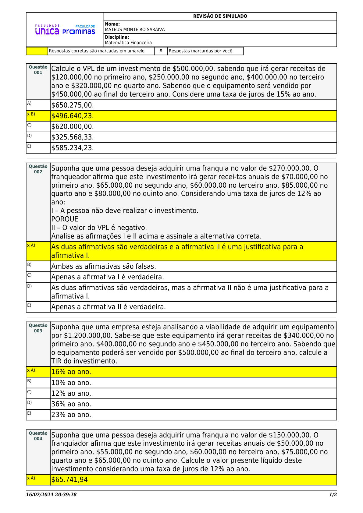 16/02/2024 20:39:28 1/2 REVISÃO DE SIMULADO Nome: MATEUS MONTEIRO SARAIVA Disciplina: Matemática Financeira Respostas corretas são marcadas em amarelo X Respostas marcardas por você. Questão 001 Calcule o VPL de um investimento de $500.000,00, sabendo que irá gerar receitas de $120.000,00 no primeiro ano, $250.000,00 no segundo ano, $400.000,00 no terceiro ano e $320.000,00 no quarto ano. Sabendo que o equipamento será vendido por $450.000,00 ao final do terceiro ano. Considere uma taxa de juros de 15% ao ano. A) $650.275,00. X B) $496.640,23. C) $620.000,00. D) $325.568,33. E) $585.234,23. Questão 002 Suponha que uma pessoa deseja adquirir uma franquia no valor de $270.000,00. O franqueador afirma que este investimento irá gerar recei-tas anuais de $70.000,00 no primeiro ano, $65.000,00 no segundo ano, $60.000,00 no terceiro ano, $85.000,00 no quarto ano e $80.000,00 no quinto ano. Considerando uma taxa de juros de 12% ao ano: I – A pessoa não deve realizar o investimento. PORQUE II – O valor do VPL é negativo. Analise as afirmações I e II acima e assinale a alternativa correta. X A) As duas afirmativas são verdadeiras e a afirmativa II é uma justificativa para a afirmativa I. B) Ambas as afirmativas são falsas. C) Apenas a afirmativa I é verdadeira. D) As duas afirmativas são verdadeiras, mas a afirmativa II não é uma justificativa para a afirmativa I. E) Apenas a afirmativa II é verdadeira. Questão 003 Suponha que uma empresa esteja analisando a viabilidade de adquirir um equipamento por $1.200.000,00. Sabe-se que este equipamento irá gerar receitas de $340.000,00 no primeiro ano, $400.000,00 no segundo ano e $450.000,00 no terceiro ano. Sabendo que o equipamento poderá ser vendido por $500.000,00 ao final do terceiro ano, calcule a TIR do investimento. X A) 16% ao ano. B) 10% ao ano. C) 12% ao ano. D) 36% ao ano. E) 23% ao ano. Questão 004 Suponha que uma pessoa deseja adquirir uma franquia no valor de $150.000,00. O franquiador afirma que este investimento irá gerar receitas anuais de $50.000,00 no primeiro ano, $55.000,00 no segundo ano, $60.000,00 no terceiro ano, $75.000,00 no quarto ano e $65.000,00 no quinto ano. Calcule o valor presente líquido deste investimento considerando uma taxa de juros de 12% ao ano. X A) $65.741,94 16/02/2024 20:39:28 2/2 B) $43.254,40 C) $106.745,60 D) -$106.745,60 E) -$52.487,20 Questão 005 Suponha que uma empresa deseja realizar a aquisição de um equipamento por $120.000,00. Sabendo que este equipamento irá gerar uma receita de $35.000,00 no primeiro ano, $50.000,00 no segundo ano, $45.000,00 no terceiro ano e $28.000,00 no quarto ano, calcule o valor presente líquido a uma taxa de 10% ao ano. A) -$6.074,04 B) $126.074,04 X C) $6.074,04 D) -$126.074,04 E) $12.274,04 Questão 006 Suponha que uma empresa esteja analisando a viabilidade de adquirir um equipamento por $720.000,00. Sabe-se que este equipamento irá gerar receitas de $340.000,00 no primeiro ano, $450.000,00 no segundo ano e $390.000,00 no terceiro ano. Sabendo que o equipamento será vendido por $450.000,00 ao final do terceiro ano. Assim, calcule o valor presente líquido deste investimento, considerando uma taxa de retorno de 10% ao ano. A) $420.195,00. X B) $592.096,17. C) -$460.227,45. D) $370.875,25. E) -$450.287,42. Questão 007 Calcule o valor presente líquido de um investimento de $320.000,000 que irá gerar uma receita de $70.000,00 no primeiro ano, $75.000,00 no segundo ano e $30.000,00 no terceiro ano. Considere uma taxa de juros de 10% ao ano. A) -$225.125,32. B) $225.125,32. X C) -$171.840,72. D) $327.425,56. E) $171.840,72. Questão 008 Calcule a TIR de um investimento de $50.000,00, sabendo que ele irá gerar uma receita de $20.000,00 no primeiro ano, $25.000,00 no segundo ano e $33.000,00 no terceiro ano. A) 50% ao ano. B) 12% ao ano. C) 33% ao ano. X D) 24% ao ano. E) 15% ao ano.