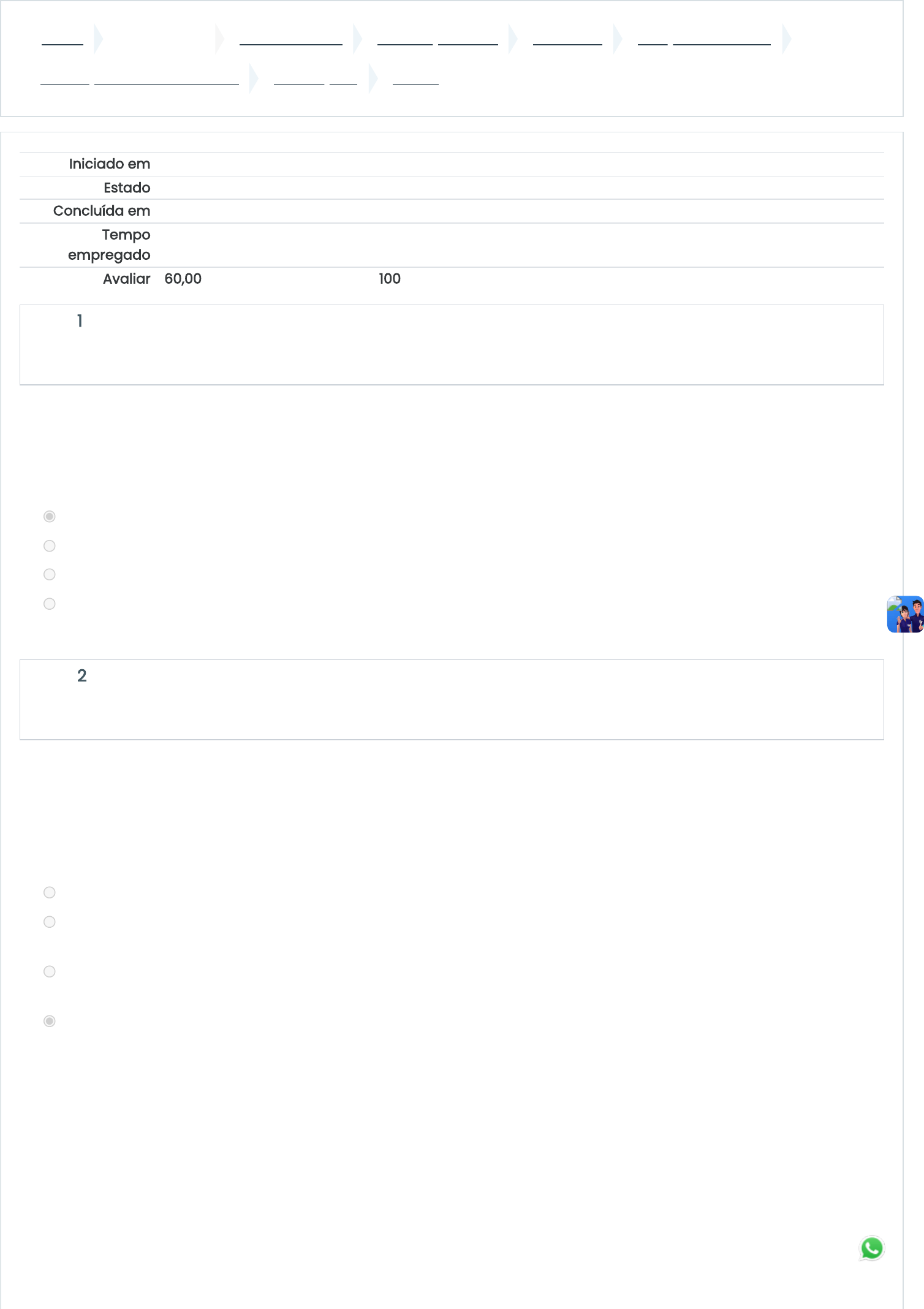 19/02/2024, 15:58 PROVA https://ava.funec.br/mod/quiz/review.php?attempt=567609&cmid=21722 1/8 Painel Meus cursos CURSOS FUNEC Graduação - EAD Aluno EAD JUNÇÕES DE TURMA Instalações Elétricas Prediais AVALIAÇÕES PROVA Iniciado em Monday, 19 Feb 2024, 15:29 Estado Finalizada Concluída em Monday, 19 Feb 2024, 15:57 Tempo empregado 28 minutos 5 segundos Avaliar 60,00 de um máximo de 60,00(100%) Questão 1 Completo Atingiu 3,00 de 3,00 Questão 2 Completo Atingiu 3,00 de 3,00 Um determinado projeto elétrico teve um circuito dimensionado para uma carga resistiva de até 8,8 KW trabalhando em 220 V. Com base nestes dados a corrente máxima em regime normal de operação não deve exceder: Escolha uma opção: a. 40 A b. 2 A c. 4 A d. 20 A Para se fazer uma ligação elétrica do tipo paralela, ou “three way”, necessita-se de condutores elétricos do tipo fase, neutro e retornos. Supondo que seja necessário fazer uma ligação desse tipo em uma sala contendo um interruptor “A”, um interruptor “B” e uma luminária, a forma de ligação correta seria: Escolha uma opção: a. interruptor A (fase e retornos entre A e B); interruptor B (neutro e retorno de A), luminária (retorno de A e B). b. interruptor A (fase e retorno de B); interruptor B (fase e retorno entre A e B), luminária (fase, neutro e retorno de A e B) c. interruptor A (neutro e retornos entre A e B); interruptor B (retorno da luminária e retornos entre A e B), luminária (fase e retorno de A e B). d. interruptor A (fase e retornos entre A e B); interruptor B (retorno da luminária e retornos entre A e B), luminária (neutro e retorno de B). Conte https://ava.funec.br/my/ https://ava.funec.br/course/index.php?categoryid=10 https://ava.funec.br/course/index.php?categoryid=17 https://ava.funec.br/course/index.php?categoryid=19 https://ava.funec.br/course/index.php?categoryid=77 https://ava.funec.br/course/view.php?id=1261 https://ava.funec.br/course/view.php?id=1261#section-6 https://ava.funec.br/mod/quiz/view.php?id=21722 19/02/2024, 15:58 PROVA https://ava.funec.br/mod/quiz/review.php?attempt=567609&cmid=21722 2/8 Questão 3 Completo Atingiu 3,00 de 3,00 Questão 4 Completo Atingiu 3,00 de 3,00 Questão 5 Completo Atingiu 3,00 de 3,00 Pretende-se ligar um aquecedor elétrico (boiler) de 4,5 kW, 220 V, a partir de um Quadro de Distribuição através de 3 cabos unipolares (2F+T) com isolação de XLPE instalados em eletroduto de PVC embutido em alvenaria, distante 63 metros do mesmo, e temperatura ambiente de 40ºC. Com base nos dados apresentados acima e nas tabelas da NBR 5410/04, qual das alternativas abaixo descreve corretamente a seção transvessal (comercial) dos cabos adequados para esta instalação com base no critério de capacidade de condução de corrente, queda de tensão máxima admissivel. Considerar a queda de tensão maxima de 3%. Escolha uma opção: a. 25mm² b. 6mm² c. 16mm² d. 10mm² Em uma instalação elétrica os interruptores são utilizados para ligar e desligar lâmpadas e até mesmo outros aparelhos de pequeno porte como os domésticos. A ligação entre o interruptor e a lâmpada é realizada pelos fios Fase, Neutro e Retorno. Assinale a alternativa correta quanto à forma de ligação do interruptor simples. Escolha uma opção: a. No interruptor são ligados os fios Fase e Neutro, e na lâmpada os fios Retorno e Neutro. b. No interruptor são ligados os fios Fase e Neutro, e na lâmpada os fios Neutro e Retorno. c. No interruptor são ligados os fios Fase e o Retorno, e na lâmpada os fios Neutro e o Retorno. d. No interruptor são ligados os fios Neutro e o Retorno, e na lâmpada os fios Fase e o Retorno. Uma carga é alimentada por um Quadro Terminal (QT) através de um circuito, conforme a figura a seguir. Considerando a figura acima, sabendo-se que a tensão no QT é igual a 220 V e que a queda de tensão máxima permitida (∆V) no circuito terminal é de 2%, é correto afirmar que a tensão mínima admissível na carga é: Escolha uma opção: a. 204,5V b. 218V c. 212,8V d. 215,60V Conte 19/02/2024, 15:58 PROVA https://ava.funec.br/mod/quiz/review.php?attempt=567609&cmid=21722 3/8 Questão 6 Completo Atingiu 3,00 de 3,00 Questão 7 Completo Atingiu 3,00 de 3,00 Os dispositivos de proteção utilizados nas instalações elétricas têm a finalidade de garantir a segurança dos usuários e dos componentes da instalação. Nas instalações elétricas de baixa tensão, o dispositivo de proteção que atua contra choques elétricos e sobrecarga é o(a) Escolha uma opção: a. disjuntor diferencial residual b. disjuntor termomagnético c. fusível d. chave-faca Qual os valores da resistência total (Req) e das corrente elétrica I2 e I4 do circuito apresentado na figura? Escolha uma opção: a. Req = 0,89Ω; I2 = 15A; I4 = 30A b. Req = 19Ω; I2 = 1,5A; I4 = 3,0A c. Req = 0,89Ω; I2 = 1,5A; I4 = 3,0A d. Req = 19Ω; I2 = 15A; I4 = 30A Conte 19/02/2024, 15:58 PROVA https://ava.funec.br/mod/quiz/review.php?attempt=567609&cmid=21722 4/8 Questão 8 Completo Atingiu 3,00 de 3,00 Questão 9 Completo Atingiu 3,00 de 3,00 Questão 10 Completo Atingiu 3,00 de 3,00 Nas instalações elétricas de baixa tensão, o disjuntor termomagnético, padrão DIN, oferece proteção para o circuito no qual está instalado. Considere as afirmativas abaixo sobre esse disjuntor: I - Atua na proteção contra correntes de curto-circuito através de seu disparador eletromagnético. II - Atua na proteção de falta de fase através de seu disparador diferencial residual. III - Atua na proteção contra sobrecargas através de seu disparador térmico. IV - Atua na proteção contra sobretensões através de seu disparador de potencial. Escolha uma opção: a. I e IV. b. III e IV. c. I e III. d. II e III. Um motor elétrico trifasico 220V com 1 CV de potencia mecânica na ponta do eixo, possui fator de potência de 0,78 e rendimento de 0,90. Determine a corrente de alimentação (I) para o motor e as potê
