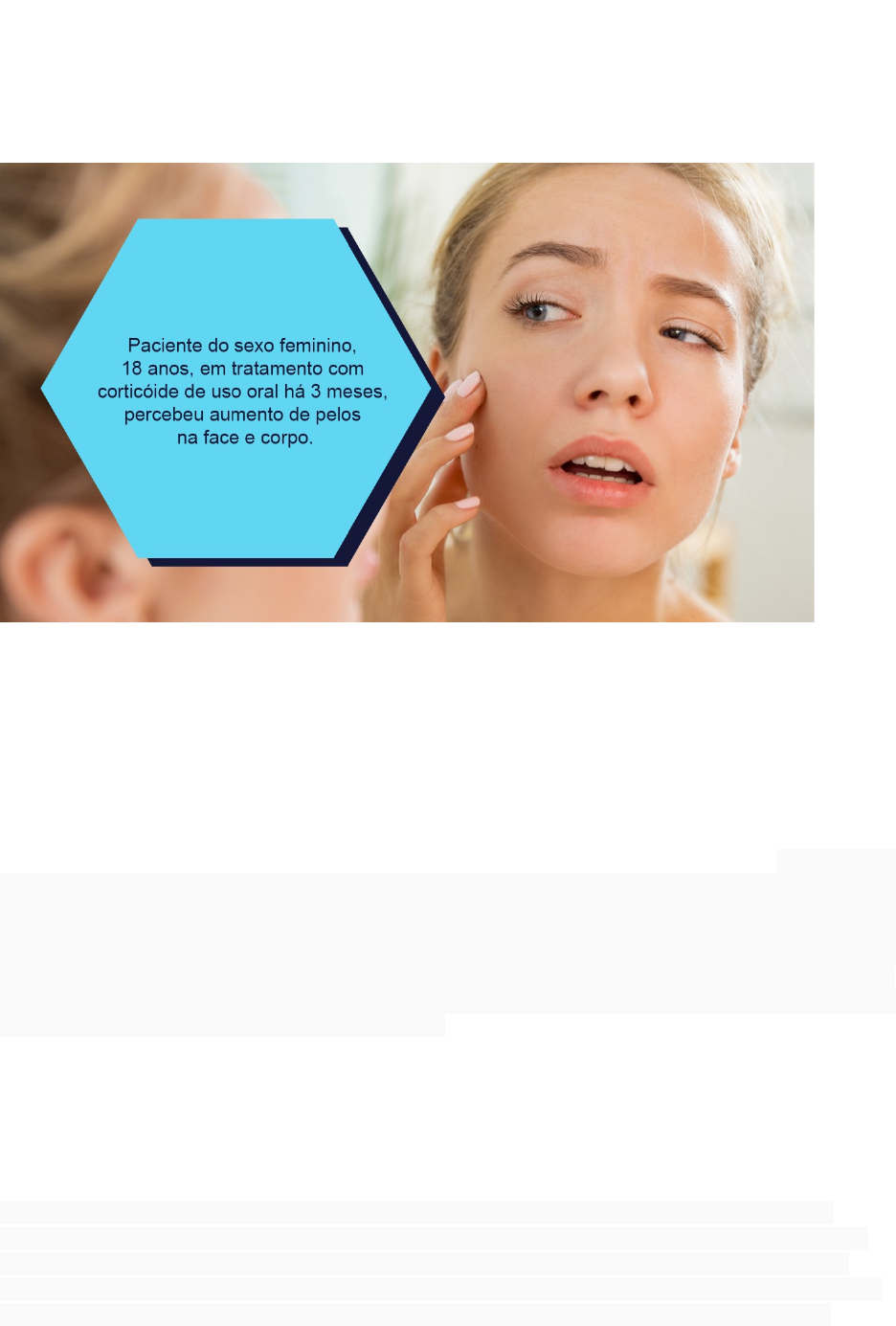Atualmente, os indivíduos se preocupam muito com a própria beleza. Nesse contexto, alguns problemas podem causar aflição, como, por exemplo, a hipertricose. Associada ao aumento de pelos em diversas partes do corpo, a hipertricose, muitas vezes, ocorre devido ao uso de algumas classes de medicamentos. No papel de profissional, imagine que você recebeu na sua clínica o seguinte relato de caso para avaliação: Considerando as informações dadas, responda: a) Qual será a sua conduta com essa paciente que faz uso do anti-inflamatório sem prescrição médica, o qual provocou o aumento dos pelos? Tendo em vista que o corticoide utilizado pela paciente não foi indicado ou prescrito por um profissional habilitado, a conduta apropriada, para a paciente em questão, é a suspensão do uso do medicamento. Nesse caso, a paciente deve ser orientada a consultar um dermatologista para avaliar se é necessário o uso de medicamentos para tratar a sua pele. Também explicaria a paciente que primeiramente não é aconselhável se automedicar e pediria para suspender pois alguns medicamentos podem ocasionar efeitos adversos específicos, dentre eles, a hipertricose e explicaria que os medicamentos da classe dos corticoides administrados por via tópica são um exemplo dentre os fármacos que podem ocasionar o aparecimento excessivo de pelos. Esses medicamentos possuem ação anti-inflamatória , e o uso prolongado pode provocar essa reação adversa cutânea. b) Quanto ao excesso de pelos, o que você indicaria para essa paciente? A hipertricose é um dos efeitos colaterais associados à corticoterapia tópica e, com a interrupção do uso do corticoide, esse efeito colateral pode ser lentamente reversível. Dessa forma, caso a hipertricose tenha sido causada pelo uso do corticoide, os procedimentos de retirada do uso da medicação ou de retirada dos pelos (depilação) atenderiam ao caso. Indicaria para essa paciente passar com um médico dermatologista, para realização de exames necessários para que se tenha um diagnóstico correto para fazer o tratamento específico. Normalmente, há uma combinação dos seguintes tratamentos: - tratamento estético: depilação a laser para diminuir a quantidade e pelos, - tratamento hormonal: indicado para doenças que causam desequilíbrios hormonais, - mudança de hábitos: dieta balanceada e atividade física para pacientes com sobrepeso. Exercícios 1. A hipertricose é uma doença rara na qual se tem um crescimento exagerado dos pelos, podendo ser classificada em hipertricose adquirida ou congênita. Sobre a hipertricose congênita, assinale a alternativa correta: A. A hipertricose congênita aparece na vida adulta após o uso de alguns medicamentos. B. A hipertricose congênita não apresenta diferença nas fases dos pelos. C. A hipertricose congênita aparece no nascimento ou na infância, e ocorre devido a fatores genéticos. D. A hipertricose congênita aparece na infância após o uso de alguns medicamentos. E. A hipertricose congênita não tem relação com fatores genéticos. 2 O hirsutismo é uma doença que provoca um aumento dos pelos terminais na mulher, nas áreas anatômicas masculinas, devido à ação dos androgênios circulantes. Essa doença pode ser classificada em três categorias: constitucional, idiopática e androgênica. Como recurso para o tratamento do hirsutismo, recomenda-se o uso de: A. anticoncepcionais. B. anti-inflamatórios. C. corticoides. D. diuréticos. E. antibióticos. 3 Após o diagnóstico da hipertricose, alguns tratamentos podem ser iniciados para minimizar ou até mesmo erradicar a presença dos pelos. Considere um paciente com 5 anos que foi diagnosticado com hipertricose congênita lanuginosa, e que tem pelos no seu tronco. Neste caso, qual seria a melhor opção de tratamento para essa criança? A. Tratamento cosmetológico com produtos para clarear os pelos. B. Tratamento farmacológico com medicamento de uso tópico. C. Tratamento cosmetológico com o uso de barbeadores. D. Tratamento com o uso de laser. E. Tratamento cosmetológico associado ao tratamento farmacológico. 4 A hipertricose é caracterizada pelo crescimento excessivo dos pelos e pode ser classificada em hipertricose adquirida ou congênita. Sobre a hipertricose adquirida, quais fatores estão associados à sua manifestação? A. A hipertricose adquirida está relacionada ao uso de alguns medicamentos anti-inflamatórios ou à ocorrência de doenças específicas. B. A hipertricose adquirida está relacionada ao uso de alguns corticoides ou à genética dos pais. C. A hipertricose adquirida está relacionada ao uso de anticonvulsivantes ou antidepressivos. D. A hipertricose adquirida está relacionada ao uso de medicamentos analgésicos ou à ocorrência de doenças específicas. E. A hipertricose adquirida está relacionada apenas ao uso de medicação antidepressiva. 5 A bimatoprosta é um medicamento utilizado para glaucoma, que provoca a hipertricose dos cílios; por isso, é usado por muitas mulheres. Nesse contexto, quais outros medicamentos podem causar a hipertricose? A. Minoxidil, fenitoína, clobetasol e penicilina. B. Betametasona, minoxidil, clobetasol e furosemida. C. Clobetasol, hidroclorotiazida, fenitoína e minoxidil. D. Dexametasona, clortalidona, penicilina e minoxidil. E. Triancinolona, furosemida, penicilina e minoxidil. FARMACOS E ALOPCEIA DESAFIO A queda excessiva dos cabelos é chamada de alopecia e pode acarretar em impactos psicossociais. A alopecia pode ser classificada em difusas ou localizadas, sendo ocasionada por falhas na formação dos cabelos, alterações do ciclo capilar e destruição folicular. Imagine que você está em atendimento e a paciente, uma mulher de 35 anos, relata o seguinte: tendo notado queda intensa de cabelo, e como o marido estava fazendo tratamento para alopecia, decidiu, por conta própria, fazer o mesmo que ele, tendo começado a utilizar minoxidil e finasterida. Sendo assim, res