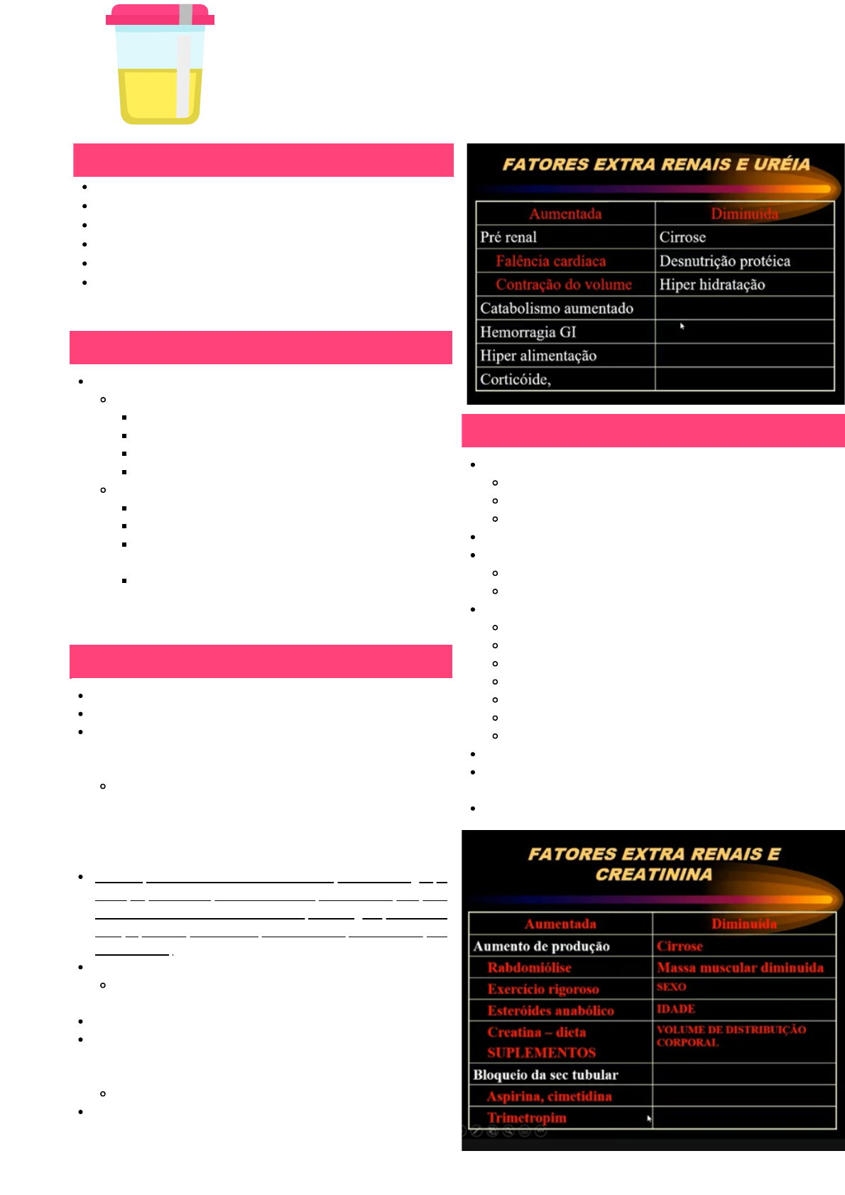 PROVAS DE FUNÇÃO RENAL FUNÇÃO DOS RINS Excreção de metabólitos Controle hidroeletrolítico Controle ácido-básico Controle da PA Secreção de eritropoietina Secreção de 1,25dihidroxicolicalciferol (Em IR avançada há um distúrbio mineral ósseo) RITMO DE FILTRAÇÃO GLOMERULAR PROVAS DE FUNÇÃO RENAL MARCADORES DE FUNÇÃO RENAL Ureia Creatinina Clearence de creatinina (depuração de creatinina) Cistatina C MARCADORES DE LESÃO RENAL Proteinúria NGAL (eleva com lesão nos túbulos 2h) IL-18 (citocina pró-inflamatória se eleva depois de 6h da lesão renal) Kim-1 (produzida por cél. tubulares se eleva depois de 12h da lesão renal) UREIA VR: 40-50mg% Pouco específica É o principal produto do catabolismo proteico. Sintetizada pelo fígado e não se liga às proteínas plasmáticas Aminoácidos das proteínas são degradados resultando na produção de amônia -> A amônia é convertida em Ureia no fígado -> A ureia é transportada pelo sangue até os rins, onde é filtrada -> 40% é reabsorvida nos túbulos e os outros 60% é excretado na urina. A ureia que é reabsorvida nos túbulos vai junto com a água, e assim, quando o paciente está hipovolêmico (ICC) ou desidratado vai haver mais reabsorção de água (aumenra o ADH) e, consequentemente, mais reabsorção de ureia (fica mais elevada) A dieta hiperproteica eleva a ureia Pacientes doentes renais tem de fazer dieta hipoproteica Hepatopatas produzem pouca ureia Hemorragias, principalmente digestivas, podem aumentar a ureia (aumento da lise de hemácias -> heme -> metabolismo proteico) Anemia com suspeita de HDA -> pedir ureia Uso de corticoides e Sepse aumentam o catabolismo proteico. CREATININA VR: H: 0,8 a 1,3mg% M: 0,6 a 1,0mg% Crianças: 0,3 a 1,0mg% É o produto final do catabolismo muscular. Fontes: Endógena Exógena (10%) CARACTERÍSTICAS É totalmente filtrada pelos rins Não é reabsorvida pelos túbulos Não se liga à proteínas plasmáticas Liberada constantemente Filtrada livremente pelos glomérulos Secretada pelos túbulos renais (20%) Depende da função hepática Rabdomiólise eleva a creatinina Destruição muscular, leptospirose, queimaduras extensas também elevam Maior em quem malha (microlesões) PROVAS DE FUNÇÃO RENAL CISTATINA C Proteína de baixo peso molecular, produzida por todas as células nucleadas em ritmo constante VANTAGENS Não depende de massa muscular Não depende do estado nutricional Não depende de sexo, raça e idade DESVANTAGENS Ainda não existe um padrão de referência internacional Corticoide aumenta os valores Disfunção da tireoide altera resultado Preço CLEARENCE É a quantidade de plasma que é totalmente depurada nos rins de uma substância na unidade de tempo. Normal: 90 a 120ml/min Pode ser feito com Inulina (só em trabalhos científicos, é só filtrada, não é reabsorvida e é exógena) e com CREATININA. TFG = (Vu/1440)x creatinina urinária / creatinina sérica VR: 120ml/min A medida que a TFG diminui, a creatinina sérica aumenta Denota diminuição da capacidade renal VR da creatinina urinária: H: 20 a 26mg/min M: 14 a 22mg/min OUTRAS FÓRMULAS FÓRMULA DE CROCKCROFT-GAULT (1978) Superestimada em obesos Mulheres: multiplica por 0,85 O gráfico mostra essa relação e tamém evidencia que a creatinina não é um marcador muito sensível, pois quando a creatinina se eleva, a TFG já está em torno de 50ml/min (muito baixa) FÓRMULA MDRD (1999) Padrão em muitos laboratórios FG = 186,3 x (Cr sérica) - 1.154 x (idade) 0,706 x 0,742 (se mulher) APP: Qx Calculate Não é muito preciso para FG > 60ml/min CKD - EPI (2009) TFG = 141 (Cr S/K) 2x (cr s/k) - 1209 x 0,993 idade [1,018 se feminino] [1159 se afro-americano] K = 0,7 sexo feminino k = 0,9 sexo masculino Mais usado nas diretrizes Crianças TFG: Kxestatura (cm)/ creatinina sérica K = constante proporcional idade Lactente < 1 ano: K=0,45 Criança de 1 a 12 anos: K = 0,55 IMPORTÂNCIA DA AVALIAÇÃO DA FUNÇÃO RENAL Diagnosticar a IR Estadiar o grau de IR Administração adequada de medicamentos Tomar decisões quanto ao tipo de Tratamento 30 PROVAS DE FUNÇÃO RENAL PROTEINÚRIA Métodos de avaliação laboratorial Sumário de urina (fitas reagentes) Medida da proteinúria de 24h VR: 150 mg/24h Obj: prognóstico e intervenção terapêutica Índice de proteinúria/ creatinina (IPC) em amostra isolada da urina Proteinúria/ creatinina <0,2 ------- valor normal 0,2 - 0,5 ---- proteinúria mínima 0,5 - 2,0 ---- proteinúria moderada >2,0 ------- síndrome nefrótica Muitas vezes a proteinúria é a primeira manifestação da doença renal Desempenha um papel importante na progressão da doença renal TIPOS DE PROTEINÚRIAS Proteinúria funcional Proteinúria glomerular Ocorre devido a uma alteração na barreira glomerular que permite a passagem de proteínas Proteinúria tubular Aumento de secreção pelos túbulos Quando ocorre nefrite intesticial pelos túbulos É de pequena monta, geralmente não ultrapassa 1g QUANDO SOLICITAR? HAS DM História familiar de DR Uso de drogas nefrotóxicos (AINE) Anemia Edema sem causa definida Hematúria ITU de repetição Proteinúria de sobrecarga Produção anormal de proteínas anômalas, geralmente de cadeias leves, produzidas por células clones dos linfócitos B (mieloma múltiplo), são os fragmentos de anticorpos. São totalmente filtrados pelos glomérulos. Vistos pela Eletroforese de proteína urinária EQUAÇÃO PARA AVALIAR O RISCO DE DESENVOLVER DRC