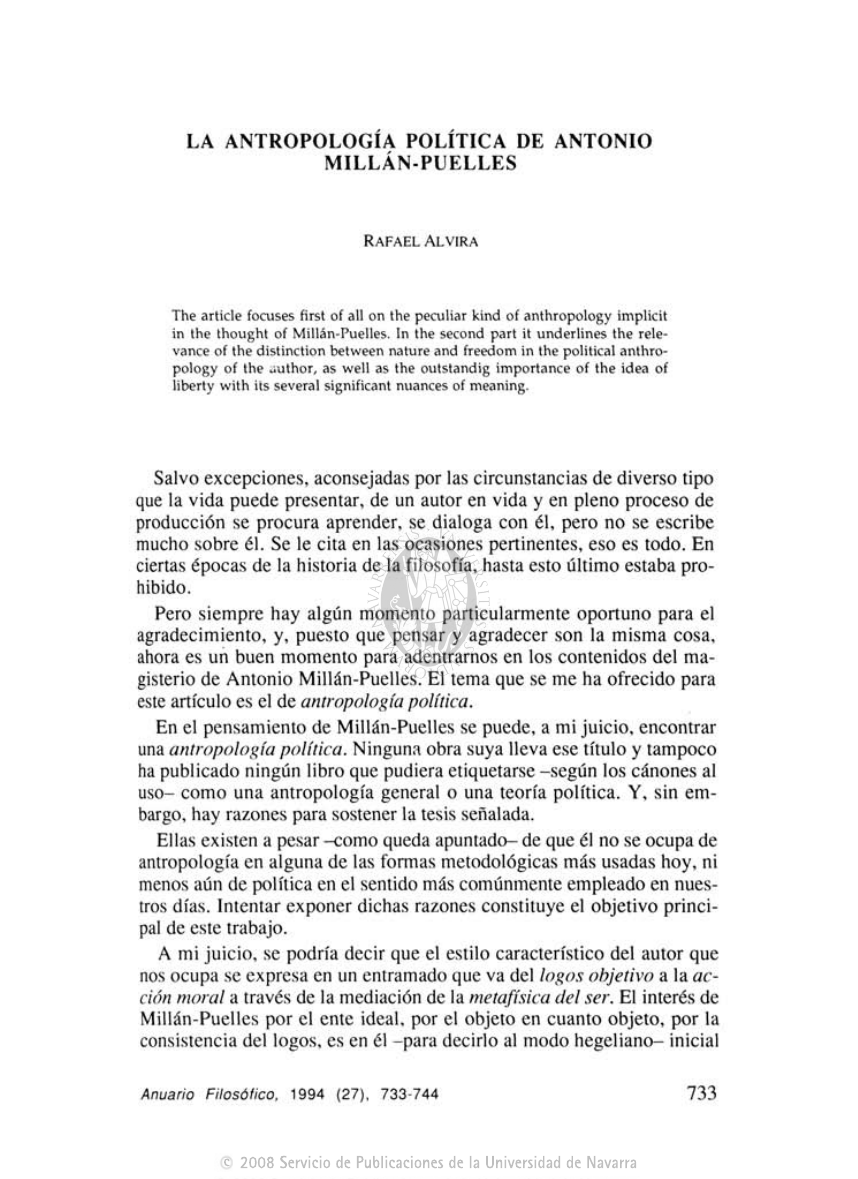 LA ANTROPOLOGÍA POLÍTICA DE ANTONIO MILLÁN-PUELLES RAFAEL AL VIRA The article focuses first of all on the peculiar kind of anthropology implicit in the thought of Millán-Puelles. In the second part it underlines the rele- vance of the distinction between nature and freedom in the political anthro- pology of the author, as well as the outstandig importance of the idea of liberty with its several significant nuances of meaning. Salvo excepciones, aconsejadas por las circunstancias de diverso tipo que la vida puede presentar, de un autor en vida y en pleno proceso de producción se procura aprender, se dialoga con él, pero no se escribe mucho sobre él. Se le cita en las ocasiones pertinentes, eso es todo. En ciertas épocas de la historia de la filosofía, hasta esto último estaba pro- hibido. Pero siempre hay algún momento particularmente oportuno para el agradecimiento, y, puesto que pensar y agradecer son la misma cosa, ahora es un buen momento para adentrarnos en los contenidos del ma- gisterio de Antonio Millán-Puelles. El tema que se me ha ofrecido para este artículo es el de antropología política. En el pensamiento de Millán-Puelles se puede, a mi juicio, encontrar una antropología política. Ninguna obra suya lleva ese título y tampoco ha publicado ningún libro que pudiera etiquetarse -según los cánones al uso- como una antropología general o una teoría política. Y, sin em- bargo, hay razones para sostener la tesis señalada. Ellas existen a pesar -como queda apuntado- de que él no se ocupa de antropología en alguna de las formas metodológicas más usadas hoy, ni menos aún de política en el sentido más comúnmente empleado en nues- tros días. Intentar exponer dichas razones constituye el objetivo princi- pal de este trabajo. A mi juicio, se podría decir que el estilo característico del autor que nos ocupa se expresa en un entramado que va del logos objetivo a la ac- ción moral a través de la mediación de la metafísica del ser. El interés de Millán-Puelles por el ente ideal, por el objeto en cuanto objeto, por la consistencia del logos, es en él -para decirlo al modo hegeliano- inicial Anuario Filosófico, 1994 (27), 733-744 733 c2008 Servicio de Publicaciones de la Universidad de Navarra RAFAEL ALVIRA y principial. La admiración que le despertó la lectura temprana de las "Investigaciones lógicas" husserlianas, unido al estudio muy serio de la tradición aristotélico-tomista en sus años de estudiante universitario, su relación también con el inolvidable Leopoldo-Eulogio Palacios, le muestran muy pronto como esa mente lógica, clara y rigurosa al mismo tiempo, que abomina de todo procedimiento efectista, expeditivo o sim- plemente sofístico. El respeto por la razón objetiva será ya -para el resto de sus días- una de sus características más definitorias. La citada admiración por Husserl -siempre presente- se cimenta en las críticas de éste al psicologismo y al escepticismo, críticas que le en- tusiasman. Pero no ve clara la actitud del Husserl de segunda época, más inclinado a Kant. Millán-Puelles piensa que los discípulos de Gottingen, de primera hora, tienen en conjunto razón al ver en la fenomenología un instrumento extraordinario, que no cierra el paso al realismo metafí- sico, sino que más bien lo abre. Si Husserl tiene la tentación de radicar ese mundo ideal cuya verdad ha mostrado fenomenológicamente en una especie de sujeto transcen- dental kantiano, el intento de Millán-Puelles será el de mostrar cómo esas ideas requieren, para ser encuadradas adecuadamente, la referencia a un sujeto real, y, en último extremo, a un ser real. Si puedo hablar así, para que la investigación filosófica siga un curso riguroso y verdadero, hemos de ir de la objetividad verdadera -y de la verdadera objetividad- de la idea a la realidad substancial del sujeto para el que es idea, y de ahí al descubrimiento ontológico último, al ser transcendental y al trans- cendente. Es este primer tramo del camino -aún falta el que nos conduce a la práctica- el que deja ver como Millán-Puelles "se encuentra" con la an- tropología, casi sin quererlo, y explica el modo peculiar que en él ad- quiere. Ese modo no es el de la psicología racional aristotélico-tomista -aunque la incluya-, ni el de una teoría transcendental de la conciencia, ni el meramente fenomenológico, ni una pura ontología del ser humano, ni uno empírico, ni cultural, ni hermeneútico, ni platónico-místico, ni existencialista. Para Millán-Puelles, la tarea de confeccionar una antropología, en el sentido más estricto, no se puede concluir, pues el ser humano se carac- teriza precisamente por estar abierto a una infinitud que le transciende. Este saber es así, para él, siempre inadecuado. Y, sin embargo, el sabor de su obra es antropológico. Ello se debe, a mi juicio, precisamente a su interés marcado por no dejar -de un lado- al logos infinito del objeto en una flotación meramente ideal, o en la radicación en una conciencia absoluta y exenta; 734 c2008 Servicio de Publicaciones de la Universidad de Navarra LA ANTROPOLOGÍA POLÍTICA DE ANTONIO MILLÁN-PUELLES y -de otro- por no limitarse al enfoque ontológico de la metafísica clásica del ser, que, si bien nos introduce en el terreno sólido del ser real y universal, deja al hombre como mero espectador de unas maravillas en las que él está, sin embargo, transcendentalmente implicado. Si puedo hablar así, el exceso de método hace perder a la filosofía moderna pie en la realidad, y el defecto de método deja a la metafísica tradicional sin un punto más de firmeza en el camino que le lleva a sus descubrimientos. Pues bien, el pensamiento de Millán-Puelles en este punto significa un esfuerzo por integrar el genio metódico moderno a la seguridad del realismo clásico, con la intención de reforzar dicho realismo. El pro- ceso obliga & pasar por el hombre, en sus dimensiones psicológica -en sentido ari
