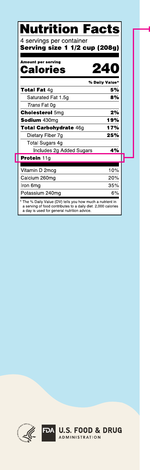 Etiqueta de información nutricional interactiva • octubre de 2021 Proteína 1 Proteína ¿Qué es? La proteína se encuentra en alimentos provenientes de plantas y animales. La proteína está compuesta por cientos o miles de unidades más pequeñas, denominadas aminoácidos, los cuales se enlazan entre sí en largas cadenas. La secuencia de aminoácidos determina la estructura única de cada proteína y su función específica. Existen 20 aminoácidos diferentes que se pueden combinar para formar cada tipo de proteína en el cuerpo. Estos aminoácidos se dividen en dos categorías: • Los aminoácidos esenciales se necesitan para el funcionamiento normal del cuerpo, pero el cuerpo no los produce y se deben obtener de los alimentos. De los 20 aminoácidos, 9 se consideran esenciales. • Los aminoácidos no esenciales pueden ser fabricados por el cu- erpo a partir de los aminoácidos esenciales que se consumen con los alimentos o mediante la desintegración normal de las proteínas del cuerpo. De los 20 aminoácidos, 11 se consideran no esenciales. ¿Dónde se encuentra? La proteína se encuentra en una variedad de alimentos, incluidos los siguientes: • Legumbres, guisantes o chícharos y lentejas • Lácteos (como la leche, el queso y el yogur) • Huevos • Carnes rojas y de aves • Frutos secos y semillas • Mariscos (pescado y crustáceos) • Productos de soya • Vegetales y granos enteros (en general, estos brindan menos proteínas que las que se encuentran en otras fuentes) ¿Qué hace? • La proteína proporciona calorías o “energía” para el cuerpo. Cada gramo de proteína proporciona 4 calorías. • La proteína es un componente de cada una de las células del cuerpo humano y es necesaria para el crecimiento y el desarrollo adecuados, especialmente durante la infancia, la adolescencia y el embarazo. • La proteína ayuda al cuerpo a construir y reparar las células y el tejido corporal. • La proteína es una parte importante de la piel, el cabello, las uñas, los músculos, los huesos y los órganos internos. La proteína también se encuentra prácticamente en todos los fluidos corporales. • La proteína es importante para muchos procesos del cuerpo, como la coagulación sanguínea, el equilibrio de fluidos, la respuesta inmu- nológica, la vista y la producción de hormonas, anticuerpos y enzimas. www.fda.gov/nutritioneducation http://www.fda.gov/nutritioneducation Información de salud • La mayoría de los estadounidenses consumen las cantidades recomendadas de proteína para satisfacer sus necesidades. Sin embargo, muchas personas no consumen suficientes mariscos, lácteos, legumbres, guisantes o chícharos, lentejas, frutos secos, semillas o productos de soya. • Hay evidencia de que existe un riesgo menor de desarrollar enfermedades cardiovasculares en adultos que tienen dietas con bajo contenido de carnes y carnes procesadas, granos refinados, y alimentos y bebidas azucarados; ricas en vegetales, frutas, granos enteros, lácteos descremados y mariscos; y que suelen incluir frutos secos y legumbres, guisantes o chícharos y lentejas. • Las Recomendaciones alimentarias para estadounidenses sugieren comer una variedad de alimentos proteicos de fuentes vegetales y animales. Estas recomendaciones también advierten que la mayor parte de la ingesta de carnes rojas y de aves debe ser magra (como pechuga de pollo o pavo molido) en lugar de procesada (como perros calientes, salchichas, jamón y fiambres). Proteínas: Un análisis más profundo Las proteínas dietéticas no son todas iguales. Están compuestas por diferentes combinaciones de aminoácidos y se caracterizan por la cantidad de aminoácidos esenciales que proporcionan. • Las proteínas completas contienen todos los aminoácidos esenciales en cantidades adecuadas. Los alimentos de origen animal (como los lácteos, los huevos, las carnes rojas y de aves y los mariscos y la soya son fuentes proteicas completas. • Las proteínas incompletas carecen de uno o más aminoácidos esenciales o no tienen los suficientes, lo cual hace que sea desequilibradas. La mayoría de los alimentos de origen vegetal (como las legumbres los granos, las frutas secas, los guisantes, las semillas y los vegetales) son fuentes incompletas de proteínas. • Las proteínas complementarias son dos o más fuentes de proteínas incompletas que, cuando se ingieren combinadas (en la misma comida o durante el mismo día), compensan la falta de aminoácidos de la otra. Por ejemplo, los granos tienen un bajo contenido del aminoácido lisina, mientras que los frijoles (legum- bres) y los frutos secos tienen un contenido bajo del aminoácido metionina. Cuando se ingieren granos y legumbres juntos (como arroz con frijoles o mante- quilla de maní con pan integral), forman una proteína completa. Pasos a seguir para controlar las proteínas de su dieta Utilice la etiqueta de Información Nutricional como una herramienta para controlar el consumo de proteínas y para elegir alimentos proteicos que tengan un conteni- do bajo de grasa saturada. En la etiqueta de Información Nutricional de los envases de alimentos y bebidas se muestra la cantidad en gramos (g) de proteínas por por- ción del alimento. En general, las proteínas no tienen el valor porcentual diario (%VD) detallado en la etiqueta; por lo tanto, utilice el número de gramos (g) como guía. Los fabricantes de alimentos pueden enumerar volun- tariamente el valor porcentual diario de proteínas por porción en la etiqueta de Información Nutricional, pero no se les exige que lo detallen si imprimen una declara- ción en el etiquetado del envase acerca de los efectos en la salud o la cantidad de proteínas (por ejemplo, “alto” o “bajo”) que contiene el alimento. El valor diario de proteínas es de 50g. Esto se basa en una dieta diaria de 2,000 calorías; es posible que su valor diario sea mayor o menor en función de sus necesidades calóricas. ¨ ¨ ¨ ¨ ¨ ¨