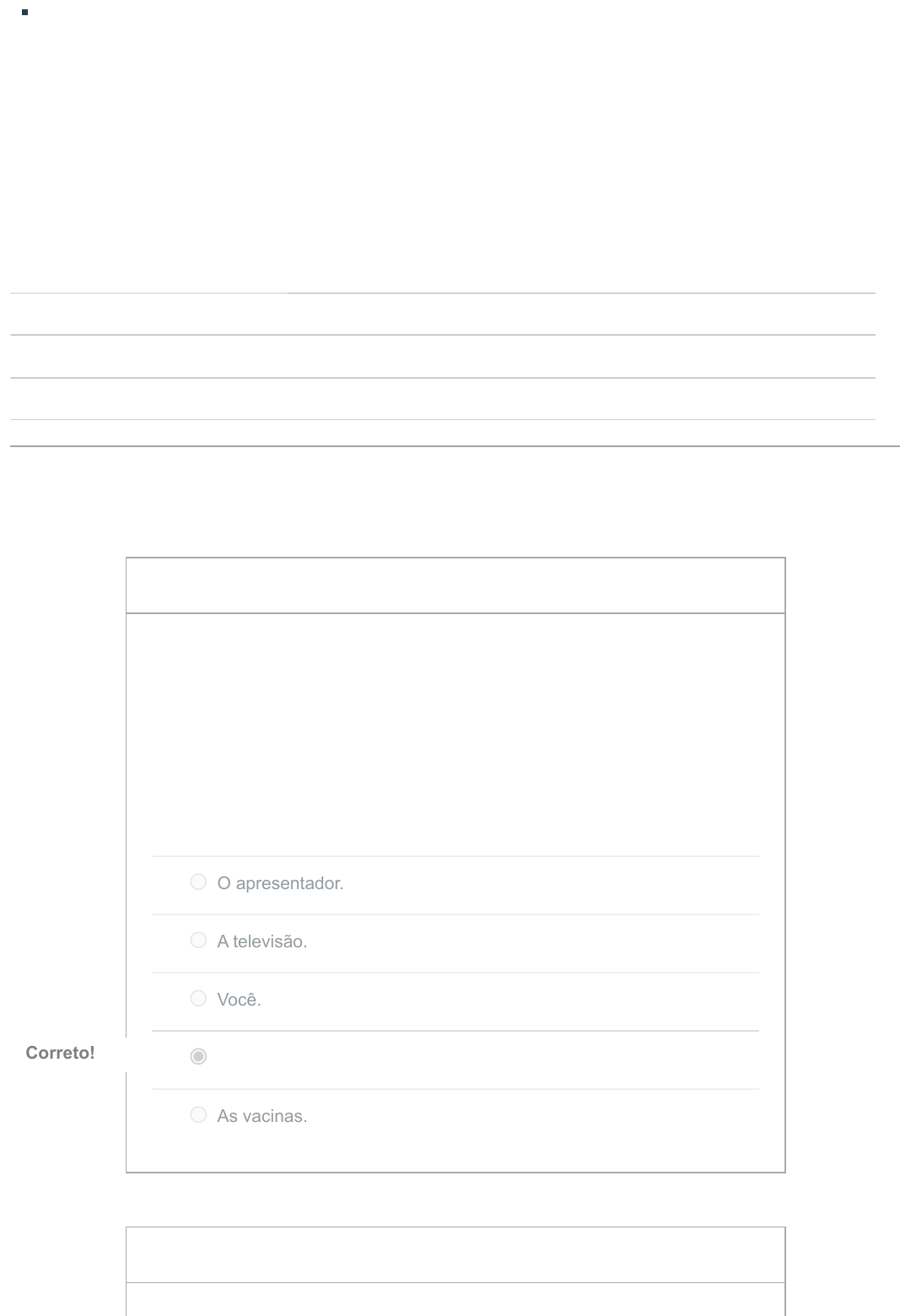 21/02/24, 21:41 Q02 - Questionário 02: Márcio Magalhães Araujo https://ucaead.instructure.com/courses/58566/assignments/101070/submissions/41651 1/3 Este teste foi travado 4 de set de 2022 em 23:59. Histórico de tentativas Tentativa Tempo Pontuação MANTIDO Tentativa 2 7 minutos 0,4 de 0,4 MAIS RECENTE Tentativa 2 7 minutos 0,4 de 0,4 Tentativa 1 7 minutos 0,1 de 0,4 Pontuação desta tentativa: 0,4 de 0,4 Enviado 3 de set de 2022 em 17:08 Esta tentativa levou 7 minutos. tionário e escolher a opção de "salvar em PDF". Bons estudos! 0,1 / 0,1 ptsPergunta 1 Imagine a seguinte situação: Você está assistindo a um jornal em rede nacional, aqui no Brasil, e o apresentador está dando uma notícia sobre as vacinas desenvolvidas para a imunização contra a COVID-19. Qual é o código? O apresentador. A televisão. Você. A língua portuguesa em sua forma oral. Correto!Correto! As vacinas. 0,1 / 0,1 ptsPergunta 2 https://ucaead.instructure.com/courses/58566/quizzes/78726/history?version=2 https://ucaead.instructure.com/courses/58566/quizzes/78726/history?version=2 https://ucaead.instructure.com/courses/58566/quizzes/78726/history?version=1 21/02/24, 21:41 Q02 - Questionário 02: Márcio Magalhães Araujo https://ucaead.instructure.com/courses/58566/assignments/101070/submissions/41651 2/3 Quando você consegue, por meio da argumentação, fazer com que a pessoa aja da maneira que você quer que ela o faça, você conseguiu o quê? Persuadir a pessoa. Correto!Correto! Convencer a pessoa. Discutir com a pessoa. Comunicar-se com a pessoa. Argumentar com a pessoa. 0,1 / 0,1 ptsPergunta 3 Qual a função de linguagem presente na imagem a seguir: https://www.comafen.org.br/noticias/visualizar/500 Fática. https://www.comafen.org.br/noticias/visualizar/500 https://www.comafen.org.br/noticias/visualizar/500 https://www.comafen.org.br/noticias/visualizar/500 21/02/24, 21:41 Q02 - Questionário 02: Márcio Magalhães Araujo https://ucaead.instructure.com/courses/58566/assignments/101070/submissions/41651 3/3 Conativa. Correto!Correto! Emotiva. Referencial. Poética. 0,1 / 0,1 ptsPergunta 4 Assinale a alternativa que indica a função da linguagem presente na manchete da notícia abaixo. https://www.faroldabahia.com/noticia/jornal-o-globo-deixara-de- circular-em-brasilia Fática. Poética. Referencial. Correto!Correto! Conativa. Emotiva. Pontuação do teste: 0,4 de 0,4 https://www.faroldabahia.com/noticia/jornal-o-globo-deixara-de-circular-em-brasilia https://www.faroldabahia.com/noticia/jornal-o-globo-deixara-de-circular-em-brasilia https://www.faroldabahia.com/noticia/jornal-o-globo-deixara-de-circular-em-brasilia https://www.faroldabahia.com/noticia/jornal-o-globo-deixara-de-circular-em-brasilia