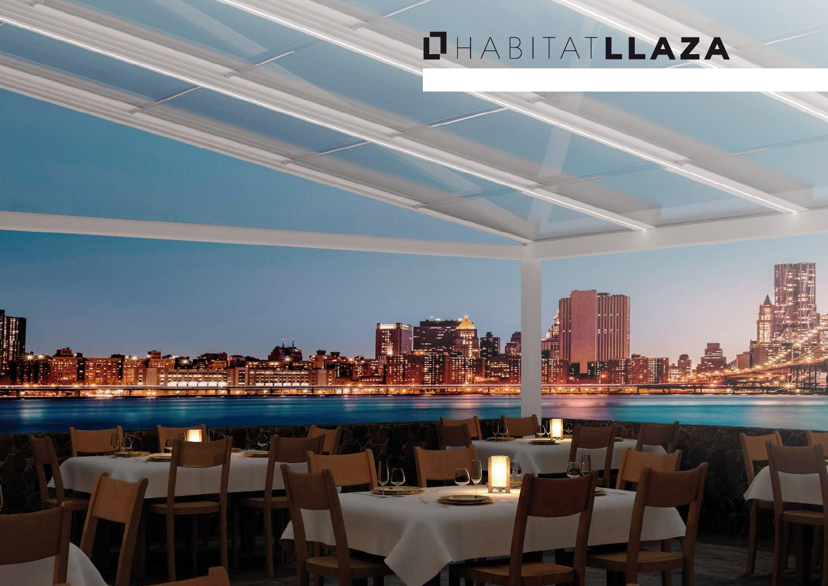 TECHOS | ROOF SYSTEMS TECHOS | ROOF SYSTEMS TECHOS | ROOF SYSTEMS 2 3 VERASTOR-SKY es un toldo veranda de dimensiones espectacula- res: 14 metros de l ínea y 7 metros de proyección con 6 guías, cuan- do se instala sobre estructura. Dispone de potentes pistones de gas y un sistema patentado de blo- queo que ejercen tensión en la lona para que se mantenga tensa, fuerte y resulte visualmente muy atractiva. Su instalación puede realizarse sobre estructura, a pórtico y entre- paredes gracias a todos los accesorios y complementos que le con- vierten en un producto que ofrece un amplio abanico de soluciones. Opcionalmente incorpora iluminación en el perfil horizontal interme- dio y en las nuevas guías reforzadas para instalaciones a pórtico. TUPAK es un sistema innovador de techo móvil de cristal sin perfile - ría horizontal que trasmite más ligereza y claridad. Este techo es el primero del mercado se ha homologado en cuanto a estanqueidad al agua y resistencia al viento y la nieve. TUPAK dispone de su propia estructura de sustentación, con pilares y evacuación de aguas. Es un sistema completo, con iluminación LED opcional, que también permite incorporar cerramientos latera- les, tanto verticales como horizontales. Otra de sus ventajas competitivas consiste en el procedimiento de montaje, que se realiza desde abajo. De esta forma es más fácil y seguro de instalar. Estar bajo techo genera sensación de seguridad y privacidad. A las personas nos encanta disfrutar del aire libre y la luz del sol, siempre con la sensación de estar protegidos y tenerlo todo bajo control. Sea de cristal transparente o de un tejido adecuado, la cubierta nos res- guarda de las incomodidades que a veces tienen los espacios abiertos. Esta vivencia positiva se hace posible gracias a los dos productos que HABITAT LLAZA incorpora en su selección de techos móviles: 4 VERASTOR-SKY. This veranda awning has amazing dimensions: 14 metres in length and 7 metres of projection with 6 guides when ins- talled on a structure. It features powerful gas pistons and a patented locking system that create tension in the canvas to keep it taut and strong, making the installation very visually attractive. Its accessories and components mean that it can be installed on a structure, as a portico or between walls, so this is an option that of fers a wide range of solutions. Lighting can also be added to the middle horizontal profile and in the new reinforced guides for portico installations with projections of up to six metres. TUPAK glass roof. An innovative enclosure system for mobile roo - f ing without horizontal prof i les. This characterist ic makes i t both l ighter and clearer, whi le st i l l maintaining its strength. This is the f i rst system of i ts k ind on the market with val idated water t ightness and wind and snow resistance. TUPAK comes with its own weight-bearing structure with pillars and a water runoff system. It is a complete system with optional LED lighting to which both vertical and horizontal perimeter enclosures can also be added. Another one of its competitive advantages is its bottom-up assembly procedure, which makes it easier and safer to install. Being indoors gives us a feeling sense of safety and privacy. People love to enjoy the open air and sunlight, especially when we feel pro- tected and like everything is under control. Whether made of transparent glass or just the right fabric, a roof overhead protects us from the inconveniences that being outdoors can sometimes present. This positive experience is possible thanks to two products that HABITAT LLAZA has added to its selection of mobile roofing: TECHOS | ROOF SYSTEMS 5 6 7 VERASTOR-SKY VERANDA TUPAK TECHO CRISTAL GLASS ROOF 08 20 Pag. DETALLES | DETAILS 34 8 9 VERASTOR-SKY OPCIONAL | OPTIONAL VENTAJAS | HIGHLIGHTS COLORES | COLOURS PROTECCIÓN RAYOS UV UV RAY PROTECTION CONFORT VISUAL VISUAL COMFORT ILUMINACIÓN LED LED LIGHTING VERASTOR-SKY es la solución perfecta para proporcionar sombra a lucernarios y cerramientos acristalados, pero tam- bién podemos incorporarlo a estructuras de aluminio y con- ver tir lo en un toldo horizontal con o sin inclinación. Su lona se mantiene siempre firme y tensa gracias a los po- tentes pistones de gas y el exclusivo mecanismo de bloqueo patentado. Otro punto fuer te es su gran capacidad de sombra con una única lona de hasta 14 metros de l ínea. Destaca sin duda por su facil idad, seguridad y rapidez en el montaje, com- plementado con un diseño atractivo y de fácil integración. La posibi l idad de incorporar i luminación LED es otro punto a favor para que VERASTOR-SKY se convier ta en el mejor al iado para disfrutar de espacios de luz sean interiores o exteriores, de día o de noche. VERASTOR-SKY is the perfect solution to provide shade for skyl ights and glass enclosures. It can also be used with alu- minium structures, or as a horizontal awning that can be inclined or flat. The fabric remains taut at al l t imes thanks to the powerful gas pistons and the exclusive patented locking system. Another strong point is its extensive coverage capacity: up to 14 m width with a single piece of fabric. It is easy to ope- rate, safe and installs quickly and simply, as well as having a design that is both attractive and easy to integrate into all types of sett ings. The possibi l i ty of incorporating LED l ighting is another rea- son VERASTOR-SKY is the perfect al ly for enjoying spaces of l ight, whether they are indoors or outdoors, at day or night. Libre elección entre 15 colores al mismo precio. Consultar otras opciones. Choice of 15 colours at the same price. Enquire about other options. RAL 1015 -909+01015 Marfil claro Light Ivory RAL 9016 -909+09016 Blanco tráfico Traffic White RAL 8014 -909+08014 Marrón Sepia Sepia Brown DB703 -909+99703 Antracita metálico Metallic anthracite RAL 9005 -909+9405 Negro textura Texture Black RAL 9011 -909+09011 Negro grafito Graphite black RAL 7016 -909+07416 An
