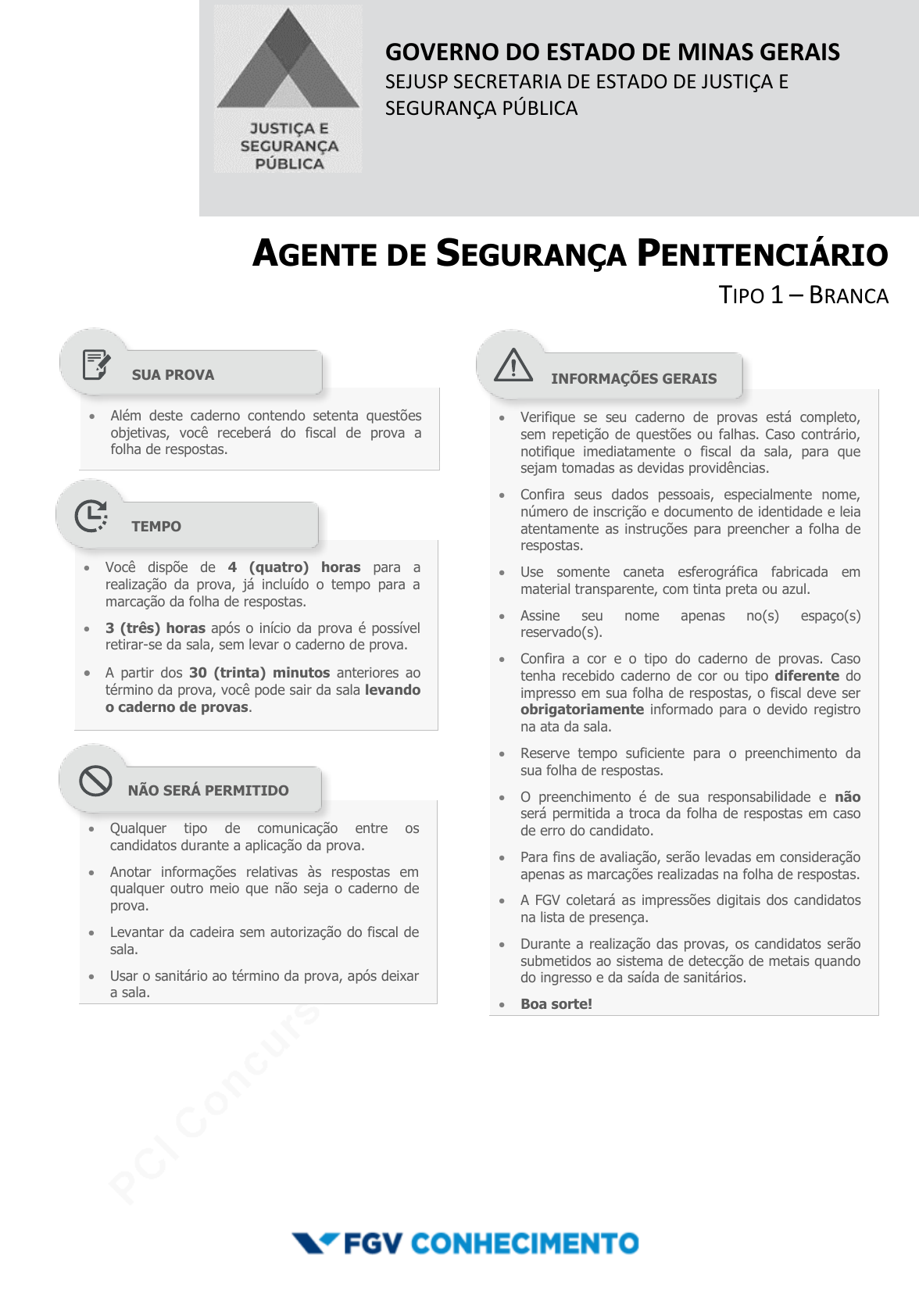 pcimarkpci MjgwNDowZDU1OjRmODE6ZjIwMDo0YzEwOjE5ODM6NjA3Njo3ZDU5:VGh1LCAyMiBGZWIgMjAyNCAyMDo1Njo1MiAtMDMwMA== www.pciconcursos.com.br GOVERNO DO ESTADO DE MINAS GERAIS SEJUSP SECRETARIA DE ESTADO DE JUSTIÇA E SEGURANÇA PÚBLICA AGENTE DE SEGURANÇA PENITENCIÁRIO TIPO 1 – BRANCA Além deste caderno contendo setenta questões objetivas, você receberá do fiscal de prova a folha de respostas. Verifique se seu caderno de provas está completo, sem repetição de questões ou falhas. Caso contrário, notifique imediatamente o fiscal da sala, para que sejam tomadas as devidas providências. Confira seus dados pessoais, especialmente nome, número de inscrição e documento de identidade e leia atentamente as instruções para preencher a folha de respostas. Use somente caneta esferográfica fabricada em material transparente, com tinta preta ou azul. Assine seu nome apenas no(s) espaço(s) reservado(s). Confira a cor e o tipo do caderno de provas. Caso tenha recebido caderno de cor ou tipo diferente do impresso em sua folha de respostas, o fiscal deve ser obrigatoriamente informado para o devido registro na ata da sala. Reserve tempo suficiente para o preenchimento da sua folha de respostas. O preenchimento é de sua responsabilidade e não será permitida a troca da folha de respostas em caso de erro do candidato. Para fins de avaliação, serão levadas em consideração apenas as marcações realizadas na folha de respostas. A FGV coletará as impressões digitais dos candidatos na lista de presença. Durante a realização das provas, os candidatos serão submetidos ao sistema de detecção de metais quando do ingresso e da saída de sanitários. Boa sorte! Você dispõe de 4 (quatro) horas para a realização da prova, já incluído o tempo para a marcação da folha de respostas. 3 (três) horas após o início da prova é possível retirar-se da sala, sem levar o caderno de prova. A partir dos 30 (trinta) minutos anteriores ao término da prova, você pode sair da sala levando o caderno de provas. Qualquer tipo de comunicação entre os candidatos durante a aplicação da prova. Anotar informações relativas às respostas em qualquer outro meio que não seja o caderno de prova. Levantar da cadeira sem autorização do fiscal de sala. Usar o sanitário ao término da prova, após deixar a sala. SUA PROVA TEMPO NÃO SERÁ PERMITIDO INFORMAÇÕES GERAIS pcimarkpci MjgwNDowZDU1OjRmODE6ZjIwMDo0YzEwOjE5ODM6NjA3Njo3ZDU5:VGh1LCAyMiBGZWIgMjAyNCAyMDo1Njo1MiAtMDMwMA== www.pciconcursos.com.br pcimarkpci MjgwNDowZDU1OjRmODE6ZjIwMDo0YzEwOjE5ODM6NjA3Njo3ZDU5:VGh1LCAyMiBGZWIgMjAyNCAyMDo1Njo1MiAtMDMwMA== www.pciconcursos.com.br SECRETARIA DE ESTADO DE JUSTIÇA E SEGURANÇA PÚBLICA DE MINAS GERAIS FGV Agente de Segurança Penitenciário Tipo Branca – Página 3 Língua Portuguesa Atenção! O texto a seguir refere-se às duas próximas questões. “A crise de criminalidade do Brasil é produto da impunidade. A impunidade, por sua vez, tem duas raízes. A primeira é a incapacidade do sistema de Justiça Criminal de impedir os crimes e identificar, prender e manter os criminosos depois que o crime foi cometido. A segunda raiz é uma legislação penal criada com base na ideologia do criminoso ‘vítima da sociedade’ e em algumas ideias absurdas, sem nenhum compromisso com a realidade”. (Adaptado) 1 “A crise de criminalidade do Brasil é produto da impunidade”. Essa frase inicial do texto (A) resume integralmente o conteúdo do texto. (B) fala de algo que fica sem explicações. (C) simplifica exageradamente um problema grave. (D) não mostra relação de causa e efeito. (E) é retificada no restante do parágrafo. 2 Esse texto deve ser classificado como (A) descritivo cujo objeto é a situação criminal do país. (B) narrativo a respeito da origem da crise de criminalidade. (C) descritivo-narrativo com a mistura de passado e presente. (D) expositivo, informando sobre nossa legislação penal. (E) argumentativo, apontando causas do problema. 3 “Quando um dos pioneiros da aviação se propôs a voar como os pássaros, todos acharam a tarefa impossível, mas esse pioneiro chegou a fazer mais de dois mil voos, provando que o impossível era apenas um desafio. Essa é a filosofia da nossa empresa: encontrar soluções rápidas, econômicas e criativas, superando todo tipo de desafio”. O fragmento acima é iniciado por uma alusão histórica que, nesse caso, serve de (A) ponto de partida para a apresentação cronológica de fatos. (B) ponto de referência para elogios ao passado. (C) tema analógico a algo no presente. (D) assunto provocador de críticas à atualidade. (E) ponto de referência por oposição ao mundo atual. 4 Os textos informativos preocupam-se em dar credibilidade ao que informam, atribuindo o valor de certeza ao que veiculam. Assinale a opção em que não há nenhum termo que reduza esse tom de precisão absoluta. (A) Segundo alguns, dinheiro não traz felicidade, mas é certo que afasta a infelicidade para bem longe. (B) O novo governo americano talvez traga mais tranquilidade econômica aos EUA. (C) O controle da poluição ambiental poderia produzir mais riqueza no futuro do planeta. (D) Como o governador é muito amigo do prefeito, possivelmente devem fazer muitas parcerias. (E) Millôr Fernandes afirmou que devagar se vai ao longe, mas quando se chega lá não se encontra mais ninguém. 5 “Houve revoltas em meados do século XIX”; a expressão “em meados de” indica imprecisão nos dados fornecidos. Assinale a opção que não apresenta uma expressão que desempenhe esse mesmo papel. (A) Havia perto de 100 artistas no festival. (B) João estava com seus cinquenta anos por essa época. (C) Chegou mais ou menos às sete horas. (D) A temperatura atingiu vinte e seis graus negativos. (E) Jorge tinha por aí um metro e setenta. 6 “A avançada tecnologia é uma das marcas dos tempos modernos”. Assinale a opção que apresenta um vocábulo, formado com o mesm