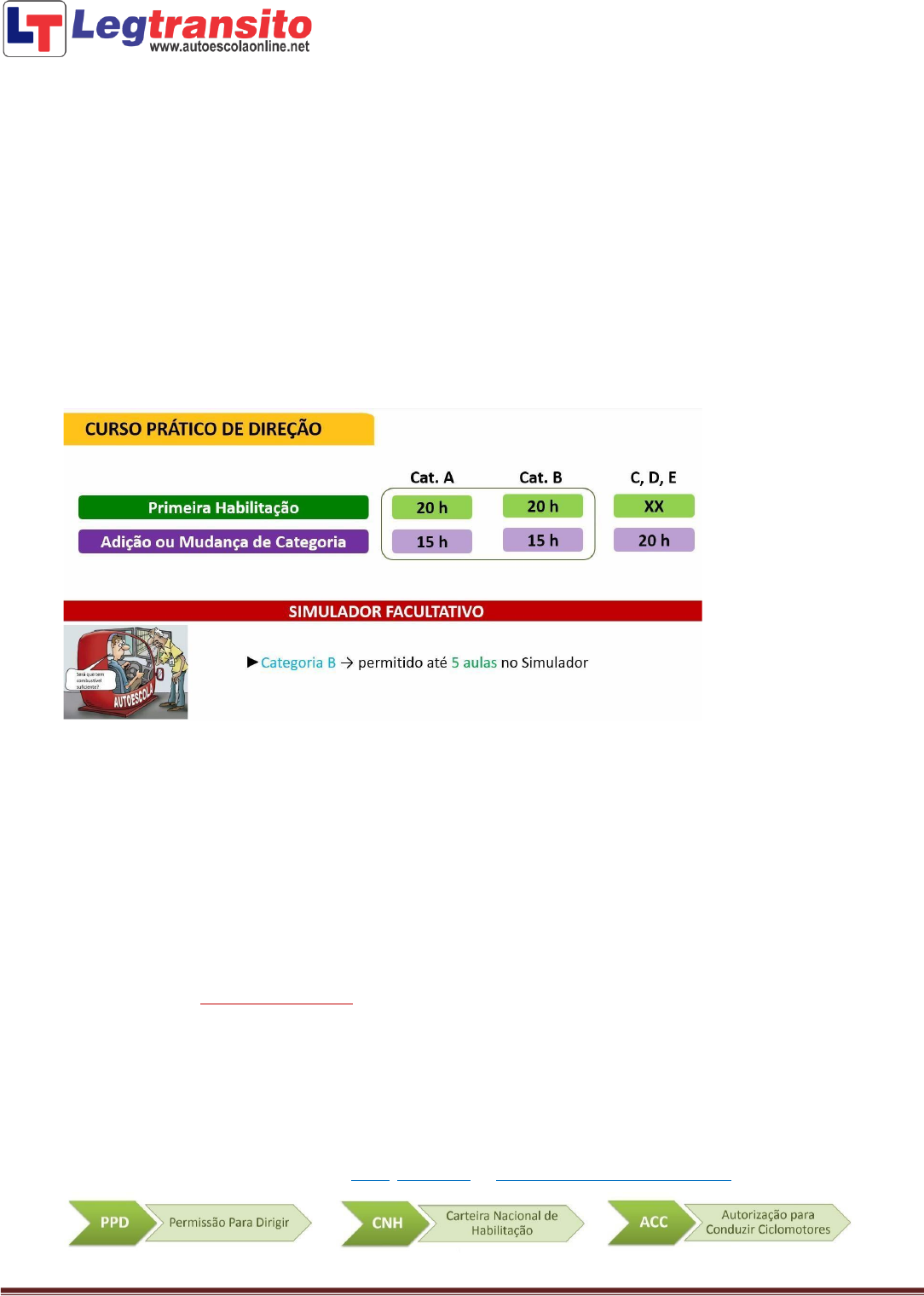Prof. Ronaldo Cardoso | e-mail: contato@autoescolaonline.net | Canww.YouTube.com/LegTransito 1 PROCESSO de HABILITAÇÃO 1. Pré-requisitos ao candidato à habilitação: ► Ser penalmente imputável – Pessoa que possa ser responsabilizada perante a Lei Penal; ► Saber ler e escrever - Não se exige grau de escolaridade, basta que saiba ler e escrever; ► Possuir documento de identificação - RG, Carteira de Trabalho, Passaporte ou outro documento com foto; ► Possuir CPF. Obs. O processo de habilitação tem duração de 12 meses, a contar da data de cadastro no sistema BINCO (Base Índice de Condutores) e no RENACH (Registro Nacional de Condutores Habilitados). 2. Etapas do Processo de Habilitação: ► Exames Físico e Mental e Avaliação Psicológica; ► Curso Teórico Técnico (45 horas-aula) e Exame Teórico (70% de aproveitamento para aprovação) ► Curso Prático de Direção (20 horas-aula categoria inicial A ou B ou) e Exame de Direção. 3. ACC - Autorização para Conduzir Ciclomotores (Cinquentinhas): a. Curso Teórico com 20 horas-aula e Prova Teórica com 15 questões → mínimo 60% para aprovação. b. Curso Prático de Direção com 5 horas-aula e Prova de Direção, em motopista, conforme categoria A. Obs. Em caso de reprovação em qualquer exame, a marcação poderá ser feita após 5 dias e se reprovado pela segunda vez, poderá refazer o curso referente à etapa na qual foi reprovado → o exame pode ser realizado em ciclomotor próprio. 4. LADV – Licença e Aprendizagem e Direção Veicular: ► Documento emitido ao candidato aprovado na primeira e segunda etapa do processo de habilitação - necessário para treinamento da prática veicular. Obs. O candidato que for flagrado treinando em desacordo com a legislação de trânsito, além das sanções previstas pelo CTB, terá sua LADV suspensa por 6 meses. MACETE: Suspensa começa com “S” e Seis meses também. 5. Em qual categoria começar: ► O candidato poderá requerer as categorias A, B ou A e B simultaneamente, bem como a ACC. Obs. Ao candidato aprovado em todas as etapas do processo, será conferida a PPD ou ACC provisória, com validade de 1 ano. Caso seja reprovado, poderá repetir o exame a qualquer tempo (na ACC o prazo para reexame é de 5 dias). Obs. O portador da PPD ou ACC Provisória, poderá solicitar a habilitação definitiva, após 1 ano, desde que não tenha cometido nenhuma infração de natureza grave, gravíssima ou reincidência em infrações médias. mailto:contato@autoescolaonline.net Prof. Ronaldo Cardoso | e-mail: contato@autoescolaonline.net | Canww.YouTube.com/LegTransito 2 6. Outros tipos de veículos e suas definições: ► CICLOMOTOR: Veículo automotor de 2 ou 3 rodas, cuja cilindrada não exceda a 50 cm3, ou elétrico com máximo de 4 kW, e velocidade máxima de 50 km/h → popular “cinquentinha”. ► MOTONETA: Veículo automotor de 2 rodas conduzido por condutor em posição sentada. ► MOTOCICLETA: Veículo automotor de 2 rodas conduzido por condutor em posição montada. ► TRICICLO: Veículo com estrutura mecânica similar às motocicletas, dotado de três rodas dispostas simetricamente, com motor de propulsão com cilindrada superior a 50 cm3, conduzido por condutor e posição montada ou sentada. ► QUADRICICLO: Veículo automotor com estrutura mecânica similar às motocicletas, possuindo eixo dianteiro e traseiro, dotado de quatro rodas, com massa em ordem de marcha NÃO superior a 400kg, ou 550kg no caso do veículo destinado ao transporte de cargas e potência máxima NÃO superior a 15kW. ► BICICLETA ELÉTRICA: Veículo de duas rodas, impulsionado por um motor elétrico cuja potência não exceda a 350 Watts, velocidade máxima de 25 km/h, funcionamento do motor somente ao pedalar e NÃO possui acelerador. ► VEÍCULO AUTOPROPELIDO: Equipamento de mobilidade individual NÃO equiparado ao ciclomotor ou bicicleta elétrica. Velocidade máxima de 6 km/h para circular entre pedestres ou 20 km/h em ciclovias. Equipado com velocímetro, campainha e sinalização noturna; dimensões NÃO superiores a de uma cadeira de rodas. 7. Renovação da Habilitação: ► Consiste em ser aprovado nos exames físico e mental (e psicológico se EAR), observando os seguintes prazos: a. De 10 em 10 anos, para condutores com menos de 50 anos de idade; b. De 5 em 5 anos, para condutores com idade entre 50 e 69 anos; c. De 3 em 3 anos, para condutores com 70 anos ou mais; d. A critério do médico avaliador, os prazos podem ser reduzidos, em razão de alguma anormalidade. Obs. Para os condutores habilitados nas categorias C, D ou E é necessário passar por exame toxicológico. 8. Para que serve cada categoria de habilitação e quais os prazos de troca entre elas. mailto:contato@autoescolaonline.net Prof. Ronaldo Cardoso | e-mail: contato@autoescolaonline.net | Canww.YouTube.com/LegTransito 3 9. Veículo utilizado para fazer exame em cada uma das categorias e ACC: 10. Habilitação para atividades remuneradas: a. TRANSPORTE COLETIVO DE PASSAGEIROS: ► Categoria D ou E; ► Mínimo de 21 anos de idade; ► Curso de transporte coletivo de passageiros; ► Não ter cometido mais de uma infração gravíssima nos últimos 12 meses; ► Não estar sob efeito de Suspensão ou Cassação da CNH. b. TRANSPORTE ESCOLAR: ► Categoria D ou E; ► Mínimo de 21 anos de idade; ► Curso de transporte escolar; ► Não ter cometido mais de uma infração gravíssima nos últimos 12 meses; ► Não estar sob efeito de Suspensão ou Cassação da CNH. Obs. O veículo para este tipo de atividade deve possuir: Faixa amarela de 40 cm de largura; Registro como veículo de passageiros; Inspeção de segurança, semestral; Cinto para todos os ocupantes; Luzes de posição; Tacógrafo. c. OPERADOR DE MÁQUINAS: ► Categoria C, D ou E; ► Mínimo de 21 anos de idade; Obs. Não é exigida habilitação para operar estes veículos em canteiros de obras (fora da via pública). Obs. O 