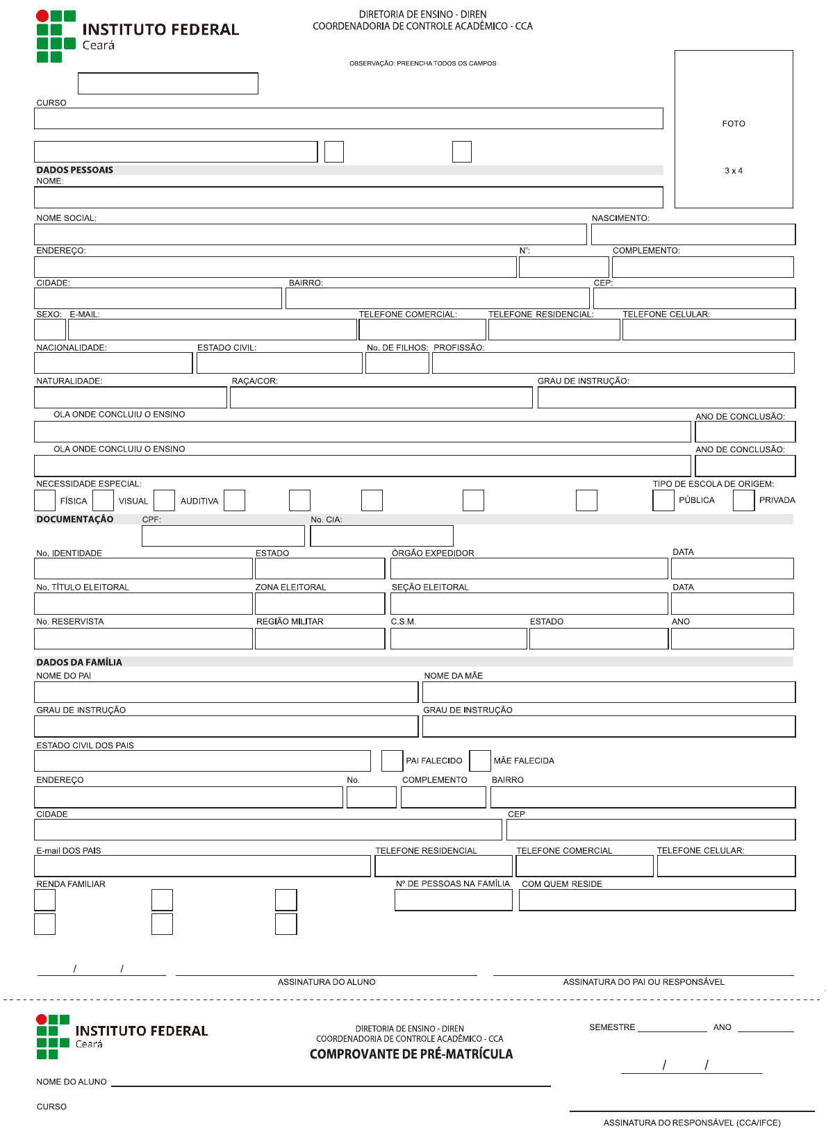 RPC <= 0,5 SM 0,5 SM < RPC <= 1 SM 1 SM < RPC <= 1,5 SM 1,5 SM < RPC <= 2,5 SM 2,5 SM < RPC <= 3 SM RPC > 3 SM MODALIDADE DE CONCORRÊNCIA COTA ________ FORMA DE INGRESSO A CONFIRMAÇÃO DE MATRÍCULA deverá ser realizada, impreterivelmente, no decorrer da primeira semana de aula, com previsão de início em _____ / _____ / ________ / MODALIDADE ESC FUNDAMENTAL AMPLA CONCORRÊNCIA MENTAL MÚLTIPLA SUPERDOTAÇÃO CONDUTAS TÍPICAS OUTRAS DO PAI DA MÃE * SM : Salário Mínimo * RPC : Renda Per Capta PER CAPITA ESC MÉDIO CAMPUS DATA DA MATRÍCULA CPF DO RESPONSÁVEL (Se o candidato for menor de idade) SEMESTRE ANO FICHA DE MATRÍCULA CCA Rectángulo CCA Rectángulo CCA Línea CCA Línea CCA Línea Mauro Máquina de escrever NIS Mauro Destacar Mauro Retângulo