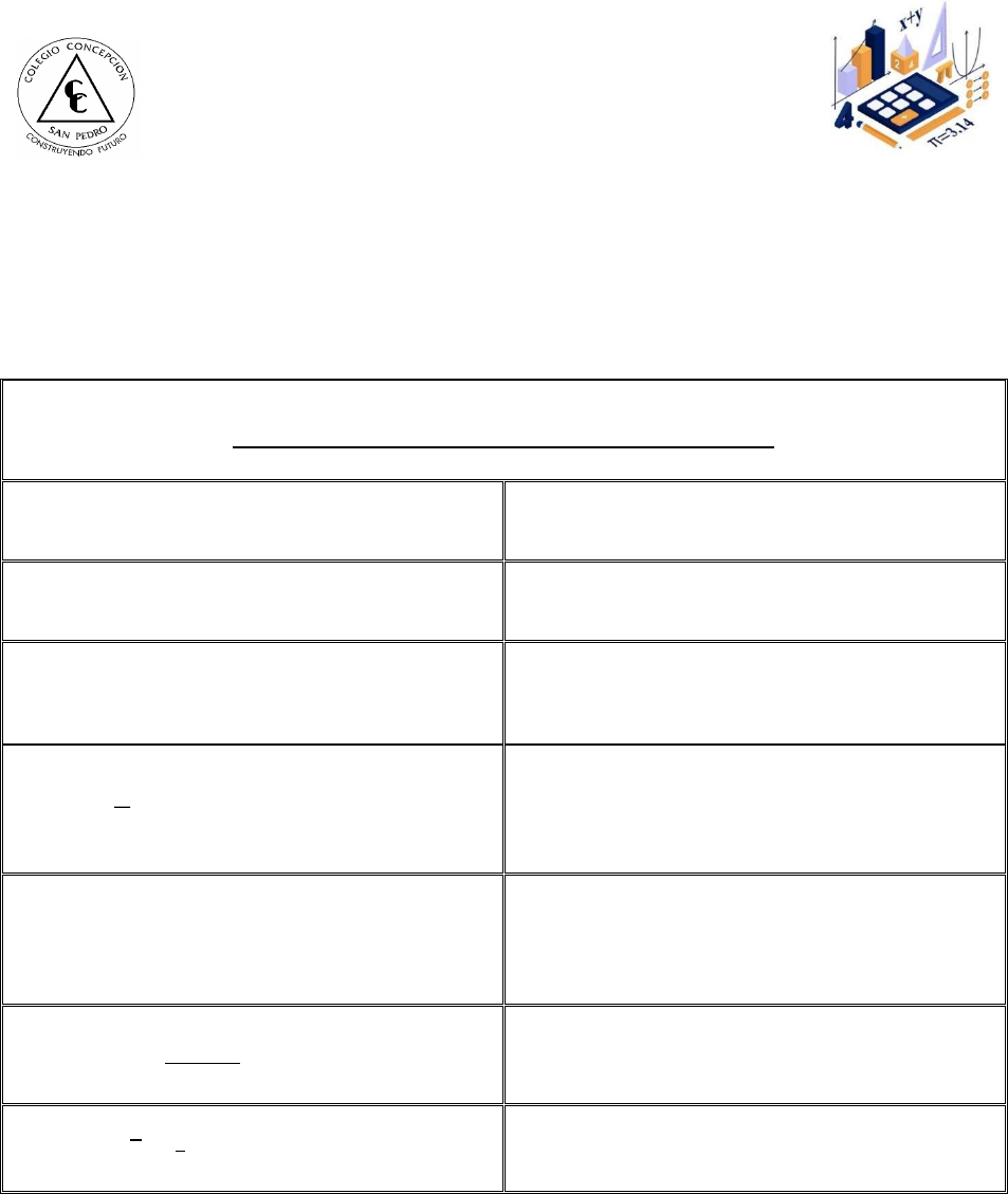 1 GUIA DE APRENDIZAJE N°5 LOGARITMOS Departamento de Matemática Nombre del profesor(a): Georg Waghorn P. Nombre del Estudiante:……………………………………………………………………………Curso: 2° Medio B Nombre de la Unidad: Logaritmos Objetivo de aprendizaje: Aplicar propiedades de los logaritmos. Tiempo de desarrollo: 60 minutos Dudas y consultas al mail: g.waghorn@coemco.cl Fecha de envío: Viernes 19 de junio hasta las 18:00 hrs. Vía Classroom o mail profesor Retroalimentación vía plataforma Google meet en horario estipulado por U.T.P. PROPIEDADES DE LOS LOGARITMOS.- 1.- log a a = 1 El logaritmo en base a de a es 1. 2.- log a 1 = 0 El logaritmo en base a de 1 es cero. 3.- log a (x y) = loga x + loga y El logaritmo de un producto es igual a la suma de los logaritmos de los factores. 4.- loga( x y )= loga x - loga y El logaritmo del cociente es igual al logaritmo del numerador menos el logaritmos del denominador. 5.- log axp = p loga x El logaritmo de una potencia es igual al exponente multiplicado por el logaritmo de la base. 6.- log10 x = 10 log x log a a Cambio de base. 7.- log a √𝒙 𝒏 = 𝟏 𝒏 log a x El logaritmo de la raíz enésima de x es igual a la enésima parte del log en base a de x. 2 Aplicando las propiedades de los logaritmos, calcular: Aplicando las propiedades , reduzca las expresiones siguientes: 1) log a + log b + 2 log c 2) log a + log b + 2 log c 3) log u - log w - 2 log x 4) - log p - log q - 2 log r 5) 1 2 log l - 3 log m + 2 log n 6) 5log a - 4 log b + 7 log c 7) log a2 - log b - 1 27 log c 8) 3 log j - 1 4 log k + 2 log g 1) log a 1 + log b b n + log c 1 nc 2) log a a 2 + log b b 3 3) log a 1 - log b b n + log c 1 nc 4) log a a 2 - log b b 3 5) - log a 1 + log b b n - log c 1 nc 6) - log a a 2 + log b b 3 7) log a a + log b b3 + log c c4 8) log a a - log b b3 + log c c4 3 Calcula el valor de las siguientes expresiones, aplicando propiedades y definición de logaritmo: 1) log8 (512) + log (10.000) – log2 (32) = 2) 2log5 (25) – 3log7(49) + 4log (1.000) = 3) log (0,01) + log0,3 (0,081) = 4) 1 5 log3 (81) - 2 3 log4 (64) = 5) log5 √25 3 + log5 √52 5 = 6) log2/3 ( 4 9 ) – log5/6 ( 125 216 ) + log2/4 ( 32 1024 ) = 7) log2 1 128 + log3 1 81 + log5 1 125 = 8) 2log1/2 (32) + 7log1/5 (125) – 6log1/3(243) = 9) -9𝑙𝑜𝑔5 (625)+ 5 6 𝑙𝑜𝑔2 (16) −5 log (1000000) = 10) 5 4 𝑙𝑜𝑔6 ( 216)−8 log(100)+3 𝑙𝑜𝑔8 (1) 2 9 𝑙𝑜𝑔2(64)