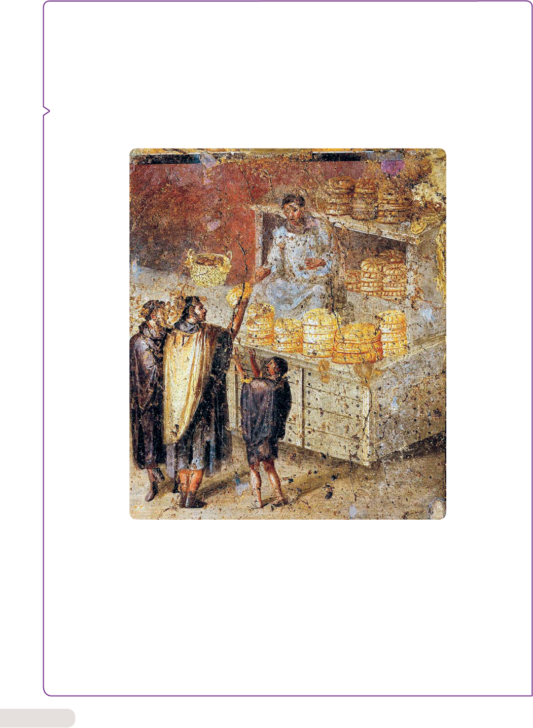 156 civilizAçõES AnTigAS c) Descreva a cena representada na face da moeda exibida à direita na página anterior. d) A moeda, cuja imagem está reproduzida na página anterior, esteve em circulação no século II a.C. Nessa época, o que mais caracterizava a vida política e militar de Roma? e) Considerando o contexto histórico do século II a.C. e as figuras observadas na página anterior, que importância simbólica você pensa que poderia ter a circulação dessa moeda? 3 Análise de imagem A imagem abaixo, datada do século I, é um afresco encontrado na cidade de Pompeia. M u se u A rq u eo ló g ic o N ac io n al , N áp o le s, It ál ia /D e A g o st in i P ic tu re L ib ra ry /T h e B ri d g em an /K ey st o n e a) Observe com atenção as personagens e o ambiente retratado na pintura. Descreva o que você vê. b) Pelo que nos é sugerido na imagem, você diria que Pompeia era uma cidade movimentada e próspera ou pequena e provinciana? Por quê? c) Que indício a imagem nos oferece sobre a condição da mulher na sociedade romana? d) O consumo de grãos da população romana superava em muito a quantidade do que era produzido na península Itálica. De que maneira, então, os padeiros poderiam obter a matéria-prima necessária para manter seus negócios? e) Alguns historiadores acreditam que essa imagem poderia ser muito mais do que uma simples repre- sentação de venda de pães. Talvez uma pintura que mostrasse a distribuição de pães por parte do proprietário do negócio local (Sotérico) aos cidadãos para angariar apoio político. Quais elementos da imagem você destacaria que reforçariam essa hipótese? HGB_v1_PNLD2015_144a171_U2_C5.indd 156 3/8/13 9:44 AM A civilizAção romAnA 157 Com a centralização do poder nas mãos do im- perador e a diminuição do poder do Senado, ocorreu uma profunda reforma política em Roma. O impera- dor passou não só a deter o poder político, mas tam- bém a ser cultuado como uma divindade, como indica seu título de augustus (‘o divino’). Na prática, os impe- radores eram ainda comandantes do Exército e impu- nham sua autoridade pela força. Otávio Augusto, ao implantar o Império, dedi- cou-se a instituir reformas administrativas que pro- gressivamente favoreceram a constituição de uma burocracia, nomeada com base em critérios censitá- rios, ou seja, de acordo com os rendimentos. A burocracia era a nova classe privilegiada de Roma, formada tanto pela antiga aristocracia o Alto império (séculos i a.c.-iii d.c.) patrícia (que assim mantinha seus privilégios, embo- ra subordinada politicamente ao imperador) quanto pelos comerciantes enriquecidos com a expansão ter- ritorial (homens-novos que, dessa forma, ganhavam espaço na partilha do poder). Atenuava-se, assim, a tensão social entre as ca- madas mais abastadas. Otávio praticou várias vezes a doação de trigo (e, posteriormente, de pão) ao povo. Já os munera ou ludi (jogos, disputas e combates entre gladiadores) eram celebrados de acordo com a von- tade do imperador e as circunstâncias políticas. Em obra denominada O pão e o circo, o historiador Paul Veyne propõe um estudo sobre o funcionamento polí- tico de Roma fazendo com que a expressão “pão e cir- co” tenha sido utilizada por alguns historiadores para descrever os mecanismos políticos na Roma antiga. Leia, a seguir, a interpretação do historiador francês sobre essas estratégias. burocracia: nesse contex- to, o termo refere-se a um sistema de hierarquias com distribuição de funções e responsabilidades na admi- nistração pública. Além de garantir os privilégios da elite burocrá- tica e o sustento da plebe, Otávio manteve a expan- são territorial como objetivo permanente do Império. Roma conquistava territórios cada vez mais extensos. Centenas de milhares de estrangeiros eram escravi- zados, e seu trabalho se tornou a base da economia romana. Ao mesmo tempo, o exército se fortalecia, o que era sinônimo de estabilidade política, isto é, de um imperador também forte. O governo de Otávio Augusto (27 a.C.-14 d.C.) foi caracterizado ainda pela ampliação do comércio entre as províncias, construção de estradas, pontes e aquedutos e grandes realizações culturais. A literatu- ra floresceu, destacando-se a atuação do ministro Me- cenas, que apoiou financeiramente artistas e escrito- res como os poetas Virgílio, Horácio e Ovídio (origem da expressão mecenato). Esse período, considerado o mais rico da civilização romana em termos culturais, foi denominado Alto Império. Após a morte de Otávio Augusto, assumiu o governo o imperador Tibério, seguindo-se diversos governantes tradicionalmente lembrados de manei- ra negativa. O governo de Tibério teria sido marcado pela imoralidade e pela corrupção, com intrigas, cons- pirações e perseguições. Foi durante seu governo que Jesus Cristo foi crucificado. Seu sucessor, Calígula, teria sido um déspota, e Cláudio, que o sucedeu, foi envenenado pela própria esposa. estratégias Políticas A doação ocupava um lugar muito importante na sociedade ro- mana: pão (sob a forma da distribuição de trigo), circo (organização de lutas de gladiadores) e festins públicos para o povo, mas também distribuição de terras, presentes para marcar o início do ano, presen- tes para o imperador e seus funcionários, etc. A maioria dos monu- mentos públicos das cidades greco-romanas (anfiteatros, basílicas, termas, etc.) foi oferecida por notáveis. Eu estava convencido de que essas doações não guardavam relação nenhuma com uma tentativa de despolitização e de manobra dos poderosos para afastar o povo da política. Na sociedade romana, os notáveis não eram senhores que viviam em seus castelos, mas nobres que viviam na cidade – como, aliás, aconteceria mais tarde, na Itália medieval –, e essa nobreza enxergava a cidade como sua propriedade, que ela governava. Em lugar de embelezar seus castelos, os nobres emb