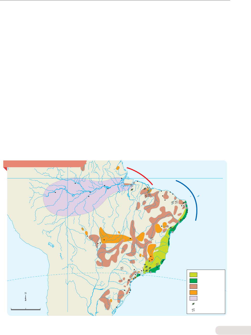 amérIca portugueSa: expanSão e dIverSIdade econômIca 87 Outras atividades e expansãO territOrial A subordinação à metrópole não impediu que houvesse certo dinamismo nas relações econômi- cas e comerciais na América portuguesa. Houve até mesmo um comércio direto com áreas que não per- tenciam ao domínio português, como a região do rio da Prata, no sul da América, e com regiões africanas, como Angola, Costa da Mina e Moçambique, além de Goa e Macau, na Ásia. Também no tráfico de es- cravos, vários comerciantes que abasteciam de es- cravos a colônia portuguesa e aqui residiam negocia- vam diretamente com fornecedores locais africanos. Outras atividades que reforçavam esse dinamismo eram o comércio interno de alimentos e os emprés- timos. Alguns se dedicavam ainda a cobrar impostos em nome da Coroa, mediante contratos em leilões oficiais, prática usual metropolitana. Vários desses mercadores enriqueceram e, em geral, compraram terras e escravos, conquistando assim maior prestí- gio na sociedade colonial. Além da atividade comercial, a colônia tam- bém cultivava produtos como mandioca, arroz, mi- lho, feijão, tabaco e algodão e produzia aguardente e rapadura, tanto para a subsistência dos colonos quanto para exportação. Como se pode ver, apesar da importância da empresa açucareira para a políti- ca colonizadora portuguesa, havia outras atividades econômicas na colônia. A mandioca estava na base da alimentação, es- pecialmente dos escravos, e sua produção chegou a ser imposta aos senhores a fim de evitar crises ali- mentares, que poderiam afetar a população e com- prometer o projeto colonizador. O fumo, produzido principalmente na Bahia, era importante moeda de troca no comércio de negros escravos nas regiões africanas. Chegou a representar a segunda maior receita de exportação agrícola da co- lônia. Sua importância econômica e o fato de o cultivo exigir menos terra e menos mão de obra atraíram inú- meros lavradores, especialmente entre o final do sé- culo XVII e início do XVIII. A produção de tabaco era controlada, sobretudo, por mulatos e negros livres, e não foi uma atividade da elite. A produção de aguardente e rapadura, embora reduzida, também era muito importante na troca por escravos africanos, sendo realizada principalmente no litoral de São Vicente. Rio Grande Laguna Desterro Paranaguá Cananeia Curitiba Iguape Santos Rio de Janeiro Campos dos Goitacases Espírito Santo Vitória Sabará Porto Seguro Santa Cruz Ilhéus São Salvador Jacobina Vila Boa Vila Bela Vila Maria (Cáceres) São Pedro d’El Rei (Poconé) Cuiabá São Cristóvão Alagoa do Sul Recife Olinda Paraíba Natal Pombal AquirazViçosa Parnaíba São Luís Belém Caeté Macapá Óbidos GUIANAS SantarémBarra do Rio Negro Borba Barcelos Olivença Alcântara Fortaleza Quixeramobim Vila Rica São João del-Rei Guaratinguetá TaubatéPorto Feliz Vila do Ribeirão do Carmo Sorocaba São Paulo Lages VI CE -R EI NO D E NO VA G RA NA DA V IC E -R EINO DO PERU V IC E -R E IN O D O R IO D A PRATA Grão-Pará e Maranhão 1755-79 Companhia Geral do Companhia Geral de Pernam buco e P araíb a 1759-80 Ri o Ur ug ua i R io P ar an áR io P ar ag ua i R io P arn aíba Rio Guaporé Ri o M ad eir a Rio Pu ru sRio Ju ru á Rio Japurá R io Ja var i R io Negro R io N eg ro Rio Amazo nas Ri o T ap ajó s Ri o Xi ng u R io A ra gu aia Ri o To ca nt in s Ri o S ão Fran cisco OCEANO ATLÂNTICO OCEANO PACÍFICO Pau-brasil Cana-de-açúcar Pecuária Mineração Drogas do sertão Fumo Algodão Equador 0º 65º O Trópico de Capri córnio 400 km 0 800 A ll m a p s /A rq u iv o d a e d it o ra Adaptado de: CAMPOS, Flavio de; DOLHNIKOFF, Miriam. Atlas História do Brasil. 3. ed. São Paulo: Scipione, 2002. p. 15. atividades econômicas (século XViii) HGB_v2_PNLD2015_084a098_u1c07.indd 87 3/21/13 3:29 PM 88 europa, o centro do mundo O cultivo de algodão, mais intenso no Mara- nhão, estava ligado inicialmente à confecção das rou- pas dos escravos, já que os senhores e suas famílias usavam tecidos vindos da Europa. Porém, logo se transformou em produto de exportação. A pecuária e a extração das drogas do sertão, com as expedições para o interior – enfrentando inva- sores estrangeiros ou procurando metais preciosos e indígenas –, foram decisivas para a ocupação do inte- rior brasileiro e a ampliação das fronteiras da colônia. Nesses deslocamentos, os colonos enfrentavam mui- tas dificuldades. Era comum levarem indígenas como guias. Para se alimentar, saqueavam plantações de outros grupos indígenas, ou então plantavam gêneros alimentícios para colher na volta da expedição. Com o tempo, os habitantes dos povoados passaram a se fixar próximo dos caminhos, para oferecer pouso e ali- mentação, abrigando as pessoas e os animais usados no transporte. Os perigos das viagens pelo interior eram mui- tos: animais ferozes ou venenosos, insetos, carrapa- tos, morcegos e aranhas, assim como a resistência de grupos indígenas manifestada em ataques e embos- cadas. Os Caiapó, por exemplo, chegaram a viver do ataque e saque a expedições comerciais fluviais que se embrenhavam pelo interior. a ocupação do nordeste e da região amazônica A criação de gado se desenvolveu perto dos en- genhos, como uma atividade complementar da rica empresa açucareira, e deixou pouco a pouco o litoral Forte Presépio de Santa Maria de Belém, 1616 (Belém) Forte de Macapá Forte S. José do Rio Negro Forte S. Gabriel da Cachoeira Forte S. José de Marabitanas Forte S. Francisco Xavier de Tabatinga São Paulo dos Cambetas Forte de Gurupá Paru Jamundá Coari Tefé Tapajós Fortaleza de São Luís do Maranhão, 1612 (São Luís) Fortaleza de N. S. da Assunção, 1654 (Fortaleza) Forte dos Reis Magos, 1597 (Natal) Forte de Filipeia de N. S. das Neves, 1584 (João Pessoa) Olinda Salvador Ibiapaba Aldeias Altas M e ri d ia n o d o T ra ta d o d e T o rd e s ilh a s Rio Ama 