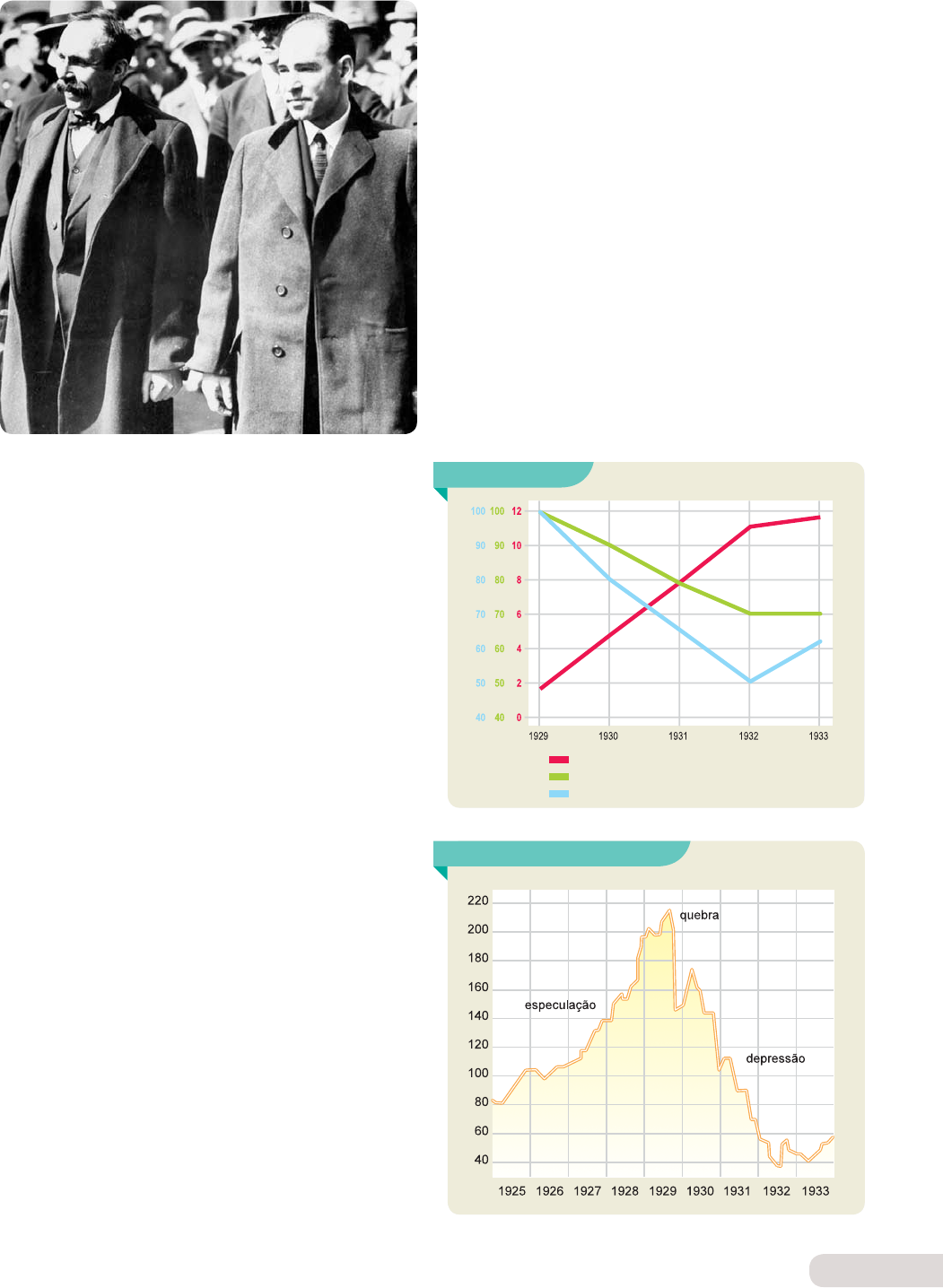 a crise de 1929 e o naziFascismo 81 A intensa atividade econômica nos Estados Uni- dos também impulsionou, especialmente a partir de 1928, a especulação financeira por meio da compra e venda de ações de grandes empresas na Bolsa de Va- lores de Nova York, situada no centro da cidade, em Wall Street. Em meados de 1929, o valor das ações qua- druplicou, e cada vez mais investidores foram atraí- dos pela possibilidade de enriquecer facilmente. O aumento do número de investidores e do volu- me de investimentos, contudo, tinha um limite físico. O mercado interno limitado e o externo arrasado pela Primeira Guerra Mundial, com os países europeus procurando recuperar sua produtividade, completa- vam o quadro econômico. A superprodução sem es- coamento, gerando uma estocagem cada vez maior devido ao subconsumo, levou a especulação financei- ra ao limite. Ou seja, o valor das ações estava muito acima de seu valor real, baseado apenas na confiança de que esses papéis continuariam valorizados e não em lucros das vendas da produção. O presidente Her- bert Hoover, entretanto, mantinha sua posição liberal, recusando-se a uma intervenção estatal para estancar ou reverter a situação. A explosão da crise e o New Deal A crise explodiu em 24 de outubro, a chamada Quinta-Feira Negra, quando muitas pessoas tentaram vender suas ações e não encontraram compradores, o que provocou uma redução drástica dos preços. Os investidores, atemorizados, tentavam livrar-se dos papéis, originando uma avalanche de ofertas de ações, que derrubou ainda mais velozmente os pre- ços, arruinando a todos. Do dia para a noite, prósperos empresários passa- ram a ser donos de papéis sem nenhum valor – e mais de uma dezena deles cometeu suicídio. A desordem econômica atingiu profundamente toda a sociedade estadunidense: 85 mil empresas faliram, 4 mil bancos fecharam e as demissões de trabalhadores alcançaram um total aproximado de 12 milhões. Observe os gráfi- cos a seguir. Foi um período de pobreza e fome. desemprego (abaixo de 2 milhões em 1929) preços (índice 100 em 1929) produção industrial (índice 100 em 1929) p na onda isolacionista, de xenofobia e perseguição a ativis- tas trabalhistas e a políticos, autoridades norte-americanas prenderam, em 1921, nicola sacco (à direita da foto) e Bar- tolomeo Vanzetti (à esquerda), dois imigrantes anarquistas italianos. ambos foram injustamente acusados de roubo e assassinato, sendo pouco depois condenados à morte pela corte suprema de massachusetts. acabaram executados em 1927, apesar de várias manifestações populares na- cionais e internacionais em favor dos condenados. cinco décadas depois, sacco e Vanzetti foram reconhecidos como inocentes e perdoados postumamente. B e tt m a n n /C o rb is /L a ti n s to ck G rá fi c o s : C a s s ia n o R ö d a /A rq u iv o d a e d it o ra Adaptado de: CAMERA, Augusto; FABIETTI, Renato. Elementi di storia 3. Bolonha: Zanichelli, 1999. p. 1.374. Adaptado de: CAMERA, Augusto; FABIETTI, Renato. Elementi di storia 3. Bolonha: Zanichelli, 1999. p. 1.374. Índices da crise Evolução da Bolsa de Nova York HGB_v3_PNLD2015_079a092_U1_C5.indd 81 4/15/13 10:01 AM 82 Para entender nosso temPo: o século XX A crise de 1929 abalou todo o mundo, com exceção da União Soviética, fechada em si mesma e orientada segundo os planos quinquenais, sob o governo de Josef Stálin. A difusão da crise contou com dois elementos básicos: a redução das im- portações norte-americanas, afetando duramen- te os países que dependiam de seu mercado (o café brasileiro é um exemplo), e o repatriamento de capitais estadunidenses investidos em outros países. p distrito financeiro de nova York, onde se situa a Bolsa de Valores, durante a agitada Quinta-Feira negra. outubro de 1929. F o to s : B e tt m a n n /C o rb is /L a ti n s to ck p a charge de 1938 mostra o presidente roosevelt no centro de uma brincadeira de roda com crianças que representam algumas das medidas do New Deal. em português, seriam: administração de obras em Progresso, administração de obras Públicas e lei de ajuste agrícola. Por causa da crise econômica, os republicanos foram derrotados nas eleições nacionais pelo Partido Democrata, em 1932. Franklin Delano Roosevelt foi então eleito presidente dos Estados Unidos, e uma de suas primeiras providências foi limitar o liberalismo econômico, intervindo na economia por meio do New Deal, plano elaborado por um grupo de renomados economistas que se baseava nas teorias do economis- ta inglês John Maynard Keynes (1884-1946). Com o New Deal, o liberalismo de Adam Smith cedeu lugar ao keynesianismo, que defendia a inter- venção do Estado para controlar o desenvolvimento da economia, de modo que combatesse crises e ga- rantisse emprego e direitos sociais. Roosevelt deter- minou grandes emissões monetárias, inflacionando deliberadamente o sistema financeiro; fez investimen- tos estatais de monta, como hidrelétricas; estimulou uma política de empregos, entre outras medidas, o que ativou o consumo e possibilitou a progressiva re- cuperação da economia. Dez anos depois, os Estados Unidos se aproximaram do patamar econômico em que se encontravam antes da crise de 1929. R e p ro d u ç ã o /C o le ç ã o p a rt ic u la r HGB_v3_PNLD2015_079a092_U1_C5.indd 82 4/15/13 10:01 AM a crise de 1929 e o naziFascismo 83 A política keynesiana da busca do pleno empre- go para estimular as economias em recessão, adotada primeiramente nos Estados Unidos e depois em di- versos outros países industriais, foi seguida pela ins- talação de modernos sistemas previdenciários, como a Lei de Seguridade dos Estados Unidos, aprovada em 1935. Serviu também de base para as políticas de bem-estar social desenvolvidas pelos países capita- listas, o chamado Welfare State, expressão que entrou em uso a partir dos anos 1940. A política keynesiana teve predomínio inter- nacional até o final dos anos 1
