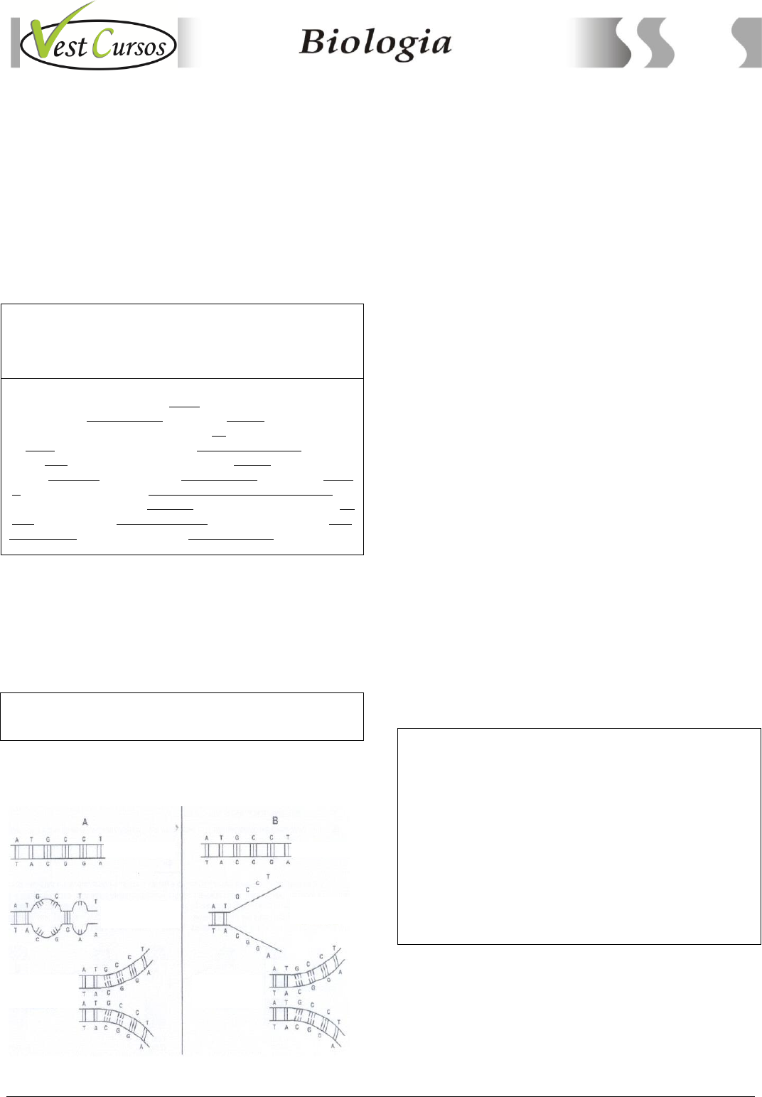 121 Simétrico Pré-Universitário – Curso de Biologia – Prof. Landim – www.simetrico.com.br 121 Segundo as descobertas de Chargaff, se o conteúdo de citosinas e guaninas de uma molécula estudada fosse de 48%, o conteúdo de timinas, nessa molécula seria de: A) 52%. B) 26%. C) 24%. D) 48%. E) 54%. 7. (FMJ) No livro sobre genoma humano recentemente lançado no mercado, há uma explicação de como os genes estão distribuídos no genoma. A autora compara os genes a uma receita de bolo (no caso o bolo seriam as proteínas), mas mostra a forma com que esta receita se encontra dentro do genoma. O quadro I representa a receita de bolo (gene) e o quadro II a distribuição destes genes no genoma. GENE – Quadro I COLOQUE DOIS TABLETES DE MANTEIGA EM UMA VASILHA ADICIONE TRÊS XÍCARAS DE AÇÚCAR BATA A MANTEIGA JUNTO COM O AÇÚCAR ATÉ FORMAREM UMA MASSA SEPARE A GEMA DA CLARA DE DOIS OVOSADICIONE AS DUAS GEMAS À MASSA GENE DENTRO DO GENOMA – Quadro II BLIENEAICALLYENGINEEREDSOVOSIODEDCROPTEBEGINAENAER AHEFOODCHAINARALCADAMENTEEDBTGGAERAAEIFOODTINIONA AWOEARTOFCORNORAOCALLETEALPLPESHAWHOEERÇOULDMAK EADICIONBHIOGHNRUTIHKSHIEHKETRÊSXÍCARASDEAÇEIALTHER MEAIÚCARNHIURHOJSNDIHIHSIOASJDLIHDADICIOIUOHHJHSDIHIS HSSDGNEASDUASTTTDGGOPOOEMASAMASSAUIJOHIDGDGCOLO QUUIJHINIIJOJOGGDHGDEDOISTABLETESDEMANTEIGAEMUMMUI OHHUGDJDHIHKSJLDJHHDAVASILHARUOHDJKHDKHDKHDHJGDBA TAAMAYRUGSGKUSNTEIGAJUNTOCOODFHFUISGFSUGFMOAÇÚC ARATÉFORMFHJGFUUGUGUGUGAREMUMAMASSAHGFDGYGFSGF USD Pereira, Lygia da Veiga. Sequenciaram o genoma humano... e agora? São Paulo, editora moderna, p40, 2001. Quando a autora coloca a receita do bolo “espalhada” pelo meio das outras letras, ela está tentando mostrar o conceito de: A) código genético degenerado. B) introns e exons. C) regulação genética. D) tradução e transcrição. E) variabilidade genética. 8. (FMJ) Sequenciamento do genoma humano representa apenas o primeiro momento de um longo processo. Jornal do Brasil, 2 de julho de 2000 Apesar da notícia do rascunho do genoma humano ter causado grande impacto na população, muitos passos ainda devem ser percorridos a fim de que possamos dominar o mecanismo de funcionamento de DNA. MOLÉCULA DE DNA MOLÉCULA DE DNA ABERTURA DAS PONTES DE HIDROGÊNIO ABERTURA DAS PONTES DE HIDROGÊNIO 2 MOLÉCULAS DE DNA CONTENDO UMA CADEIA ANTIGA 2 MOLÉCULAS DE DNA CONTENDO UMA CADEIA ANTIGA Já se sabe, por exemplo, que no genoma humano existem 3 x 109 pares de nucleotídeos. Para replicar esse genoma, antes de uma divisão celular, existe uma enzima, a DNA polimerase, cuia velocidade de reação é equivalente a cerca de 800 nucleotídeos/s. Assim, para replicar todo o genoma humano, a DNA polimerase consumiria quase dois meses. No entanto, a replicação do DNA de uma célula humana, dura cerca de 12 horas. Observando os esquemas A e B acima que representam duas possíveis formas de replicação da molécula de DNA, o mais compatível com a manutenção e integridade de nossos tecidos seria: A) O esquema A deve representar o que ocorre em nossas células, já que vários sítios de início da replicação favorecem a abertura mais rápida das moléculas de DNA do nosso genoma. B) o esquema B deve representar o que ocorre em nossas células, já que tendo um só sítio de início da replicação, a DNA polimerase pode trabalhar mais rapidamente. C) Ambos os esquemas devem ocorrer em nossas células. D) O esquema A deve representar o que ocorre apenas nas células somáticas porque apenas em sua formação há replicação do DNA. E) O esquema A não é compatível com o que ocorre no nosso genoma porque expõe o DNA ao efeito de agentes mutagênicos. 9. (UNICHRISTUS) A composição de certo ácido nucleico apresenta 30% de adenina, 20% de guanina, 10% de timina e 40 % de citosina. Em relação a esse polímero, podemos afirmar, corretamente, que A) não é uma molécula de DNA, uma vez que não apresenta o princípio de paridade. B) sendo uma molécula de fita simples, provavelmente é um RNAm. C) pode ser DNA de fita simples pertencente a um vírus. D) esse polímero não existe. E) trata-se de DNA pertencente a um procariota. 10. (UNICHRISTUS) De uma análise comparativa, envolvendo a replicação do DNA e a transcrição gênica, surgiram as seguintes conclusões: I. de início, os dois processos implicam a disponibilidade dos mesmos ácidos nucleicos no interior do núcleo celular. II. a replicação ocorre, simultaneamente, em vários trechos na molécula-mãe do DNA, o mesmo acontecendo na transcrição, mas com a participação de apenas uma das cadeias em cada trecho do DNA. III. o princípio do antiparalelismo na montagem das cadeias nucleotídicas é observado nos dois processos. IV. tanto no início da replicação como no da transcrição, há a necessária participação de uma RNA polimerase. V. a finalização de ambos os processos ocorre quando as respectivas polimerases encontram certa sequência de bases, chamada sequência de término. É correto o que se conclui em A) I, II e III, apenas. B) II e III, apenas. C) II, III e IV, apenas. D) II, IV e V, apenas. E) I, II, III, IV e V. 11. (INTA) 122 Simétrico Pré-Universitário – Curso de Biologia – Prof. Landim – www.simetrico.com.br 122 Pesquisadores de Massachusetts General Hospital e Harvard Stem Cell Institute, nos EUA, descobriram que a molécula de micro RNA controla o número de células tronco que são origem ao sangue e células do sistema imunológico no organismo. A descoberta pode melhorar os tratamentos de doenças como o câncer. Disponível em: http://blogs.estadao.com.br/ciencia-diaria. Acesso em: 13 out. 2012. Qual característica da molécula de microRNA explica essa afirmação? A) A medula óssea, também conhecida como tecido mieloide, está presente nas cavidades ósseas dos animais superiores. Pode ser vermelha ou amarela, dependendo da preponderância de tecido vascular ou gorduroso. Esta diferenciação da constituição do DNA 