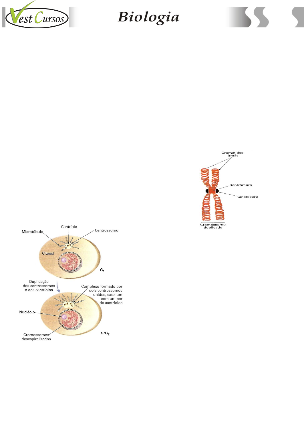 316 Simétrico Pré-Universitário – Curso de Biologia – Prof. Landim – www.simetrico.com.br 316 A) Dê um título a esse gráfico. B) Formule uma hipótese que explique a maior incidência de câncer na terceira idade. 4. Embora seja uma doença genética, o câncer nem sempre é hereditário. Explique essa afirmativa. Aula 23 – Mitose A mitose é uma forma de divisão celular que gera células geneticamente idênticas às células iniciais (clones das células iniciais). Ou seja, nela não há variabilidade genética. A partir de uma célula somática diplóide (célula mãe), duas outras células somáticas diplóides (células filhas) são formadas. A mitose tem o papel de reprodução em organismos unicelulares (fala-se em bipartição ou cissiparidade ou divisão binária) e o papel de crescimento e regeneração em organismos pluricelulares. Fases da mitose Antes da mitose, uma caracterização de célula em intérfase: Observe a carioteca intacta, O DNA desespiralizado e a presença de um único par de centríolos. O processo mitótico apresenta-se dividido em quatro etapas: prófase, metáfase, anáfase e telófase. 1. Prófase Durante a prófase, a mais longa das fases da mitose, dentre outros eventos, tem-se: - Entrada de água na célula: Isto visa tornar o citoplasma mais fluido promovendo a passagem de gel para sol (solação no tixotropismo). Estando o citoplasma mais fluido, os cromossomos o atravessam com maior facilidade, para que se desloquem aos pólos da célula em divisão na anáfase. - Espiralização ou condensação dos cromossomos: Os cromossomos na intérfase estão na forma desespiralizada (ou descondensada). Estes cromossomos são extremamente longos para um espaço tão pequeno quanto o núcleo. Para haver a separação dos cromossomos na divisão celular, a espiralização ocorre para reduzir-lhes o comprimento e aumentar o diâmetro, facilitando fenômenos como o posicionamento na placa equatorial, a ligação com o fuso e a separação dos mesmos. Como conseqüência da espiralização, os cromossomos durante a divisão celular estão inativos (por estarem espiralizados, não há a possibilidade de pareamento de novas bases nitrogenadas, e conseqüentemente não há a possibilidade de síntese de RNA). Começa a se evidenciar as duas cromátides do cromossomo duplo (cromátides-irmãs). DNA duplicado e espiralizado - Formação dos cinetócoros: proteínas especialiazadas presentes no núcleo organizam-se no centrômero de cada cromátide-irmã, formando um complexo protéico denominado cinetócoro. Desta maneira, cada cromossomo duplicado passa a ter dois cinetócoros, um para cada cromátide-irmã. - Desorganização da carioteca: Isto visa permitir que os cromossomos se liguem às fibras do fuso e se dirijam aos pólos das células. - Desaparecimento dos nucléolos: Os nucléolos são estruturas formadas por RNAr e proteínas cuja função é produzir ribossomos (também formados por RNAr e proteínas), que serão enviados ao citoplasma para a realização de síntese protéica. Ao eliminar ribossomos, o nucléolo vai progressivamente perdendo parte de seus elementos constituintes e desaparecendo. Entretanto, a síntese de mais RNAr pelo DNA na intérfase ( a região do DNA responsável pela formação de RNAr é a região organizadora do nucléolo, também conhecida como zona SAT) repõe o RNAr que saiu com os ribossomos, de forma que o volume do nucléolo não se altera. Entretanto, durante a divisão celular, o DNA está inativo, e a síntese de RNAr pára. Assim, sai RNAr do nucléolo para haver formação dos ribossomos e este não é reposto pelo DNA. O nucléolo desaparece. - Migração dos centríolos para os polos da célula: os diplossomas se duplicam e cada um deles migra para um pólo da célula, com auxílio de microtúbulos especiais denominados de fibras polares, que se estendem de um pólo a outro da célula. Lá nos pólos, os centríolos originam as fibras do áster, que vão manter o fuso acromático ancorado nessas regiões. 317 Simétrico Pré-Universitário – Curso de Biologia – Prof. Landim – www.simetrico.com.br 317 - Formação das fibras do fuso (aparelho mitótico ou fuso acromático): As fibras do fuso (polares e cinetocóricas) formam-se pela polimerização de microtúbulos citoplasmáticos, e não pelo centríolo como há pouco tempo se pensava. Algumas fibras polares se ligam a estruturas denominadas de cinetócoros, que são estruturas localizadas no centrômero do cromossomo. Cada centrômero possui dois cinetócoros. As fibras polares que se ligam aos cinetócoros passam a ser denominadas de fibras cinetocóricas. O fuso não é corado pelos corantes normalmente usados em citologia, daí o nome acromático (“sem cor”). Apesar de desenhado em esquemas, ele não é visível em fotografias de células em divisão. As fibras do fuso não são formadas pelo centríolo, e sim pelos microtúbulos do citoesqueleto. Tanto é que as células vegetais não possuem centríolos mas possuem fibras do fuso. Já as fibras do áster têm origem nos microtúbulos do centríolo, de modo que os vegetais não têm áster. Prometáfase A prometáfase se inicia após a desorganização da carioteca, quando nucleoplasma e citoplasma se misturam. Nela, completa-se a formação do aparelho mitótico. Os microtúbulos que estão organizando as fibras do fuso começam a entrar na área que correspondia ao núcleo, onde estão os cromossomos. Estas fibras do fuso podem então se ligar ao cinetócoro do centrômero de cada umas das cromátides irmãs, originando fibras cinetocóricas ou cromossômicas. As duas fibras cinetocóricas se localizam em lados opostos do centrômero, voltadas para os polos da célula. Cada cromátide está presa, devido ao cinetócoro, aos microtúbulos do fuso acromático. Estes microtúbulos do fuso cromático começam a deslocar os cromossomos para a região equatorial da célula, num movimento deno