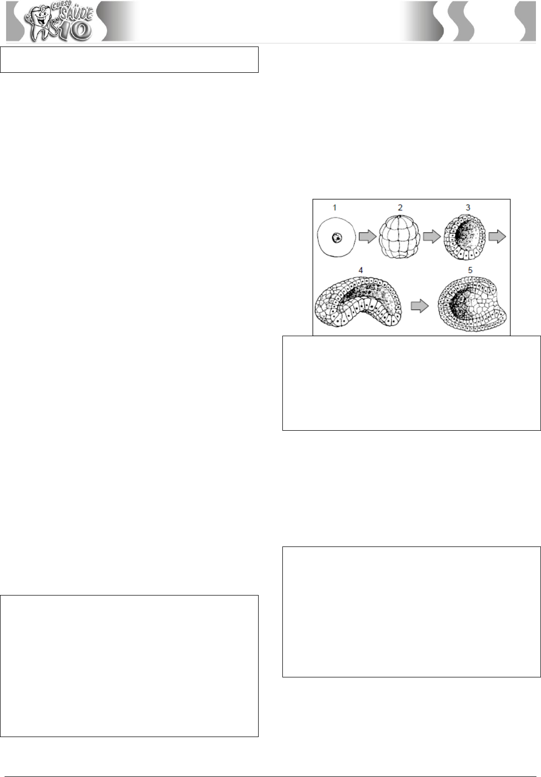Simétrico Pré-Universitário – Curso de Biologia – Prof. Landim – www.simetrico.com.br 51 Biologia III. apresenta ovo com quantidade razoável de vitelo (mediolécito), com segmentação total e tem estágio larval Os animais I, II, e III podem ser respectivamente: A) gavião, minhoca e camundongo. B) estrela do mar, sardinha e pardal. C) salmão, chimpanzé e rã. D) caramujo, salamandra e barata. 7. (UECE) Os óvulos dos mamíferos, aves e répteis são, respectivamente, do tipo: A) heterolécito, metalécito e heterolécito. B) telolécito, telolécito e heterolécito. C) metalécito, heterolécito e metalécito. D) metalécito, telolécito e telolécito. 8. (FCM-JP) Com relação ao desenvolvimento embrionário, assinale a alternativa correta: A) O desenvolvimento embrionário tem início com a segunda divisão mitótica do zigoto e pode ser dividido em três etapas: segmentação, gastrulação e organogênese. B) A fase de segmentação, fase de clivagem, é o período que vai desde a primeira divisão do zigoto até a formação de um aglomerado de células com uma cavidade interna, denominada blástula. C) A gastrulação é a fase em que, a partir dos três folhetos germinativos diferenciam-se os diversos tecidos e órgãos que existirão no organismo adulto. D) As células resultantes da divisão do zigoto são chamadas gametas, que se dividem sucessivamente, em um estágio do desenvolvimento que resulta na mórula. E) Os zigotos de praticamente todas as espécies animais possuem substâncias nutritivas, na forma de grãos de proteínas e lipídios que constituem os blastômeros. 9. (FCM-CG) No citoplasma das células-ovo de praticamente todas as espécies animais encontram-se substâncias nutritivas constituídas basicamente de proteínas e lipídios, na forma de grânulos de “vitelo”. Tal conteúdo tem a finalidade de nutrir as células embrionárias no início do desenvolvimento. O tipo de segmentação que ocorrerá na célula-ovo está diretamente relacionado à sua quantidade de vitelo. Tomando por base a quantidade e a distribuição de vitelo, podemos classificar os ovos em quatro tipos: (1) oligolécitos, (2) mesolécitos, (3) megalécitos e (4) centrolécitos. Nesse contexto, analise as proposições a seguir e estabeleça a associação correta com os tipos de ovos utilizando os respectivos números de 1 a 4 correspondentes acima enumerados. (_) Quantidade relativamente pequena de vitelo, de distribuição mais ou menos homogênea no citoplasma; presente em cordados, equinodermos, moluscos, anelídeos, nematódeos e platelmintos. (_) Quantidade relativamente grande de vitelo, distribuída de forma heterogênea no citoplasma; maior concentração de vitelo em um dos polos – polo vegetativo; o polo oposto, com menos vitelo, denomina-se polo animal; típicos dos anfíbios. (_) Quantidade grande de vitelo, ocupando praticamente quase toda a célula; presente em aves, répteis, peixes e moluscos cefalópodes. (_) Quantidade relativamente grande de vitelo concentrada na região central da célula; presente na maioria dos artrópodes. A sequência correta de associação é A) 4, 3, 1, 2. B) 4, 3, 2, 1. C) 1, 2, 4, 3. D) 1, 3, 2, 4. E) 1, 2, 3, 4. 10. (FCM-CG) Nos organismos pluricelulares e em particular nos animais vertebrados após a fecundação do óvulo pelo espermatozoide, o ovo sofre uma série de divisões mitóticas, o que leva à formação de um grupo maciço de células, iniciando-se as diversas etapas do desenvolvimento embrionário. Os primeiros folhetos embrionários se diferenciam a partir A) da mórula. B) dos blastômeros. C) da blástula. D) da blastocele. E) da nêurula. 11. (UESPI) Quando se estuda a embriologia humana, observa-se que: o zigoto (1) sofre várias mitoses, formando células iguais, que se organizam da forma mostrada em (2) e, posteriormente, nas formas 3, 4 e 5. Com relação a esse tema, é correto afirmar que: 1. O blastômero (2) mostra pouca diferenciação estrutural e fisiológica. 2. A gástrula (3) é caracterizada pelo surgimento de uma cavidade oca. 3. A gástrula sofre invaginação e formam-se a endo e a ectoderme, caracterizando a fase de blástrula (4). 4. A diferenciação celular é observada a partir da fase embrionária indicada em (5). Está(ão) correta(s): A) 1, 2, 3 e 4. B) 3 apenas. C) 2 e 4 apenas. D) 4 apenas. E) 1, 3 e 4 apenas. 12. (UERN) Durante a fase do desenvolvimento embrionário, a célula-ovo passa por várias divisões mitóticas, originando muitas células, que permanecem unidas. Nas primeiras divisões ocorre um aumento significativo do numero de células, porem, o tamanho total da célula-ovo praticamente não altera. Sobre o processo de desenvolvimento embrionário, analise. I. O processo em que o volume da célula-ovo não aumenta, caracteriza a segmentação. II. A organogênese é a fase seguinte a clivagem no desenvolvimento embrionário, onde ocorre a formação dos folhetos embrionários que darão origem a diversos tecidos do organismo. III. A meroblástica é um tipo de segmentação, e ocorre em todo o ovo, exceto na região que possui vitelo, chamada cicatrícula. IV. Na segmentação discoidal, as divisões ocorrem na região da cicatrícula, formando um disco de células, característica que denominou esse tipo de segmentação. Estão corretas apenas as afirmativas A) I e II. B) I e IV. C) III e IV. D) I, II e IV. 13. (UEMA) A formação dos organismos inicia-se pelo processo de meiose seguida de sucessivas divisões mitóticas. No humano, em poucos dias, são identificadas as células-tronco embrionárias responsáveis pela diferenciação celular e consequente formação dos mais de 200 tipos celulares especializados de um adulto. Simétrico Pré-Universitário – Curso de Biologia – Prof. Landim – www.simetrico.com.br 52 Biologia Avaliando todo o processo embriológico, em qual fase da embriologia humana são encontradas essas importantes células totipotentes? A) 