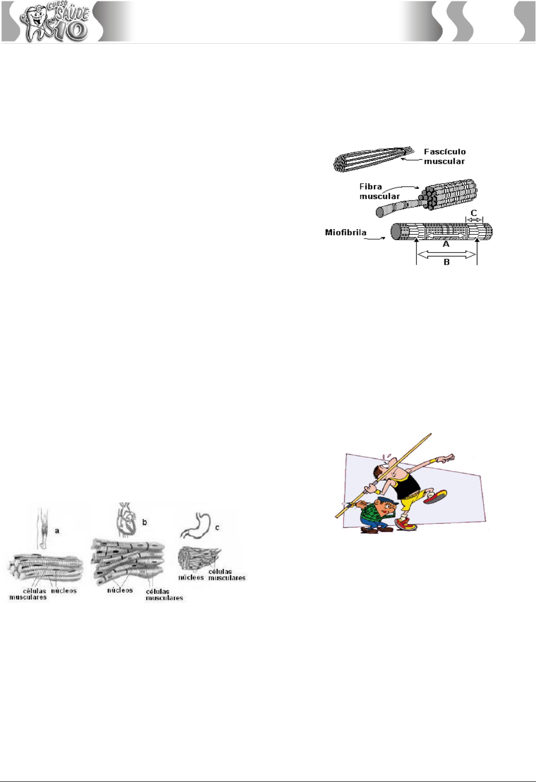 Simétrico Pré-Universitário – Curso de Biologia – Prof. Landim – www.simetrico.com.br 167 Biologia 4. (FMJ) O curare era, a princípio, um veneno utilizado pelos índios americanos, durante a caça. Grande parte dos princípios ativos atuantes vem de plantas do gênero Strychnos. Portanto, sua utilização como veneno paralisante vem de longa data, ao passo que a dosagem utilizada para relaxamento muscular (como por exemplo, em cirurgias), é mais recente e resulta do conhecimento da sua atividade farmacológica, que é impedir a liberação de acetilcolina na placa motora. A utilização durante cirurgia é vantajosa porque: A) evita paradas respiratórias. B) evita paradas cardíacas. C) evita a contração muscular no órgão manipulado. D) estimula a contração muscular e o relaxamento. E) paralisa totalmente o corpo do paciente. 5. (FMJ) A rigidez cadavérica é um fenômeno determinado pela permanência da contração muscular após a morte de um animal. A falta de ATP, fonte de energia nas células, impede tanto o deslizamento das proteínas musculares quanto o bombeamento de cálcio, impossibilitando o relaxamento muscular. Vinte e cinco horas após a morte, enzimas destroem as proteínas celulares provocando o relaxamento dos músculos. Esta é importante na verificação, pelos legistas, do momento do óbito. As enzimas citadas, responsáveis pela destruição das proteínas musculares são liberadas por: A) ribossomos das células nervosas. B) mitocôndrias das células musculares. C) lisossomos das células musculares. D) proteínas musculares. E) cromossomos dos núcleos dos neurônios. 6. (UNICHRISTUS) Os músculos são os órgãos ativos do movimento. São eles dotados da capacidade de contrair-se e de relaxar-se e, em consequência, transmitem os seus movimentos aos ossos sobre os quais se inserem. O movimento de todo o corpo humano ou de algumas das suas partes – cabeça, pescoço, tronco, extremidades – deve-se aos músculos. De músculos estão, ainda, dotados os órgãos que podem produzir certos movimentos (coração, estômago, intestino, bexiga etc.). Disponível em: http://pt.wikipedia.org/wiki/Tecido_muscular. Acesso em: 3 de março de 2013. Baseando-se no texto e em conhecimentos correlatos, depreende- se que A) o tecido muscular representado em b assemelha-se anatomicamente ao tecido a, porém é de controle voluntário como o tecido c. B) sarcômeros, unidades contráteis do tecido muscular, estão presentes apenas no tecido a. C) a inervação do tecido c é responsabilidade do sistema nervoso somático. D) todos os 3 tipos de tecidos musculares mostrados ocorrem no corpo associados a tecidos conjuntivos, cuja origem embriológica é mesodérmica. E) o aumento da massa muscular que ocorre em função da prática de exercícios frequentes é resultado do aumento do número de células do tecido a. 7. (UNICHRISTUS) Considere as seguintes representações de um músculo esquelético e as faixas indicadas pelas letras. Baseando- se nas representações e utilizando seus conhecimentos sobre o assunto, pode-se inferir que Disponível em: http://www.fm.usp.br/fofito/fisio/pessoal/isabel/biomecanicaonline/elementar/materiais.php. Acesso em: 2 de setembro de 2013. A) a faixa A, denominada de Banda A (niisotrópica), corresponde à justaposição de moléculas de actina e miosina. B) a faixa B corresponde ao sarcômero que vai de uma linha Z a outra. C) a faixa C, denominada Banda I (isotrópica), corresponde a uma região onde são encontradas apenas moléculas de miosina. D) a faixa C (Banda I) aumenta de tamanho na contração muscular. E) a zona H se situa no centro da Banda A (faixa A) e aumenta na contração muscular. 8. (UNICHRISTUS) Observe a imagem ao lado. Disponível em: http://www.canalkids.com.br/esporte/modalidades/campo2.htm O movimento observado na imagem exige do atleta contração muscular. Isso ocorre devido ao A) deslizamento dos filamentos de actina por entre os de miosina. B) encurtamento das fibras de mioglobina, com gasto de ATP. C) movimento dos sarcômeros por dentro dos filamentos de miosina. D) deslocamento da fosfocreatina para fora das miofibrilas. E) estímulo da linha Z com produção de ATP e acetilcolina. 9. (UNICHRISTUS) Com relação ao tecido muscular estriado esquelético, é correto afirmar que A) é o único tipo de tecido presente na constituição de um músculo esquelético. B) cada miócito esquelético, pelo seu modo de formação a partir de mioblastos, é estruturalmente um sincício. C) no miócito esquelético, a propagação do potencial de ação pelos túbulos T, causa liberação de íons Ca do REG para o citosol. Simétrico Pré-Universitário – Curso de Biologia – Prof. Landim – www.simetrico.com.br 168 Biologia D) na contração do sarcômero, a ativação do “complexo” actino- miosina-ATPase resulta da ligação do íon Ca com a actina G do microfilamento de actina F. E) miócitos ricos em mioglobina e mitocôndrias são mais numerosos em músculos esqueléticos de contração rápida. 10. (UECE) Analise as afirmações a seguir: I. Os discos intercalares são as junções do tipo gap, apresentadas pelas células musculares estriadas cardíacas nas ramificações de conexão com as células vizinhas. II. O tecido muscular cardíaco é de natureza lisa porque sua contração é involuntária. III. A musculatura lisa é encontrada em órgãos viscerais como o estômago e o intestino, daí sua denominação de tecido muscular visceral. É correto o que se afirma em A) I e II, apenas. B) I e III, apenas. C) II e III, apenas. D) I, II e III. 11. (UECE) O conceito de sarcômero engloba o de estruturas como sarcolema e retículo sarcoplasmático e está associado a um determinado tipo de tecido. Nessa estrutura temos a abundante presença de A) plastos e íons de magnésio. B) plastos e íons de cálcio. C) mitocôndrias e íons de magnésio. D) mitocôndrias e íons de cálcio. 12. (UECE) Os di