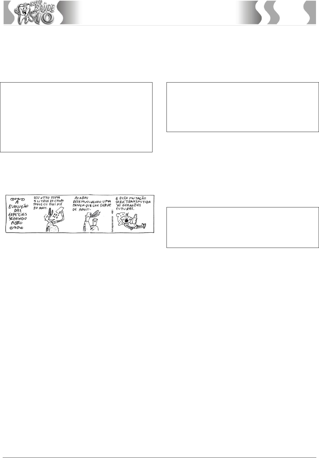 Simétrico Pré-Universitário – Curso de Biologia – Prof. Landim – www.simetrico.com.br 131 Biologia E) variáveis na população, herdáveis, e estejam correlacionadas ao sucesso reprodutivo. 25. (UERJ) Darwin afirmou que “a teoria da seleção natural baseia-se na convicção de que cada nova variedade e, posteriormente, cada nova espécie, é produzida e mantida por ter determinada vantagem em relação àquelas com que entra em competição”. Considere agora as seguintes afirmativas: I. Como nascem mais indivíduos que os que podem viver, deve existir, em cada caso, luta pela existência, quer entre indivíduos da mesma espécie, quer entre os de espécies diferentes. II. A luta pela existência resulta inevitavelmente da rapidez com que todos os seres organizados tendem a multiplicar-se. III. A seleção natural produz modificações em qualquer espécie para benefício exclusivo de outra espécie. IV. A seleção natural tende a tornar cada ser organizado tão adaptado, ou um pouco mais adaptado, que os outros habitantes da mesma região com os quais estão em concorrência. Dentre essas afirmativas, aquela que, se comprovada, poria fim à teoria de Darwin, é a de número: A) I. B) II. C) III. D) IV. 26. (UNIT) MUNDO MONSTRO – ADÃO A tirinha aborda uma situação, contextualizada na evolução das espécies. A transposição do conteúdo da tirinha para um contexto científico permite afirmar: A) A característica física apresentada por pai e filho valida a lei do uso e desuso na transformação das espécies, como proposta por Lamarck. B) A Teoria evolucionista proposta por Darwin considera a transmissão de características adquiridas como mecanismo de evolução das espécies. C) Variações hereditárias, expressas em traços fenotípicos nos indivíduos de uma população, resultam de processos casuais não determinísticos. D) Mudanças morfofisiológicas desenvolvidas ao longo da vida de um indivíduo se perpetuam nas gerações seguintes por seleção natural. E) Mutações somáticas induzidas pelo estilo de vida de um dos genitores são transmitidas à prole. 27. (UFC) A competição por um recurso de disponibilidade limitada é um dos pressupostos do conceito de seleção natural na teoria evolutiva de Darwin. Sobre esta declaração, é correto afirmar que é: A) verdadeira, pois o conceito de seleção natural do organismo melhor adaptado pressupõe que os predadores mais eficazes levem suas presas à extinção. B) falsa, pois apenas a competição interespecífica por um recurso de disponibilidade limitada contribui efetivamente para o conceito de seleção natural. C) verdadeira, pois apenas em decorrência da competição por um recurso de disponibilidade limitada é que há a seleção do organismo melhor adaptado. D) verdadeira, pois tanto a competição intra-específica quanto a interespecífica são comportamentos que apresentam um alto grau de expressividade gênica. E) falsa, pois apenas a competição intra-específica por um recurso de disponibilidade limitada contribui efetivamente para o conceito de seleção natural. 28. (UFC) O ambiente afeta a forma e a organização dos animais, isto é, quando o ambiente se torna muito diferente, produz ao longo do tempo modificações correspondentes na forma e organização dos animais... As cobras adotaram o hábito de se arrastar no solo e se esconder na grama, de tal maneira que seus corpos, como resultado de esforços repetidos de se alongar, adquiriram comprimento considerável... O trecho citado foi transcrito da obra Filosofia Zoológica de um famoso cientista evolucionista. Assinale a alternativa que contém, respectivamente, a idéia transmitida pelo texto e o nome do seu autor. A) Seleção natural – Charles Darwin. B) Herança dos caracteres adquiridos – Jean Lamarck. C) Lei do transformismo – Jean Lamarck. D) Seleção artificial – Charles Darwin. E) Herança das características dominantes – Alfred Wallace. 29. (UFC) Nenhum dos fatos definidos da seleção orgânica, nenhum órgão especial, nenhuma forma característica ou distintiva, nenhuma peculiaridade do instinto ou do hábito, nenhuma relação entre espécies – nada disso pode existir, a menos que seja, ou tenha sido alguma vez, útil aos indivíduos ou às raças que os possuem. Alfred Russel Wallace, 1867. O texto acima é uma defesa intransigente do princípio: A) darwinista da seleção natural. B) lamarckista da herança dos caracteres adquiridos. C) mendeliano da segregação dos caracteres. D) darwinista da seleção sexual. E) lamarckista do uso e do desuso. 30. (UFC) Assinale a opção que se refere à principal contribuição de Charles Darwin à teoria da evolução. A) A seleção natural atua como a principal força criadora das mudanças evolutivas. B) Existe em todos os organismos um impulso interior para a perfeição. C) A vida é gerada contínua e espontaneamente de forma muito simples. D) Todos os organismos têm capacidade de adaptar-se ao ambiente. E) Os caracteres adquiridos transformam-se em hereditários. 31. (UFPI) Assinale a alternativa que menciona, corretamente, o que pode significar, sob o ponto de vista evolutivo, o fato de animais com características primitivas, como as esponjas, terem sido um dos primeiros a se formar e serem abundantes até hoje. A) Sua estratégia evolutiva não foi bem sucedida. B) A seleção natural não atuou sobre as esponjas. C) As esponjas mostraram adaptação às pressões ambientais. D) Não foram expostos a nenhum tipo de pressão ambiental. E) Não apresentaram muita variabilidade genética. Simétrico Pré-Universitário – Curso de Biologia – Prof. Landim – www.simetrico.com.br 132 Biologia 32. (UFF) Devido ao grande número de acidentes provocados pelos cães da raça Pitbull, várias solicitações vêm sendo feitas pela população do Rio de Janeiro e de outras cidades do Brasil, visando à proibição da circulação desses cães pelas ruas.