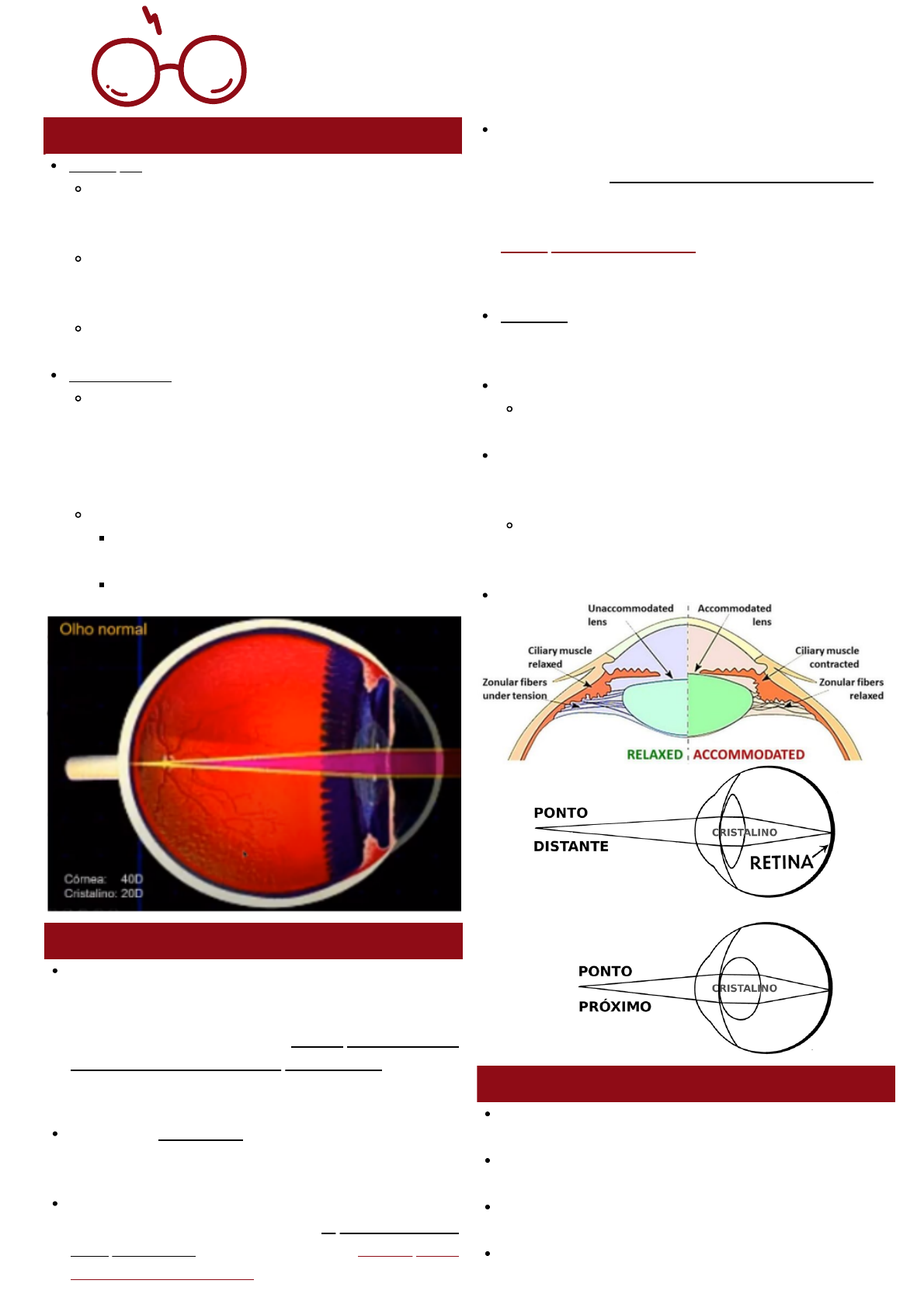 REFRAÇÃO: Capacidade de mudar a direção de um raio luminoso quando esse passa de um meio para outro com índice de refração diferente. É fundamental para direcionar os raios luminosos e, assim, formar a imagem na RETINA (essencial para converter esse estímulo luminoso em estímulo nervoso). ESTRUTURAIS ENVOLVIDAS NESSE PODER REFRATIVO: CÓRNEA E CRISTALINO. OLHO NORMAL: FUNCIONAMENTO: Imagem penetra no olho através de dois feixes paralelos que passam pela córnea e cristalino > sofrem mudança de direção/mecanismos de refração > focalizados na retina onde o estímulo vai ser captado pelos fotorreceptores. PODERES REFRATIVOS CÓRNEA: 40D (dioptrias) – PODER REFRATIVO ESTÁVEL. CRISTALINO: 20D – PODER REFRATIVO DINÂMICO (pode aumentar e diminuir). ERROS DE REFRAÇÃO CARACTERÍSTICAS GERAIS O QUE É? Propriedade do olho de modificar seu poder dióptrico/refrativo, de modo a manter nítida a imagem retiniana de um objeto quando a distância entre este e o observador varia. Normalmente ao se aproximar mais do olho faz-se um aumento do poder refrativo (o mesmo deslocamento que tem o objeto tem a imagem formada por ele, precisando haver uma adaptação com a aproximação). Função do CRISTALINO, adaptando e mudando seu poder refrativo (a córnea não muda suas dioptrias, já o cristalino sim). DIMINUI COM A IDADE ESSA FUNÇÃO: Nos jovens tem grande capacidade de refração, mas a partir dos 40 anos começa a diminuir esse mecanismo pela diminuição da elasticidade do cristalino, assim como as fibras do músculo ciliar também perdem sua força de contração. ACOMODAÇÃO COMO FUNCIONA AO TER UM FOCO MAIS PRÓXIMO? O cristalino modifica seu poder refrativo (como na imagem abaixo que ele aumenta seu Diâmetro Ântero Posterior e aumenta seu poder refrativo por aumentar a convergência dos raios) e isso ocorre por meio da contração do músculo ciliar, visto que o cristalino está ligado ao músculo ciliar pelos ligamentos chamados de zônula. DETALHES: Músculo ciliar se contrai > relaxamento da zônula > aumenta o diâmetro ântero-posterior do cristalino. A inervação do músculo ciliar se dá pelo NC III. Assim, paralisia do NC III prejudica o mecanismo de acomodação! No exame oftalmológico de pacientes muito jovens, que tem a amplitude de acomodação muito grande, é necessário paralisar esse mecanismo de forma farmacológica! Como o NC III inerva tanto o músculo ciliar como o esfíncter da pupila, por isso, quando se faz a "cicloplegia" (paralisia do m. ciliar), a pupila é dilatada (midríase)! Acomodação: CRISTALINO + MÚSCULO CILIAR O QUE É? Inabilidade do olho em focar a imagem na retina ou AMETROPIA (metria incorreta). CAUSA MAIS COMUM DE DEFICIÊNCIA VISUAL TRATÁVEL: Diminui a acuidade visual. IMPORTANTE CAUSA DE MÁ DESEMPENHO ESCOLAR: Subdiagnosticado na infância. TIPOS: MIOPIA, HIPERMETROPIA e ASTIGMATISMO ERROS DE REFRAÇÃO Vista curta, em que a imagem de um objeto distante é focalizada na frente (antes) da retina. ETIOLOGIA: a)Miopia Axial: os raios de luz não estar convergem na retina devido ao globo ocular apresentar eixo horizontal ântero- posterior mais alongado. O comprimento do olho é maior que o comprimento ótico, fazendo com que a luz incidente não alcance a retina. A imagem forma antes dela. Dificultando a visão de longe. É a de graus mais elevados. b) Miopia por Curvatura: A córnea e\ ou o cristalino possuem uma curvatura mais acentuada favorecendo uma convergência desses raios antes da retina. É a miopia mais frequente. c) Miopia por índice refrativo do cristalino: O cristalino se opacifica com o tempo, aumentando seu índice de refração. Quanto mais difícil é para a luz passar por esse cristalino, mais desvio ela possui, favorecendo também uma convergência precoce, anterior à retina. Acontece mais em pessoas idosas; “No cristalino, o poder refrativo aumenta em situações como a catarata, visto que um tipo delas (catarata nuclear) gera um aumento do poder refrativo OU paciente diabético com glicemia descompensada que pode levar a uma hidratação do cristalino (entra líquido e gera edema), aumentando poder refrativo. POR ISSO QUE NÃO DEVE PRESCREVER ÓCULOS EM PACIENTES COM GLICEMIA MUITO ALTA - PODE TER ASSOCIAÇÃO DESSES DOIS FATORES ACIMA” d) Miopia Secundária: Causada por doenças como o glaucoma (aumento da pressão intraocular) ou também pela própria catarata. Ocorre um deslocamento (luxação) ou degeneração do cristalino. e) Miopia Congênita: geralmente é muito elevada. f) Miopia Degenerativa: Ocorre devido a degeneração de estruturas dos olhos, é chamada de maligna ou também de patológica. Caracterizada por um alongamento anteroposterior progressivo do invólucro escleral em conjunto com outras alterações. Cerca de 3% da população pode ser diagnosticada com esse tipo de miopia. Essa miopia tem maior propensão a lesões de retina, como descolamento de retina, que podem levar cegueira irreversível. SINTOMAS: DIFICULDADE PARA VER DE LONGE: Que vai ser proporcional de acordo com a quantidade da miopia (de acordo com a distância que a imagem está da retina). VANTAGEM: Boa visão de perto, pois quando o objeto se aproxima do olho, a imagem vai mais para trás e aproxima-se da retina, visualizando adequadamente ou melhor ainda (SEM ESTAR COM ÓCULOS). ERROS DE REFRAÇÃO MIOPIA CLASSIFICAÇÃO: SIMPLES: Só alteração refracional, só necessitando correção do índice de refração. PATOLÓGICO: ADVÉM DE DEFEITO GENÉTICO TEM FRAQUEZA DA ESCLERA TEM ALTERAÇÕES DE FUNDO DE OLHO: Áreas de atrofia na retina que gera baixa de acuidade visual mesmo com a correção do índice de refração. IMAGEM DE FUNDO DE OLHO: Áreas de atrofia em torno do nervo óptico, visualizando a esclera nitidamente atrás da retina (algo que não seria possível de visualizar caso fosse uma miopia simples) – são alterações irreversíveis, por que altera células nervosas. EVOLUÇÃO: VARIÁVEL, COM 