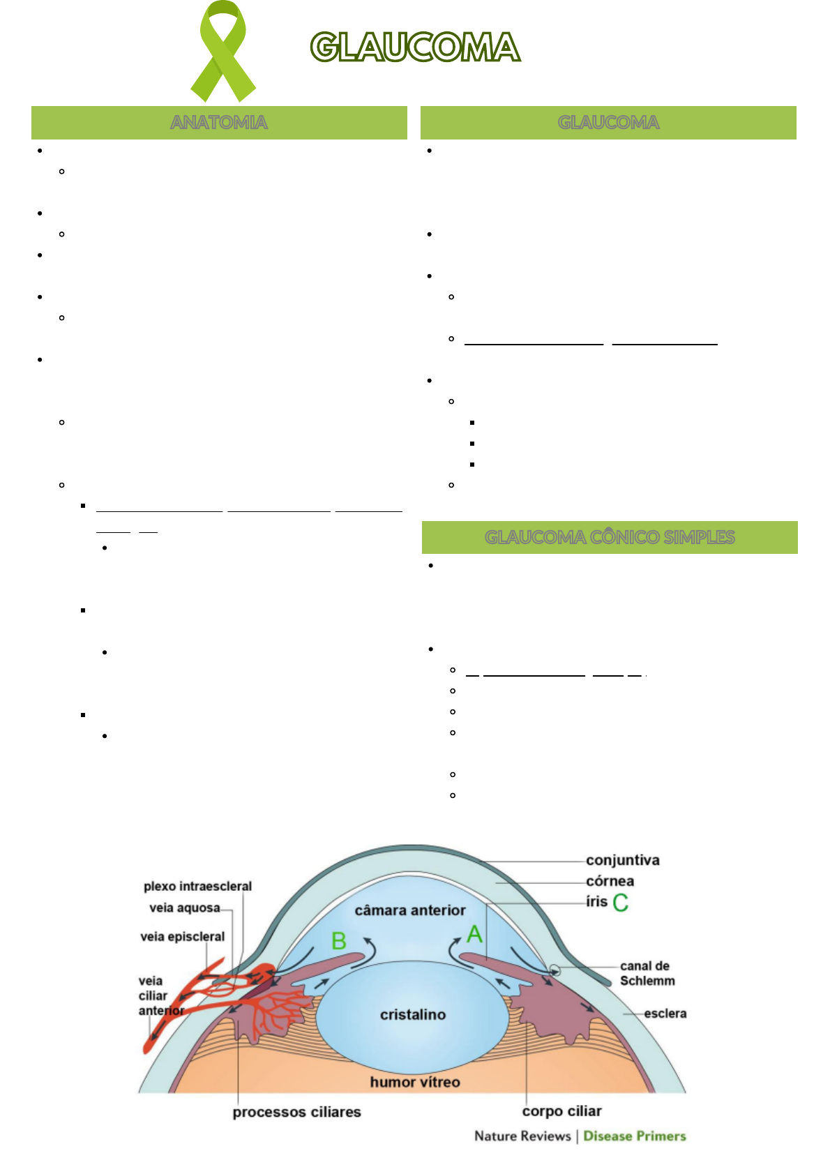 GLAUCOMAGLAUCOMA CÂMARA ANTERIOR Espaço entre a córnea (estrutura mais anterior do olho) e a íris CÂMARA POSTERIOR Espaço entre a íris e o cristalino As câmaras anterior e posterior são preenchidas pelo HUMOR AQUOSO O corpo ciliar produz o humor aquoso, na pars plicata. É circular como um anel assimétrico, estendendo-se da íris até a extremidade anterior da coróide HUMOR AQUOSO: Líquido claro que preenche as câmaras anterior e posterior do olho, com composição semelhante à do plasma. CAMINHO: Corpo ciliar > câmara posterior > pela pupila vai para a câmara anterior > reabsorvido pelo ângulo da câmara anterior (entre a córnea e íris) DRENAGEM POR DUAS VIAS: VIA TRABECULAR (CONVENCIONAL): 90% da drenagem Ângulo da câmara anterior > malha trabecular > canal de schlemm > veias episclerais > reabsorvido na circulação sistêmica VIA ÚVEO-ESCLERAL (NÃO CONVENCIONAL): 10% da drenagem Fibras musculares do músculo ciliar > espaço supracoroideano > cai na circulação venosa > coroide e esclera > circulação sistêmica DINÂMICA DO HUMOR AQUOSO: AUMENTO DA PRODUÇÃO OU DIMINUIÇÃO DA DRENAGEM: Gera um aumento da pressão intraocular (principal fator de risco para o desenvolvimento do glaucoma) ANATOMIAANATOMIA CONCEITO: Neuropatia óptica (doença no nervo óptico NC II) caracterizada por perda progressiva de fibras nervosas, levando a um déficit do campo visual por lesão do nervo óptico Principal fator de risco é o aumento da pressão intraocular EPIDEMIOLOGIA: Segunda causa de cegueira no mundo (atrás da catarata) Primeira causa de cegueira irreversível: Visto que atinge fibras nervosas CLASSIFICAÇÃO: PRIMÁRIOS: Crônico simples (mais frequente) Agudo Congênito SECUNDÁRIOS: Vários tipos, dependendo do motivo que causou GLAUCOMAGLAUCOMA DE ÂNGULO ABERTO: Sendo o ângulo da câmara anterior aberto (não está fechado), sendo outro o motivo da desproporção entre a formação e o escoamento do humor aquoso. FATORES DE RISCO: Hipertensão ocular (principal) Idade: Mais frequente após os 60 anos Raça: Mais comum em negros Histórico familiar: Principalmente parentes de primeiro grau Miopia Doença retiniana GLAUCOMA CÔNICO SIMPLESGLAUCOMA CÔNICO SIMPLES GLACUCOMAGLACUCOMA DIAGNÓSTICO: História clínica com os fatores de risco Sintomas: Nenhum nas fases iniciais - Por que as primeiras alterações atingem a periferia, afetando o campo visual periférico, difícil de ser notado (a visão central é a última a ser acometida) EXAME OFTALMOLÓGICO COMPLETO: Biomicroscopia de fundo de olho ou fundoscopia: Para estudo do nervo óptico Observa a escavação (parte pálida do fundo de olho, ausência de fibras nervosas) está aumentada, representando maior área sem fibra nervosa OUTRAS ALTERAÇÕES: Alterações vasculares OCT (TOMOGRAFIA DE COERENCIA OPTICA): Observa o nervo óptico, avaliando a espessura da camada da fibra nervosa ANALISADOR DE FIBRAS DO NERVO ÓPTICO: mesma finalidade do OCT PAQUIMETRIA (ESPESSURA CORNEANA): Serve para avaliar a pressão intraocular, pois a espessura pode influenciar na pressão, já que uma córnea muito fina, por exemplo, vai aplanar mais rápido e hipoestima a pressão intraocular TRATAMENTO OBJETIVO: Diminuição da pressão intraocular, diminuindo o risco de dano ao nervo óptico. EVITAR PROGRESSÃO TIPOS: MEDICAMENTOSO: (o tto inicial é sempre medicamentoso) TIMOLOL (Betabloqueador): Diminui a produção do humor aquoso EFEITOS COLATERAIS SISTÊMICOS Cuidado com pacientes com asma e ICC BRIMONIDINA (Alfa-agonista): Diminui a secreção do humor aquoso e aumenta o fluxo uveoscleral LATANOPROST, TRAVOPROST, BIMATOPROST (Análogos das prostaglandinas): Aumentam o fluxo de drenagem uveoscleral ACETAZOLAMIDA (Inibidor da anidrase carbônica): Diminui a secreção do humor aquoso Pode ser tópico ou sistêmico CIRURGIA (FALHA NO MEDICAMENTO): TRABECULOPLASTIA A LASER (FALHA NO MEDICAMENTO): COMO? Discretas queimaduras a laser no trabeculado (no ângulo da câmara anterior), aumentando o fluxo de drenagem TRABECULECTOMIA: Casos em que ocorre progressão do dano ao nervo óptico mesmo com terapia medicamentosa máxima MEDIDA DA PRESSÃO INTRAOCULAR: Aumentado (acima de 21mmHg), aumenta, em geral até 25mmHg A pressão pode estar aumentada ou normal e ainda ser glaucoma Algumas pessoas tem a escavação aumentada, mas não tem a pressão elevada, então faz-se os outros exames (a seguir) para descartar o diagnóstico. Se descartado, diz-se que o paciente nasceu com a escavação aumentada, mas sem prejuízos funcionais, é apenas uma variação anatômica e não aumenta com o tempo. OUTROS: GONIOSCOPIA: Avalia o ângulo da câmara anterior (observa se está aberto ou fechado) CURVA TENSIONAL DIÁRIA: Medida da pressão ocular durante várias vezes ao dia, pela dinamicidade dessa pressão durante o dia. TESTE DE TOLERÂNCIA HÍDRICA: Sobrecarga hídrica (ingerida) ao paciente em período curto, aumentando a produção do humor aquoso e observando o comportamento da drenagem CAMPIMETRIA: Observa as alterações no campo visual seguimento e diagnóstico GLACUCOMAGLACUCOMA DE ÂNGULO FECHADO: Aumento grande e súbito da pressão intraocular pela obstrução do fluxo do humor aquoso através do fechamento do ângulo pelo contato com a íris periférica. Diminuição de 90% da drenagem! FATORES DE RISCO: Idosos Sexo: Mulheres Raça: Mais comum em asiáticos e incomum em negros História familiar positiva Hipermetropia: olho tende a ser mais curto e a câmara tende a ser mais rasa Fatores anatômicos como a câmara anterior rasa: Por isso que se avalia a profundidade da câmara anterior (quando está muito rasa, ou seja, íris perto demais da córnea) DIAGNÓSTICO: Histórica clínica característica e sintomático: Isso ocorre por que a pressão aumenta muito rápido e de modo muito elevado Dor intensa e súbita Olho vermelho Cefaleia Náuseas e vômitos Fotofobia Lacrimejamento Baixa acuidade visual EXAME OFTALMOLÓGICO: Int