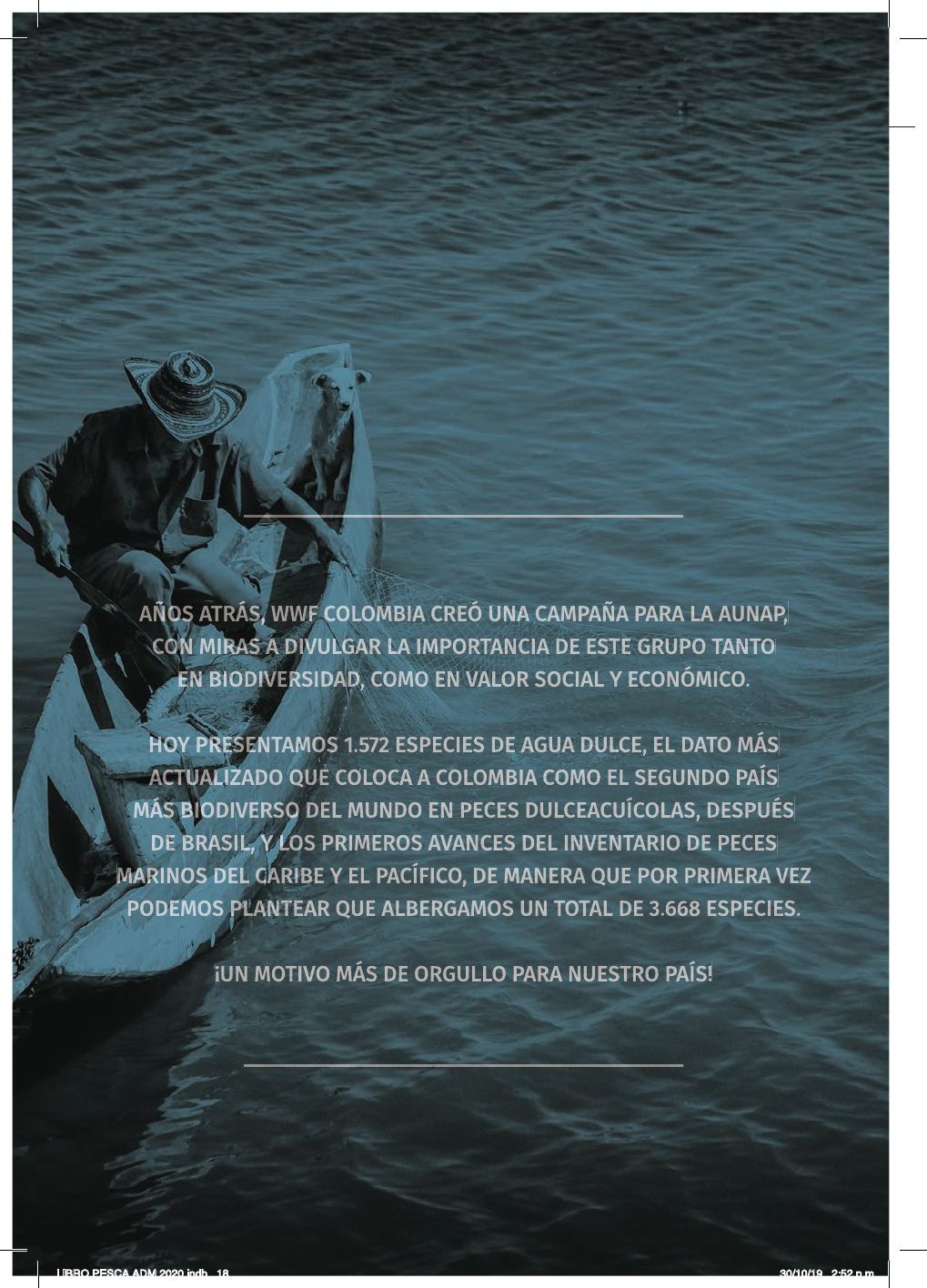 AÑOS ATRÁS, WWF COLOMBIA CREÓ UNA CAMPAÑA PARA LA AUNAP, CON MIRAS A DIVULGAR LA IMPORTANCIA DE ESTE GRUPO TANTO EN BIODIVERSIDAD, COMO EN VALOR SOCIAL Y ECONÓMICO. HOY PRESENTAMOS 1.572 ESPECIES DE AGUA DULCE, EL DATO MÁS ACTUALIZADO QUE COLOCA A COLOMBIA COMO EL SEGUNDO PAÍS MÁS BIODIVERSO DEL MUNDO EN PECES DULCEACUÍCOLAS, DESPUÉS DE BRASIL, Y LOS PRIMEROS AVANCES DEL INVENTARIO DE PECES MARINOS DEL CARIBE Y EL PACÍFICO, DE MANERA QUE POR PRIMERA VEZ PODEMOS PLANTEAR QUE ALBERGAMOS UN TOTAL DE 3.668 ESPECIES. ¡UN MOTIVO MÁS DE ORGULLO PARA NUESTRO PAÍS! Colombia, país de peces Be rn ar do d el C ris to H er ná nd ez S ie rr a LIBRO PESCA ADM 2020.indb 18 30/10/19 2:52 p.m. 19Colombia, país de peces Be rn ar do d el C ris to H er ná nd ez S ie rr a Javier A. Maldonado Ocampo Ph.D. Profesor Pontifi cia Universidad Javeriana (q. e. p. d.) Carlos DoNascimiento Ph.D. Curador Colección de Peces de agua dulce del Instituto de Investigación de Recursos Biológicos Alexander von Humboldt -IAvH José Saulo Usma Oviedo M.Sc. Especialista Agua Dulce, WWF Colombia Edgar Esteban Herrera Collazos M.Sc. Investigador Pontifi cia Universidad Javeriana Jorge Enrique García Melo Ph.D. profesor Facultad de Ciencias Naturales y Matemáticas, Universidad de Ibagué Biodiversidad de los peces de agua dulce en Colombia EN LOS RÍOS DE NUESTRO PAÍS HAY 1.572 ESPECIES DE PECES, UNA RIQUEZA QUE SE VE AMENAZADA POR DEFORESTACIÓN, CONTAMINACIÓN Y MINERÍA. LA CUENCA MAGDALENA-CAUCA POSEE EL MAYOR NÚMERO DE ESPECIES AMENAZADAS Y ENDÉMICAS. Jo rg e Ga rc ía LIBRO PESCA ADM 2020.indb 19 30/10/19 2:52 p.m. Ageneiosus pardalis Potamotrygon magdalenae Prochilodus magdalenae Pimelodus grosskopfi i Achirus novoae Osteoglossum ferreirai Apistogramma alacrina 20 LA PESCA Y LA ACUICULTURA EN COLOMBIA: DEL AGUA A LA MESA Figura 1. Registros de peces en colecciones nacionales. Fotos: Jorge García LIBRO PESCA ADM 2020.indb 20 30/10/19 2:53 p.m. 21Colombia, país de peces La importancia de las pesquerías continentales de Colombia tradicionalmente ha sido opacada por las pesquerías industriales marinas, debido a varios factores como la falta de estudios biológicos sobre la riqueza de peces dulceacuícolas, un sistema de información pesquero y un análisis sobre su contribución económica y social a la seguridad alimentaria de poblaciones locales vulnerables. En los últimos 20 años varias iniciativas han con- tribuido a llenar estos vacíos de información, con el incremento y alcance geográfi co de las exploraciones ictiológicas nacionales, la identifi cación y publicación de los registros de las colecciones biológicas y la reactivación en el 2012 del Sepec -Servicio Estadístico Pesquero Colombiano (creado mediante la Ley 13 de 1990); que reúne las estadísticas pesqueras nacio- nales a través de una plataforma digital, accesible públicamente: http://sepec.aunap.gov.co. Colombia registra una riqueza de 1.572 especies dulceacuícolas (DoNascimiento et al. 2019), que se distribuye en las cinco zonas hidrográfi cas del Ideam (Figura 1), destacándose los registros en las áreas protegidas nacionales (Tabla 1). Con relación a la riqueza de especies de Colombia, 392 son endémicas, es decir, sólo se encuentran en nuestro país; el 30% son comerciales (106 especies de consumo y 351 ornamentales) y 106 especies son migratorias (DoNascimiento et al. 2019, Ortega-Lara 2016, Usma et al. 2013, Lasso et al. 2011). La zona hidrográfi ca Magdalena-Cauca posee el mayor número de especies endémicas (186) y amenazadas (41), debido a la deforestación, erosión, sedimentación, contaminación por aguas residuales e industriales y desecación de humedales (Galvis & Mojica 2007, Mojica et al. 2012, Jiménez-Segura et al. 2016). En la década de los setenta la cuenca aportaba entre el 77% y 95% de la pesca continental y respecto a la pesca nacional pasó de 69% al 18% en 2009 (Gutiérrez-Bonilla et al. 2011a). En el 2018, la sostenibilidad del recurso estuvo comprometida por la pesca de juveniles de Prochilodus magdalenae, Pseudoplatystoma magdaleniatum y Caquetaia kraussii (Duarte et al. 2018). La zona hidrográfi ca Amazonas tiene el mayor número de peces comerciales aunque su pesca se basa en 30 especies, especialmente bagres y caráci- dos (Agudelo-Córdoba et al. 2011). La cuenca presenta problemas de deforestación y minería ilegal de oro que incrementan la sedimentación y contaminación por mercurio de sus ríos, peces y personas. Las captu- ras de juveniles de Brachyplatystoma platynemum, Brycon amazonicus y Prochilodus nigricans, hacen ur- gente controlar el incremento del esfuerzo pesquero y en los ríos fronterizos, la armonización de las normas pesqueras con los países vecinos (Agudelo-Córdoba et al. 2011, Duarte et al. 2018). La zona hidrográfi ca Orinoco con 298 especies comerciales, 68 endémicas y 21 amenazadas, es una zona clave para la economía nacional, pero enfrenta amenazas por la desecación de humedales, el cambio de coberturas vegetales por cultivos de arroz, palma, caña de azúcar, pastos y plantaciones forestales. Entre 1995 y 2009, los desembarcos anuales variaron entre Jo rg e Ga rc ía LIBRO PESCA ADM 2020.indb 21 30/10/19 2:53 p.m. 22 LA PESCA Y LA ACUICULTURA EN COLOMBIA: DEL AGUA A LA MESA 7.742 t y 1.024 t (Ramírez-Gil & Ajiaco-Martínez 2011), mientras que en 2018, las capturas de Brachyplatysto- ma juruense y Zungaro zungaro sugieren la revisión de la talla mínima de captura y disminuir la presión sobre los juveniles de Prochilodus mariae (Duarte et al. 2018). La zona hidrográfi ca Caribe tiene 28 especies amenazadas, 93 endémicas y 53 comerciales. Desde el 2011 se registró que las tallas de captura de Prochilo- dus magdalenae y Sorubim cuspicaudus en el río Sinú, estaban por debajo de la talla de madurez haciendo Zona hidrográfi ca Riqueza de especies No. especies endémicas No. especies amenazadas No. especies comerciales No. especies áreas pro