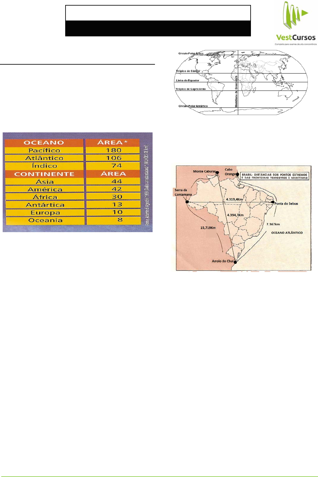 CURSO ANUAL DE GEOGRAFIA I Prof. Fernandes Epitácio VestCursos – Especialista em Preparação para Vestibulares de Alta Concorrência BRASIL: A CONSTRUÇÃO DO TERRITÓRIO NACIONAL TERRITÓRIO ATUAL E POVOAMENTO O globo terrestre possui aproximadamente 510 milhões de Quilômetros quadrados, dentre os quais três quartos (70,7%) constituídos por oceanos e mares - para efeito de estudo podemos considerar três: Pacífico, Atlântico e Índico. O restante, ou seja, as áreas continentais constituem as terras emersas divididas em cinco continentes e algumas ilhas - divididas em seis continentes: Americano, Europeu, Asiático, Africano, Oceania e Antártica. Com território de 8.514.876 km², o Brasil é considerado um país- continente. De fato, sua extensão territorial é das maiores do mundo (quinto lugar) e inclui-se entre os seis países que possuem mais de 7 milhões de quilômetros quadrados. Em relação à América do Sul, o Brasil representa 47% da área do continente e ocupa a porção centro-oriental da América do Sul fazendo fronteira com todos os países da região exceto Equador e Chile, com Bolívia e Peru apresentando maior fronteira com o nosso país e o Suriname e Uruguai a menor. POSIÇÃO ASTRONÔMICA Com base na análise do mapa, verificamos que o Brasil apresenta: • 93% das terras no Hemisfério Meridional ou Sul- a linha do Equador corta o Estado de Roraima, Amapá, Amazonas e Pará; • Possui terras na Zona Tropical (92%) e na Zona Temperada do Sul (8%)- a linha do Trópico de Capricórnio atravessa o Estado de Mato Grosso do Sul, São Paulo e Paraná, sendo a cidade de São Paulo a única capital cortada pelo Paralelo. Com relação ao fator Longitude percebe-se que o País encontra-se totalmente a Oeste de Greenwich, ou seja, no hemisfério Ocidental, possuindo, portanto 4 fusos horários - todos atrasados em relação a Greenwich. A expressão país-continente advém do fato de a área da Austrália – que praticamente engloba o menor de todos os continentes, a Oceania – ser de cerca de 7,6 milhões de quilômetros quadrados. Todas as áreas com tamanho igual ou superior ao da Austrália são considerados continentes, e as que têm tamanhos menores são ilhas. Para ter uma ideia desse imenso tamanho, podemos lembrar que toda a Europa, a ocidental e a oriental (excluindo a parte europeia da Rússia), onde existem atualmente 45 Estados independentes, possui apenas cerca de 5,2 milhões de quilômetros quadrados. O território brasileiro atual tem 7 367 km de contorno marítimo (o litoral com o oceano Atlântico) e 15 719 km de contorno terrestre, de fronteiras com os nossos vizinhos sul-americanos. Quase todos os países desse subcontinente, as exceções são Equador e Chile, possuem fronteiras com o Brasil. Os últimos acertos importantes para delimitar esse contorno terrestre foram realizados no final do século XIX (1895, 1900) e no início do século XX (1903-1904). Alguns estados do Brasil – como Amazonas, Pará, Mato Grosso e Minas Gerais – possuem, cada um, uma área territorial superior à de muitos países europeus reunidos. Se observarmos um mapa de densidade demográfica ou povoamento do Brasil, poderemos notar que a população se concentra no litoral ou, melhor, em uma estreita faixa de terra que vai do oceano Atlântico até cerca de 150 km para o interior. As cidades mais populosas se localizam nessa faixa: São Paulo, Rio de Janeiro, Salvador, Recife, Porto Alegre, Curitiba, Fortaleza, Belém, entre outras. As exceções – grandes áreas metropolitanas com mais de 1 milhão de habitantes situadas a mais de 150 km do litoral – são Belo Horizonte, Brasília-Goiânia e Manaus. A regra geral é a concentração litorânea, principalmente próxima ao litoral do Nordeste oriental (Zona da Mata nordestina) e no Sudeste (entre São Paulo e Rio de Janeiro). A parte ocidental do país, principalmente a Amazônia, ainda permanece com baixas densidades demográficas, embora isso venha se alterando nas últimas décadas com o deslocamento de contingentes populacionais do Sudeste, do Nordeste e do Sul do país para a Amazônia e principalmente para Mato Grosso, Rondônia e Roraima. CONSTRUÇÃO DO BRASIL Como se sabe, era muito comum a ideia de “descobrimento” do Brasil. Seria como se ele já estivesse “pronto” e faltasse somente 64 VestCursos – Especialista em Preparação para Vestibulares de Alta Concorrência CURSO ANUAL DE GEOGRAFIA – (Prof. Fernandes Epitácio) alguém, um navegador português, encontrá-lo. Mas se o Brasil somos nós – o povo, a sociedade ou a nação brasileira, com sua cultura, o seu território e as suas instituições -, então ele ainda não existia em 1500. O que havia era um espaço físico habitado por inúmeras sociedades indígenas, cada uma com um território diferente. O Brasil foi, assim, uma construção na qual os colonizadores portugueses se apropriaram de certas áreas, geralmente expulsando, às vezes escravizando ou exterminando os indígenas que as ocupavam; com o tempo, expandiram o seu território e criaram neste novo mundo uma sociedade diferente, que um dia se tornou um Estado-Nação independente. Essa construção do Brasil durou vários séculos e teve dois aspectos principais: a formação territorial, isto é, a forma de ocupação da terra e a sua delimitação por meio de fronteiras; e a criação de uma sociedade ou de uma nação com a sua cultura (valores e hábitos) e instituições próprias (especialmente o Estado ou poder público em todos os níveis e esferas). A formação do território brasileiro é um tema que sempre fascinou os estudiosos por causa de alguns aparentes enigmas, expressos nestas interrogações: como chegamos a ter este imenso território, um dos maiores do mundo e o maior da América Latina?; por que as áreas de colonização portuguesa na América deram origem a um só país, o Brasil, enquanto as áreas de colonização espanhola originaram in