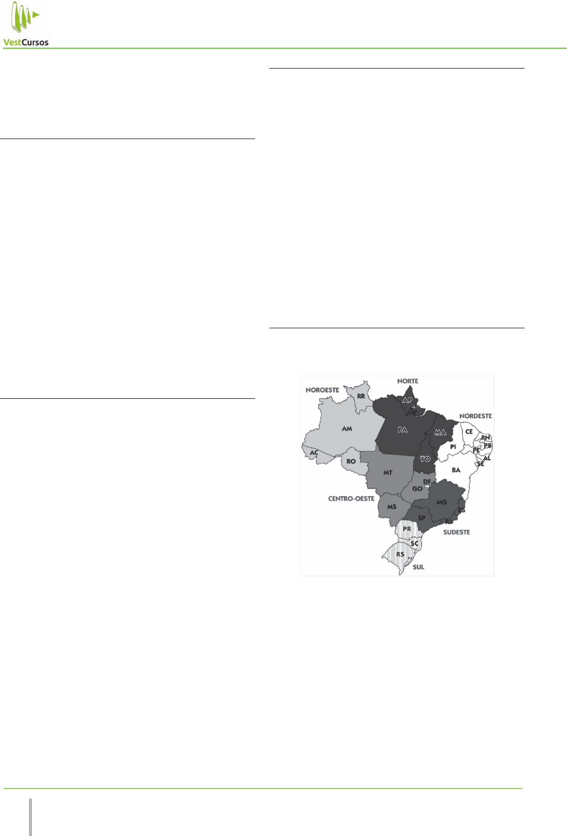 Aula 10 – Regiões do IBGE 99 VestCursos – Especialista em Preparação para Vestibulares de Alta Concorrência c) A criação do Estado de Tocantins, desmembrado dos antigos Estados de Mato Grosso e Goiás e a sua anexação à Região Centro-Oeste. d) A diminuição da extensão territorial da Região Nordeste, com a anexação do Oeste do Maranhão à Amazônia Legal. Questão 06 A divisão do território brasileiro em cinco macrorregiões (Norte, Nordeste, Centro-Oeste, Sudeste e Sul) adotada oficialmente pelo Instituto Brasileiro de Geografia e Estatística (IBGE), baseia-se em critérios político-administrativos que dificultam uma análise mais rigorosa conforme o fenômeno estudado. Sobre as limitações deste tipo de divisão regional, é INCORRETO afirmar: a) Os diversos elementos que caracterizam a região amazônica não terminam nos limites dos estados do Amazonas e Pará com Mato Grosso ou Maranhão, mas adentram por enormes trechos destas últimas unidades da Federação. b) A Divisão Regional do IBGE está muito ligada à organização político-administrativa do país, mas, apesar de apresentar falhas, acaba sendo largamente utilizada. c) Dentro dessa divisão tradicional adotada pelo IBGE o Brasil se encontra organizado político-administrativamente em uma República Federativa com 27 Estados e um Distrito Federal. d) Apesar das limitações dessa divisão regional, ela é bastante utilizada pelos pesquisadores, pois ainda hoje os dados estatísticos levantados pelo IBGE são organizados levando-se em conta essas cinco grandes regiões. Questão 07 Os textos abaixo relacionam-se a momentos distintos da nossa história. ―A integração regional é um instrumento fundamental para que um número cada vez maior de países possa melhorar a sua inserção num mundo globalizado, já que eleva o seu nível de competitividade, aumenta as trocas comerciais, permite o aumento da produtividade, cria condições para um maior crescimento econômico e favorece o aprofundamento dos processos democráticos. A integração regional e a globalização surgem assim como processos complementares e vantajosos. (Declaração de Porto, VIII Cimeira Ibero-Americana, Porto, Portugal, 17 e 18 de outubro de 1998) ―Um considerável número de mercadorias passou a ser produzido no Brasil, substituindo o que não era possível ou era muito caro importar. Foi assim que a crise econômica mundial e o encarecimento das importações levaram o governo Vargas a criar as bases para o crescimento industrial brasileiro. (POMAR, Wladimir. Era Vargas – a modernização conservadora) É correto afirmar que as políticas econômicas mencionadas nos textos são: a) opostas, pois, no primeiro texto, o centro das preocupações são as exportações e, no segundo, as importações. b) semelhantes, uma vez que ambos demonstram uma tendência protecionista. c) diferentes, porque, para o primeiro texto, a questão central é a integração regional e, para o segundo, a política de substituição de importações. d) semelhantes, porque consideram a integração regional necessária ao desenvolvimento econômico. e) opostas, pois, para o primeiro texto, a globalização impede o aprofundamento democrático e, para o segundo, a globalização é geradora da crise econômica. Questão 08 O processo de urbanização brasileira é um caso recente, marcada fundamentalmente nos anos 60 do século XX, apresentando características marcantes ao processo de regionalização brasileira, conforme verificamos na a) disparidade regional do Brasil se torna mais grave com a globalização, que ocasionou uma acelerada industrialização do Sudeste e um retrocesso do Nordeste. b) A divisão regional do Brasil, estabelecida pelo Fundo Monetário Internacional – FMI, foi elaborada com base nos aspectos naturais, sociais e sobretudo econômicos. c) Em decorrência do processo de modernização e dinamização das atividades produtivas do Sudeste, as interrelações das cidades, estabelecidas pelos fluxos de pessoas, mercadorias, capitais e informações, são mais intensas do que nas outras regiões do país. d) Na economia da região nordeste, o agreste ainda se caracteriza pela monocultura de produtos comerciais, voltadas para o mercado externo. e) Na ocupação do território da região sul, os imigrantes europeus ocuparam, apenas, o litoral, não se dirigindo para o interior. Questão 09 Em recente estudo denominado “As regiões brasileiras pós- Tocantins: ensaio para um novo arranjo”, um estudo do CEBRAP defende a criação da região Noroeste, a partir de uma redivisão da atual região Norte. O novo mapa regional do Brasil ficaria assim: (Adaptado de Cebrap, 2007) Em relação à nova proposta e à atual divisão regional, é correto afirmar: a) Observa-se na nova proposta que o estado do Tocantins deixaria de integrar o atual Centro-Oeste. b) A nova região seria uma fusão de atuais estados da região Norte com estados do Centro-Oeste. c) A atual região Norte já contempla uma unidade econômica e política, compondo um espaço regional único e padronizado, tanto no âmbito econômico, como fisiográfico. d) Os critérios para o novo nódulo regional baseiam-se, prioritariamente, em aspectos econômicos, uma vez que os estados da nova região, compõem um vetor regional comum. e) Aspectos físicos seriam preponderantes na nova divisão, separando a região norte entre estados que possuem a formação amazônica, como o Amazonas, daqueles que não a possuem, como o Maranhão. 100 VestCursos – Especialista em Preparação para Vestibulares de Alta Concorrência CURSO ANUAL DE GEOGRAFIA – (Prof. Fernandes Epitacio) Questão 10 O Brasil é uma República Federativa que apresenta muitas desigualdades regionais. Confrontando-se dois aspectos - a igualdade jurídica entre os Estados-membros e as disparidades econômicas entre as regiões - pode-se afirmar que: a) o desequilíbrio econômico regional vem sendo, 