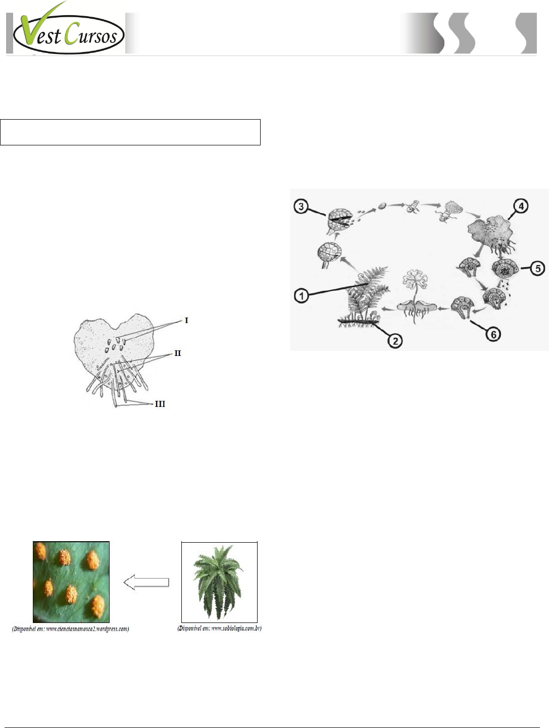 VestCursos – Curso de Biologia – Prof. Landim – www.VestCursos.com.br 31 Curso de Biologia 6. (UECE) As plantas, assim como todos os demais seres vivos, possuem ancestrais aquáticos e desta forma sua história evolutiva encontra-se relacionada à ocupação progressiva do ambiente terrestre. Para que isso pudesse acontecer algumas características foram selecionadas e dentre elas podemos destacar: I. Sistema vascular; II. Esporófito dominante; III. Filoides; IV. Esporófito não ramificado. São características próprias de pteridófitas e briófitas, respectivamente: A) I e II; III e IV. B) I e III; II e IV. C) II e IV; I e III. D) III e IV; I e II. 7. (UERN) No ciclo de vida das pteridófitas, os esporos liberados atingem o solo e podem desenvolver os gametângios, também conhecidos como prótalos. No mesmo indivíduo, os prótalos diferenciam-se em masculinos e femininos sendo, portanto, hermafroditas. A figura representa o prótalo e suas estruturas. Observe. Assinale a afirmativa correta. A) Os arquegônios (II) produzem as oosferas – gametas femininos. B) Os arquegônios (I) produzem os anterozoides – gametas masculinos. C) Na posição II estão os anterídios, que produzem os anterozoides – gametas masculinos. D) Os anterídios estão na posição I, o arquegônio na posição II e os rizoides na posição III. 8. (UERN) As imagens mostram os soros visíveis a olho nu em uma folha de samambaia. Em relação à reprodução das pteridófitas, é incorreto afirmar que A) a sincronia entre a fase do ciclo da planta e a estação úmida do local é importante para que os anterídios, haploides e flagelados atinjam o arquegônio. B) em relação às briófitas, as pteridófitas possuem uma redução da fase gametofítica, sendo conhecida como fase passageira ou efêmera, e a fase esporofítica denomina-se duradoura. C) os soros são agrupamentos de esporângios que se distribuem na face inferior ou na borda dos folíolos; os esporângios são responsáveis pela produção de esporos por meio da meiose. D) o zigoto diploide se divide por mitoses sucessivas, originando o embrião, que será nutrido por substâncias fornecidas pelo gametófito e terá suas células diferenciando-se em raiz, caule e folha. 9. (UPE) Durante o ciclo de vida de uma Pteridófita, encontram-se diversas estruturas morfológicas próprias de cada fase, destacadas pela numeração abaixo. Identifique neste ciclo, estas estruturas e assinale a alternativa correta. A) 1-folíolo, 2-rizoide, 3-esporângio, 4-prótalo, 5-arquegônio, 6- anterídio. B) 1-fronde, 2-rizoma, 3-soro, 4-protonema, 5-arquegônio, 6- anterídio. C) 1-fronde, 2-rizoma, 3-esporângio, 4-prótalo, 5-anterídio, 6- arquegônio. D) 1-filoide, 2-rizoide, 3-caliptra, 4-protonema, 5-gametófito feminino, 6-gametófito masculino. E) 1-fronde, 2-radícula, 3-soro, 4-prótalo, 5-conceptáculo, 6- propágulo. 10. (FUVEST) Um pesquisador que deseje estudar a divisão meiótica em samambaia deve utilizar em preparações microscópicas células de A) embrião recém-formado. B) rizoma da samambaia. C) soros da samambaia. D) rizoides do prótalo. E) estruturas reprodutivas do prótalo. 11. (UNESP) As espécies dos grupos vegetais A e B assemelham- se, pois: crescem preferencialmente em solos úmidos; possuem órgãos de reprodução pouco desenvolvidos; são destituídas de flores, sementes e frutos; dependem da água para a reprodução; reproduzem-se por alternância de gerações. Contudo, as espécies do grupo A são vasculares e as do grupo B, avasculares. Nos grupos A e B, poderiam estar incluídas, respectivamente, A) clorófitas e rodófitas. B) samambaias e avencas. C) musgos e hepáticas. D) musgos e samambaias. E) avencas e hepáticas. VestCursos – Curso de Biologia – Prof. Landim – www.VestCursos.com.br 32 Curso de Biologia 12. (UFV) A figura abaixo corresponde a duas plantas com parte de suas estruturas morfológicas e reprodutivas indicadas por I, II, III e IV. IIIII IV I Observe a representação e assinale a afirmativa correta: A) III corresponde a soros 2n que produzem os esporos nas pteridófitas. B) A estrutura indicada por I é diploide e corresponde ao prótalo. C) II indica os anterozoides haploides produzidos pelo esporângio. D) As duas plantas são vascularizadas e apresentam folhas clorofiladas. E) As estruturas indicadas por IV são gametófitos haploides. 13. (UFJF) Em relação às briófitas, assinale a opção incorreta. A) O pequeno porte das plantas resulta da falta de estruturas rígidas de sustentação e de um sistema de condução de seivas. B) Na maioria dos musgos, o sexo é separado: cada gametófito possui apenas anterídios ou apenas arquegônios. C) A forma mais característica de reprodução é a alternância de gerações, através de um ciclo haplontediplonte, também conhecido como haplodiplobiôntico. D) Após a produção de esporos, o esporófito morre e o gametófito permanece, permitindo afirmar que nas briófitas a fase dominante é a haploide. E) Plantas do filo Hepatophyta (hepáticas) apresentam esporófito cujo contorno assemelha-se a um fígado, e são encontradas em locais úmidos e sombreados. 14. (UFRGS) A figura abaixo apresenta algumas das características compartilhadas por grupos de plantas. Adaptado de: SADAVA et al. Vida: a ciência da biologia. 8. ed. Porto Alegre: Artmed, 2009. As características associadas aos números 1 e 2 representam, respectivamente, a presença de A) esporófito haploide e folhas verdadeiras. B) gametófito haploide e sementes. C) esporófito haploide e estômatos. D) embrião protegido e tecido vascular. E) embrião protegido e sementes. 15. (UFPI) Observe o diagrama abaixo, que representa a distribuição dos grupos de Pteridophyta ao longo do tempo, e analise as afirmativas que se seguem. VestCursos – Curso de Biologia – Prof. Landim – www.VestCursos.com.br 33 Curso de Biologia I. Ao final do Paleozoico, ocorreu a extinção de algun