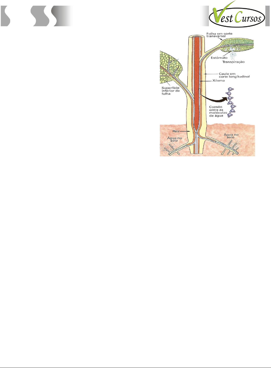 VestCursos – Curso de Biologia – Prof. Landim – www.VestCursos.com.br 126 Curso de Biologia moléculas. O movimento então as continua empurrando tubo acima, formando uma coluna contínua de água. A água para de subir no tubo capilar quando, a força de adesão, torna-se insuficiente para vencer o peso da coluna líquida. A altura que a coluna de líquido atinge depende do diâmetro da capilar. Quanto menor o diâmetro do tubo, mais alta a coluna de água subirá. E vice-versa. Isso acorre porque, quanto mais aumenta o diâmetro do tubo, menos moléculas de água aderem à parede em relação ao número de moléculas que há, naquele volume, para ser arrastadas para cima. Conhecendo-se o diâmetro de um tubo é possível calcular a altura que a coluna de água nele subirá como resultado das forças de capilaridade. Os cientistas calculam que, em um vaso xilemático com cerca de 30 a 50 micrômetros de diâmetro, o fenômeno da capilaridade é suficiente para elevar a coluna de água a pouco mais de 0,5 metro acima do nível do solo. Isso significa que a capilaridade sozinha não é suficiente para a ascensão da seiva bruta até a capa das árvores. Se uma das extremidades de um tubo fino for mergulhada em um recipiente com água, o líquido subirá espontaneamente pelo tubo até uma determinada altura. Esse fenômeno, conhecida como capilaridade, resulta das forças de adesão e de coesão da água. A altura que a coluna de água atinge depende do diâmetro do tubo: quanto mais fino, maior a capilaridade. Pressão positiva ou impulso da raiz As raízes de muitas plantas empurram a seiva bruta para cima, fenômeno conhecido como pressão positiva da raiz. Em certas plantas verificou-se que a pressão positiva da raiz é suficiente para elevar a coluna de água nos vasos xilemáticos a alguns metros de altura. A pressão da raiz é causada pela alta concentração de sais minerais no cilindro central. Os sais que penetram na raiz são continuamente bombeados para dentro do xilema e seu retomo ao córtex por difusão é dificultado pelas estrias de Caspary. A diferença de concentração salina entre o cilindro central e o córtex força a entrada de água por osmose, gerando a pressão que faz a seiva subir pelos vasos xilemáticos. Os cientistas descartam a possibilidade de a pressão positiva da raiz desempenhar um papel muito importante na ascensão da seiva bruta. Além de muitas árvores não apresentarem pressão positiva da raiz, o deslocamento da seiva por esse mecanismo é muito lento, insuficiente para explicar o movimento total de água nas árvores. Tensão-coesão de Dixon A teoria da tensão-coesão, também conhecida como teoria de Dixon, admite que a seiva bruta é puxada desde as raízes até as folhas como resultado da evaporação de água ocorrida nas células foliares. Esquema simplificado da tensão-coesão. O processo seria semelhante ao de sugar líquido através de um canudinho de refresco. A sucção de água exercida pelas folhas puxa a seiva para cima porque esta forma uma coluna líquida contínua dentro dos tubos xilemáticos. Nessa coluna, as moléculas de água se mantêm unidas por forças de coesão à base de pontes de hidrogênio. Ao perderem água por transpiração, as folhas sugam seiva do xilema e toda a coluna líquida se eleva desde a raiz. As raízes, então, absorvem água do solo. A coluna de seiva nos vasos xilemáticos é tensionada, de um lado, pela sucção das folhas, e de outro, pela força da gravidade. A coluna líquida não se rompe devido à coesão entre as moléculas de água. Os tubos xilemáticos, por sua vez, não entram em colapso graças aos reforços de lignina presentes em sua parede. Calcula-se que a tensão criada pela transpiração é suficiente para elevar uma coluna de água dentro de um vaso xilemático a cerca de 160 metros de altura (mais do que as plantas mais altas, com cera de 120 metros de altura). Condução da seiva elaborada Como vimos anteriormente, a água e os sais absorvidos do solo pelas raízes constituem a seiva bruta, que é transportada até as folhas através do xilema. Parte da água que chega às folhas é perdida por transpiração, parte é utilizada nos processos vitais das células, em particular a fotossíntese, e parte irá constituir, juntamente com as substâncias orgânicas fabricadas na folha e alguns sais, a seiva elaborada. Essa seiva é transportada pelo líber ou floema. Fluxo por massa ou fluxo por pressão de Münch Em 1927 o botânico alemão E. Münch propôs uma explicação bastante plausível para o transporte de seiva elaborada, VestCursos – Curso de Biologia – Prof. Landim – www.VestCursos.com.br 127 Curso de Biologia aceita até hoje. Segundo a hipótese de Münch, o transporte da seiva elaborada pelo floema resulta do desequilíbrio osmótico entre as duas extremidades dos vasos condutores. Para testar sua hipótese, Münch desenvolveu um modelo físico semelhante ao que descreveremos a seguir. Um tubo em forma de "U" cujas extremidades são conectadas a bolsas de membrana semipermeável. Na situação inicial, uma das bolsas deve conter uma solução de açúcar e a outra, água pura. Nessa condição, mergulham-se as bolsas na água pura. Estabelece-se osmose na bolsa que contém a solução de açúcar, uma vez que a concentração de solutos no interior da bolsa é maior que a do meio exterior. Através da membrana semipermeável ocorre passagem de água para dentro da bolsa. A pressão de entrada de água determina um fluxo líquido em direção à bolsa com água pura, arrastando moléculas de açúcar pelo tubo que comunica as duas bolsas. A analogia desse modelo com a planta viva é a seguinte: a bolsa com a solução de açúcar representa a extremidade do tubo crivado localizada na folha e a bolsa com água pura representa a extremidade do tubo crivado localizada na raiz ou em outro órgão consumidor de seiva elaborada. O tubo em forma de "U" repre